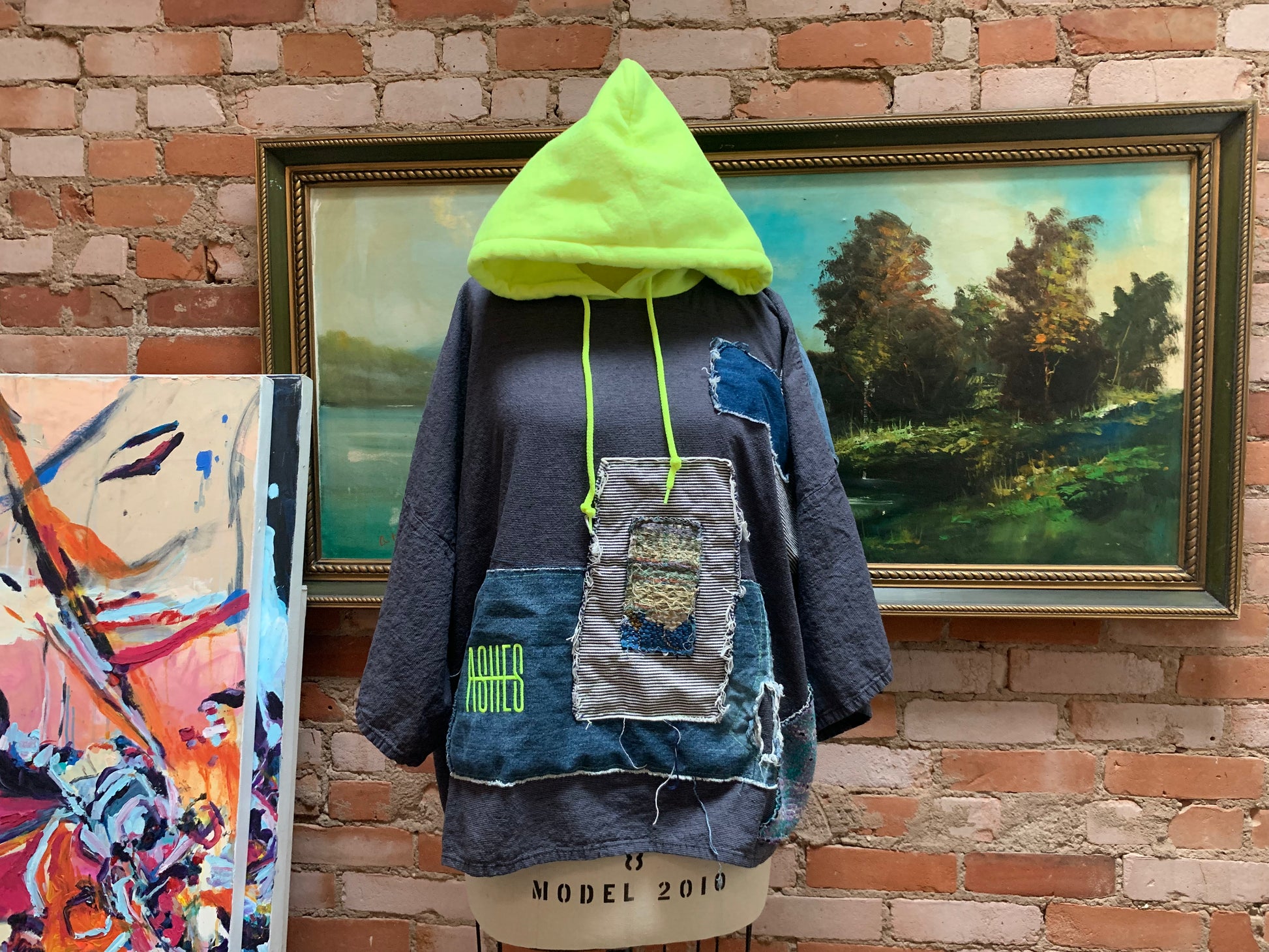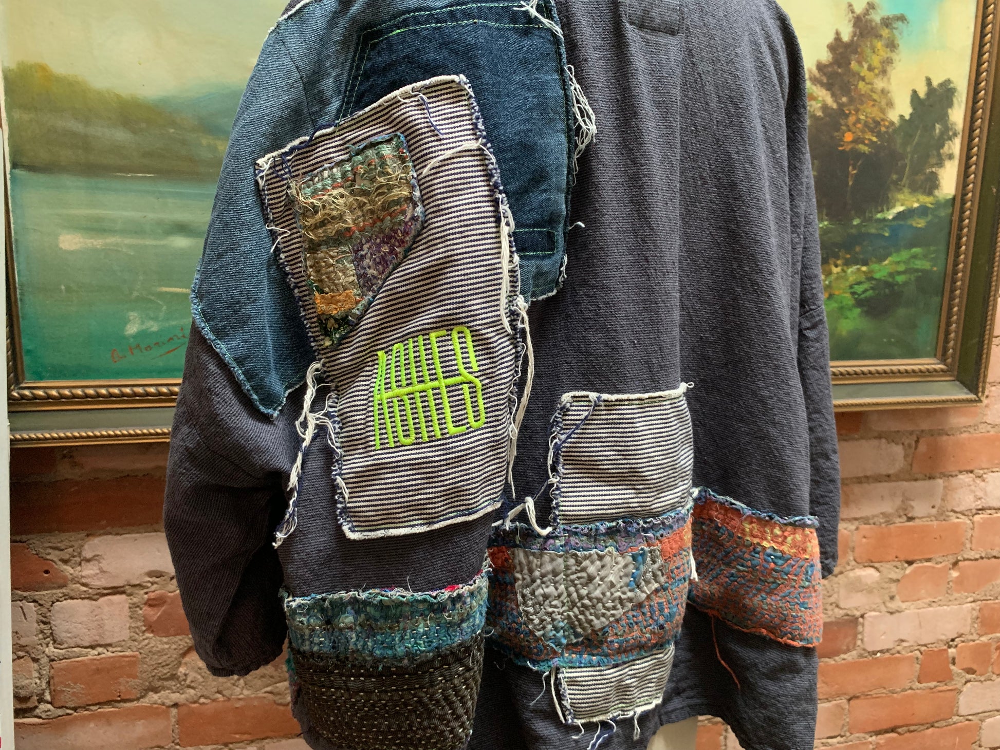 Dark grey pinstriped woven cotton base. Denim and kantha quilt stitched throughout and left raw. Acid ASHES embroidery on front and back. ACID hood upcycled from a sweater. ONE OF A KIND.