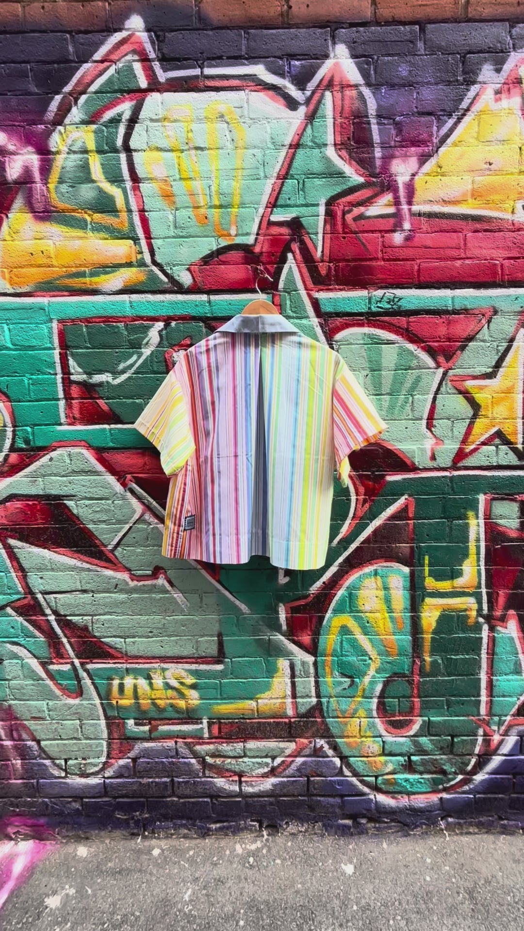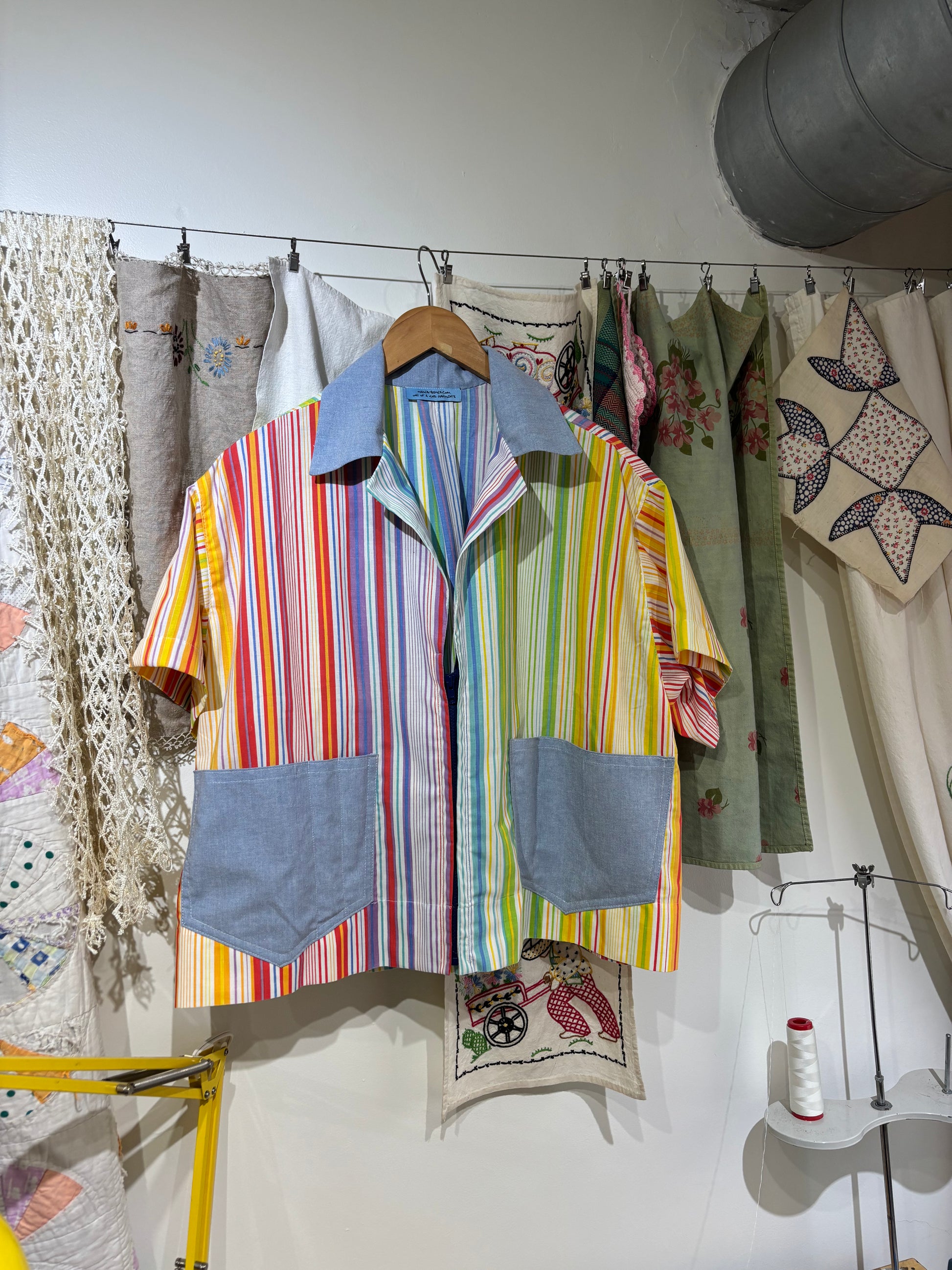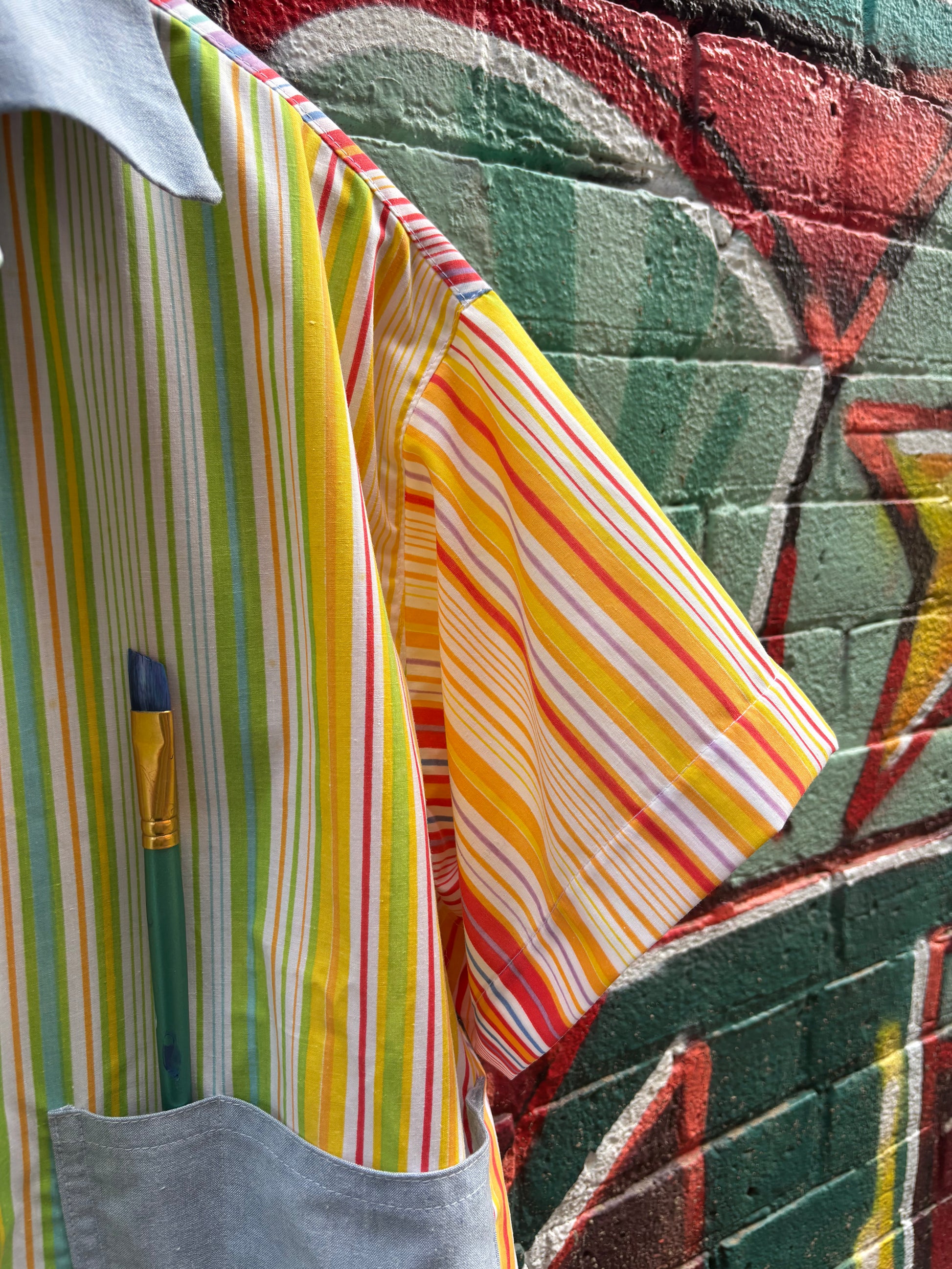 Cotton upcycled pinstriped rainbow sheets in perfect condition. Pleat down center back for additional comfort and movement. Cropped length with patch pockets on front that can hold your paintbrushes.