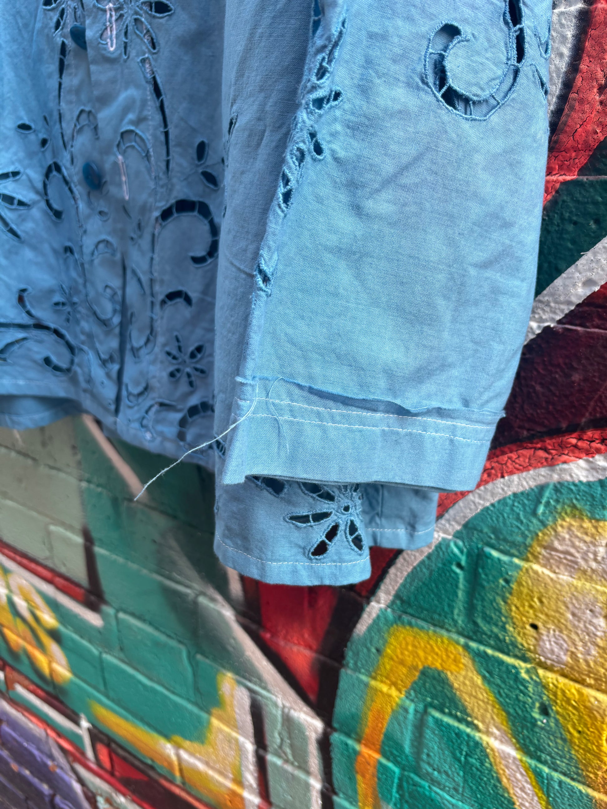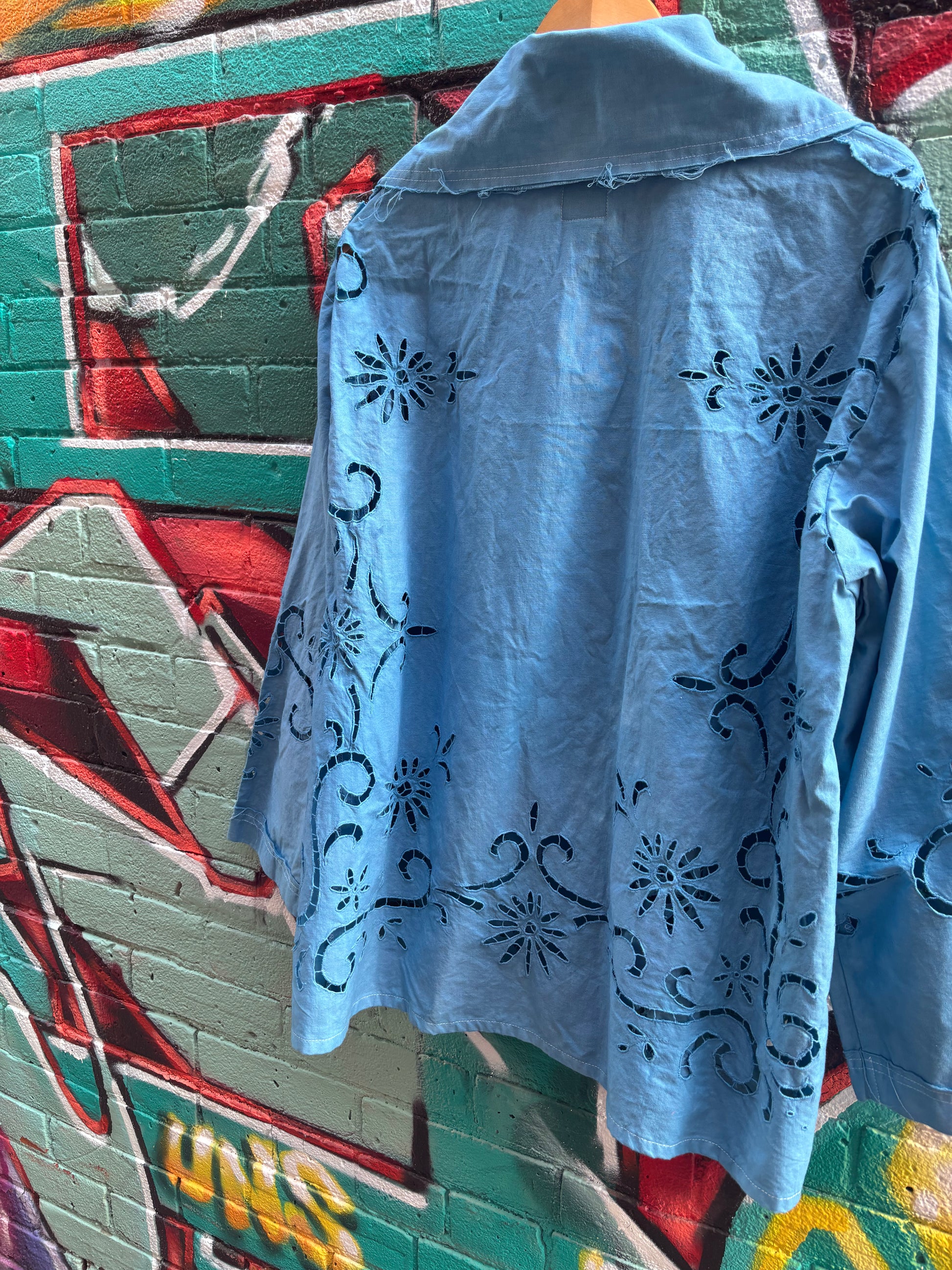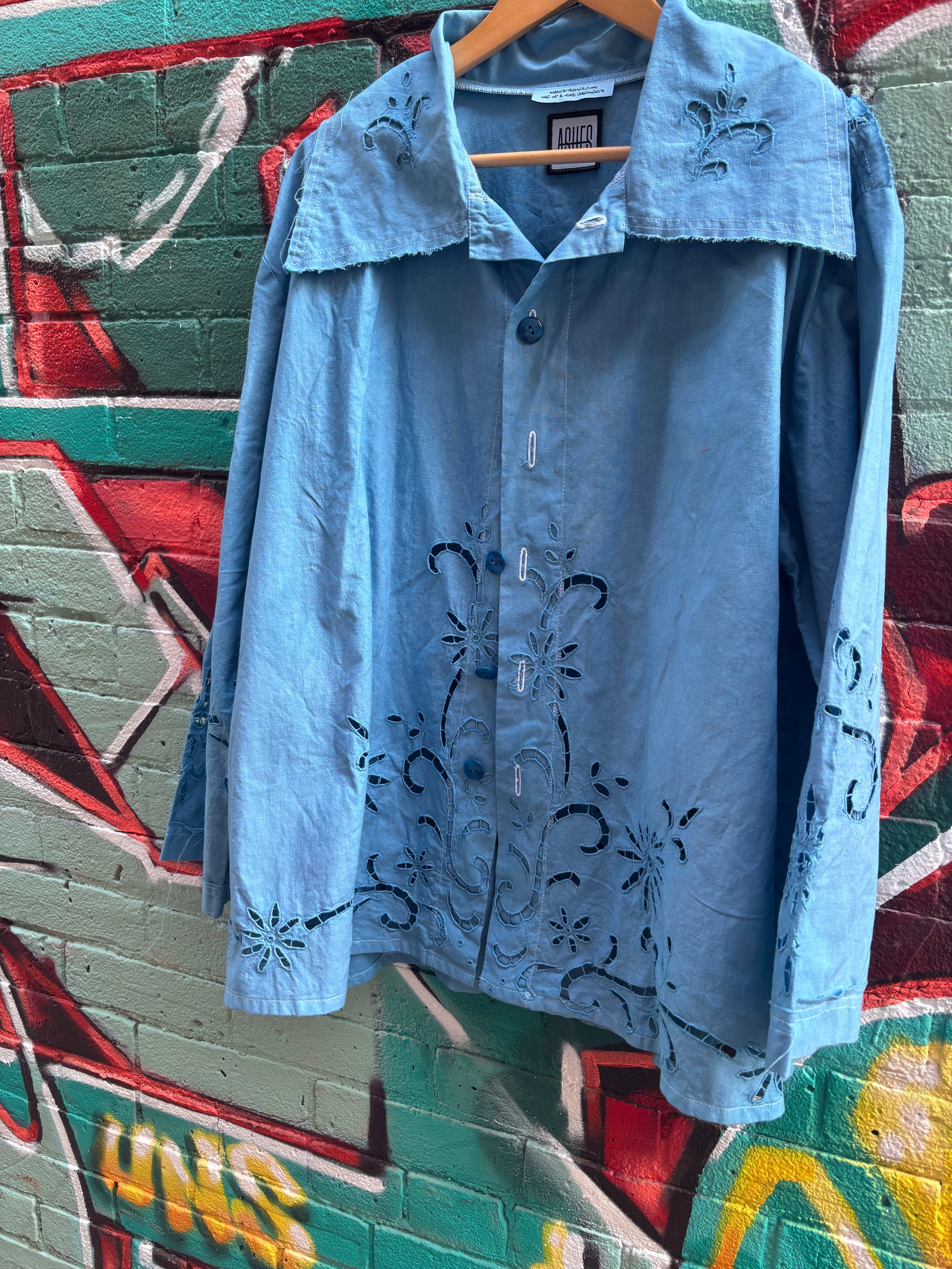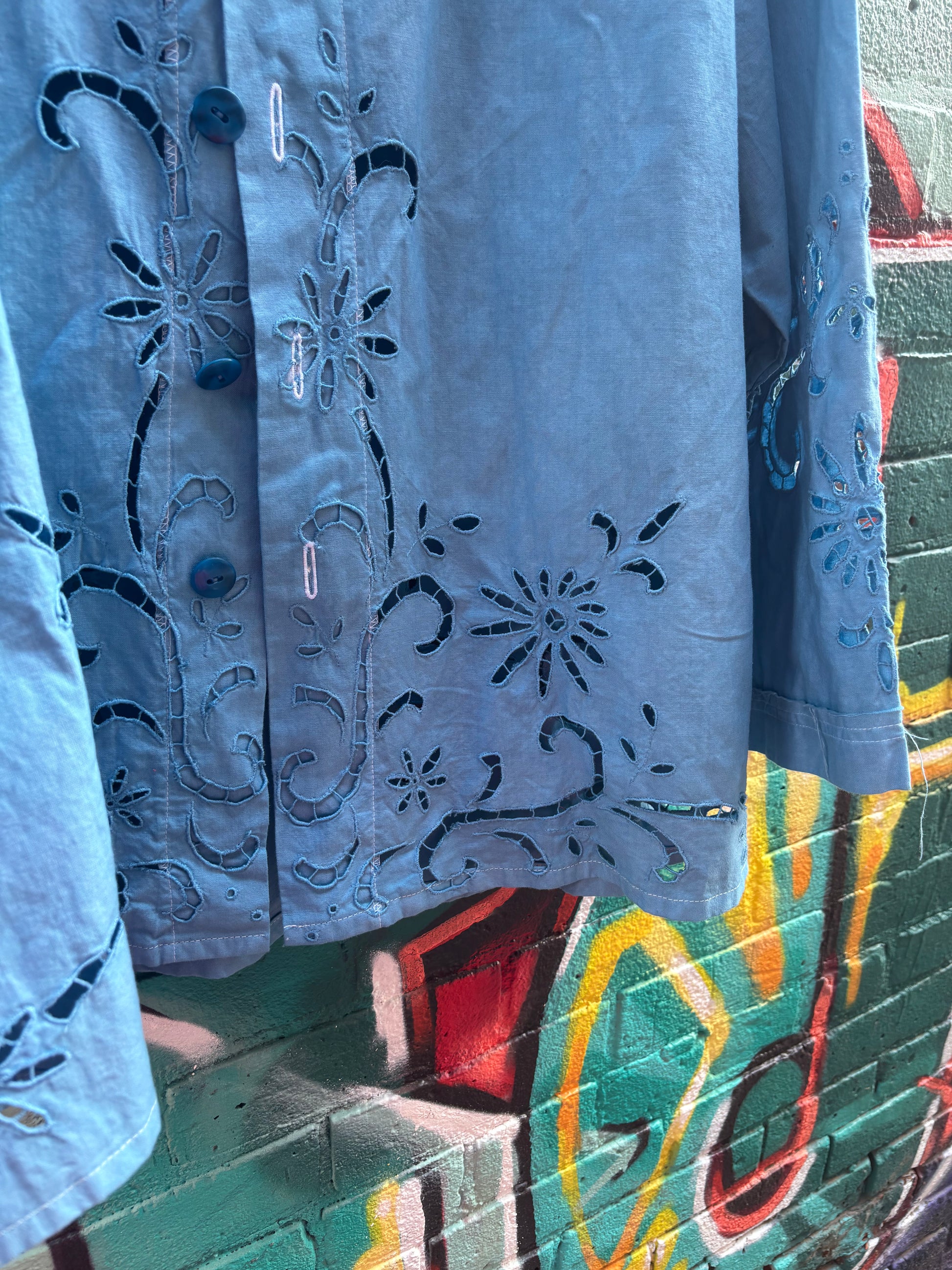 Soft summer jacket. Cut and sewn from a beautiful cotton upcycled tablecloth. Hand dyed a bright shade of blue. Button closure down front. Perfect final lightweight layer on a sunny day.