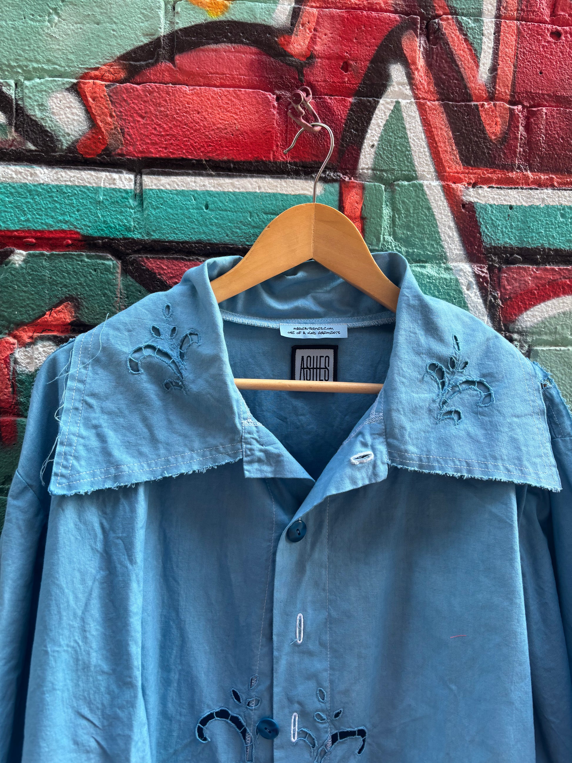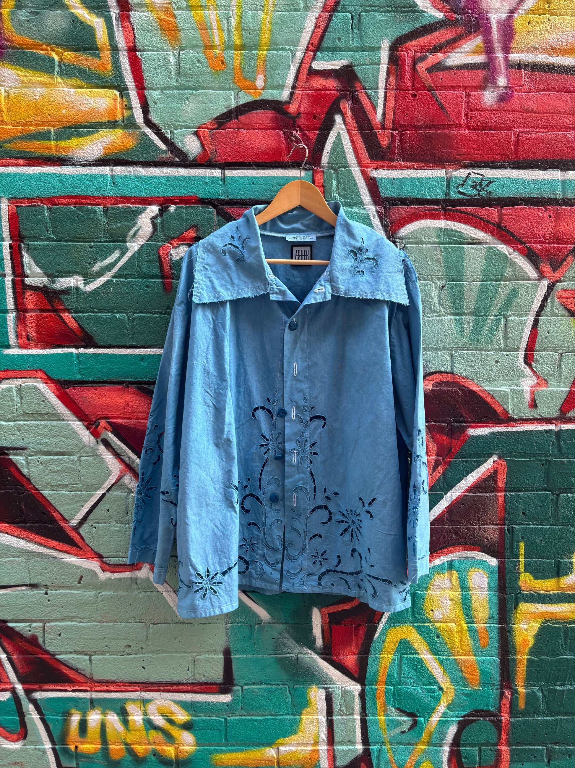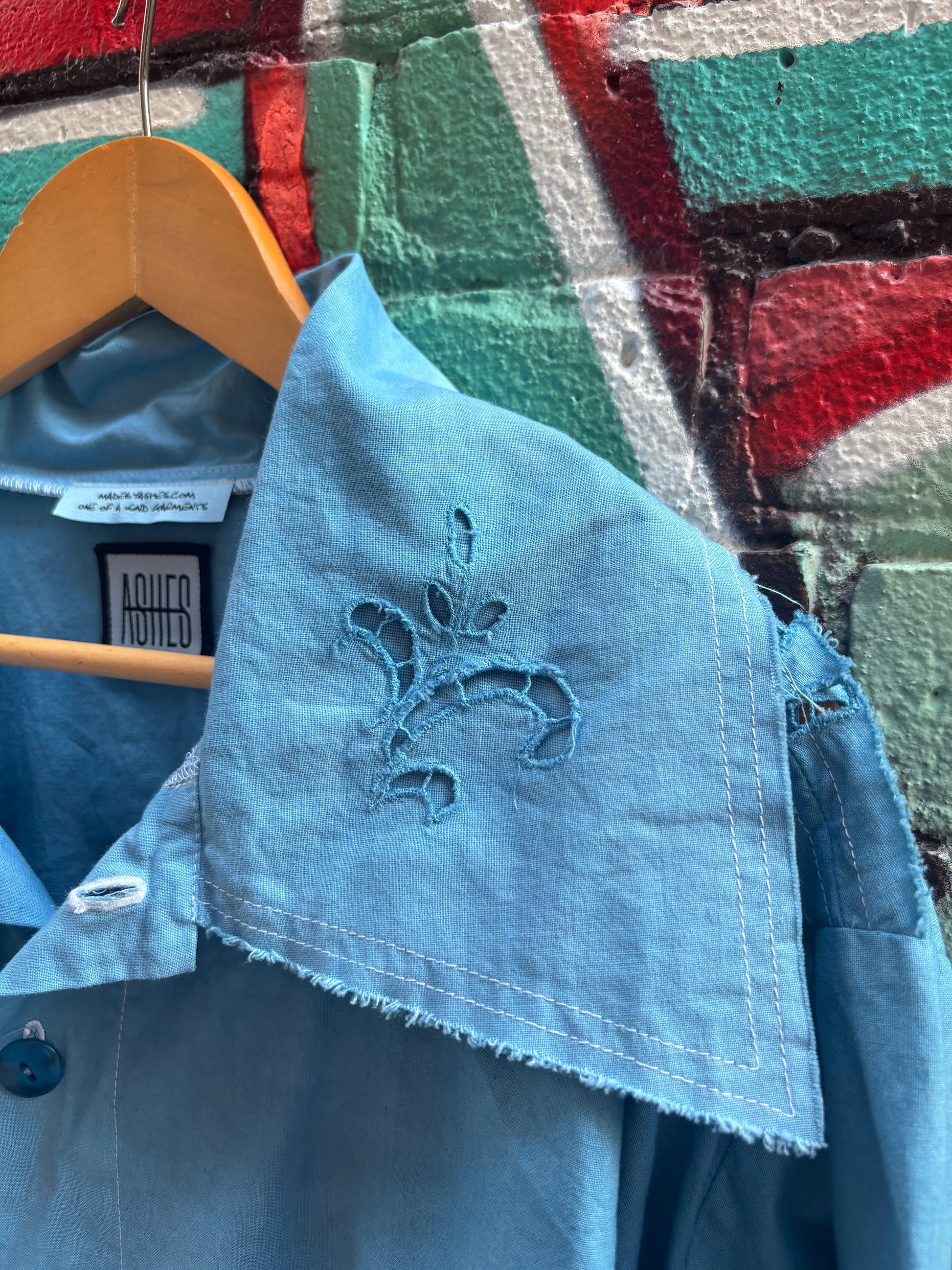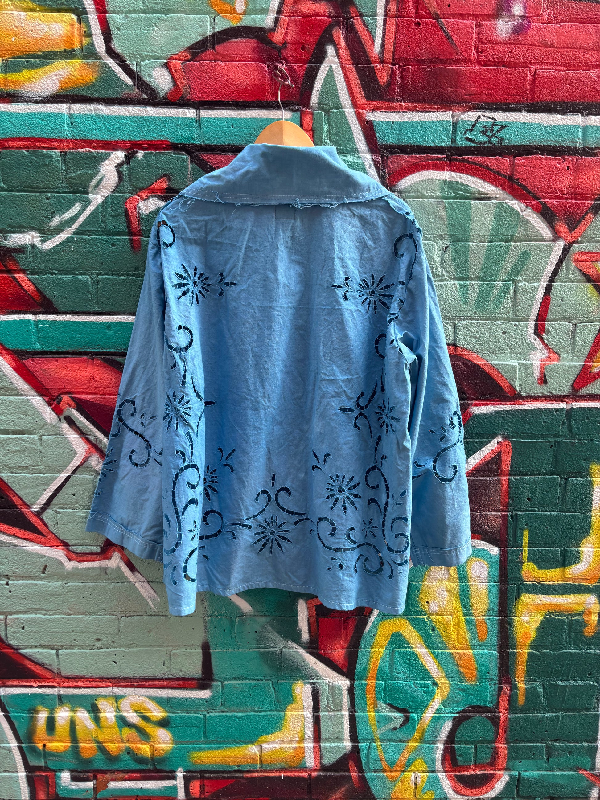 Soft summer jacket. Cut and sewn from a beautiful cotton upcycled tablecloth. Hand dyed a bright shade of blue. Button closure down front. Perfect final lightweight layer on a sunny day.
