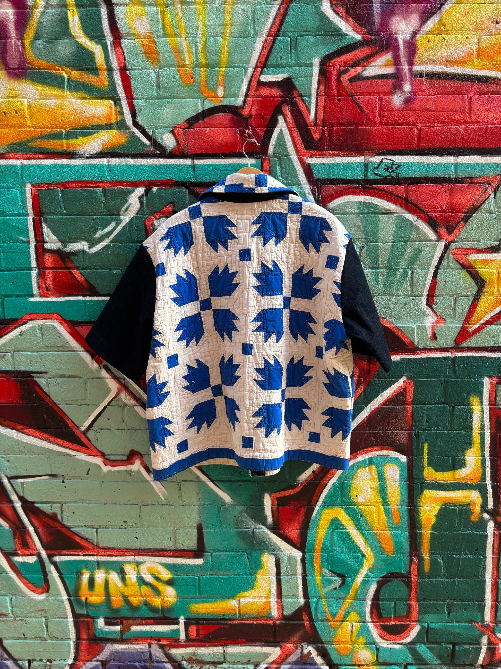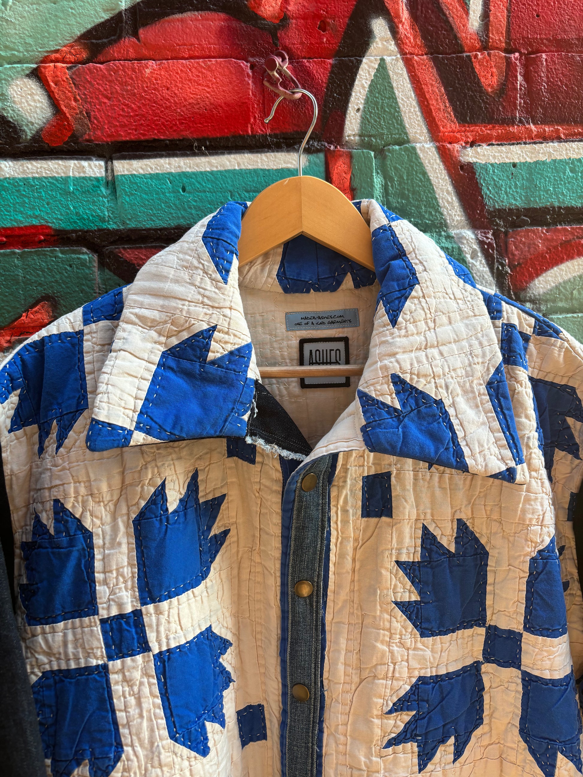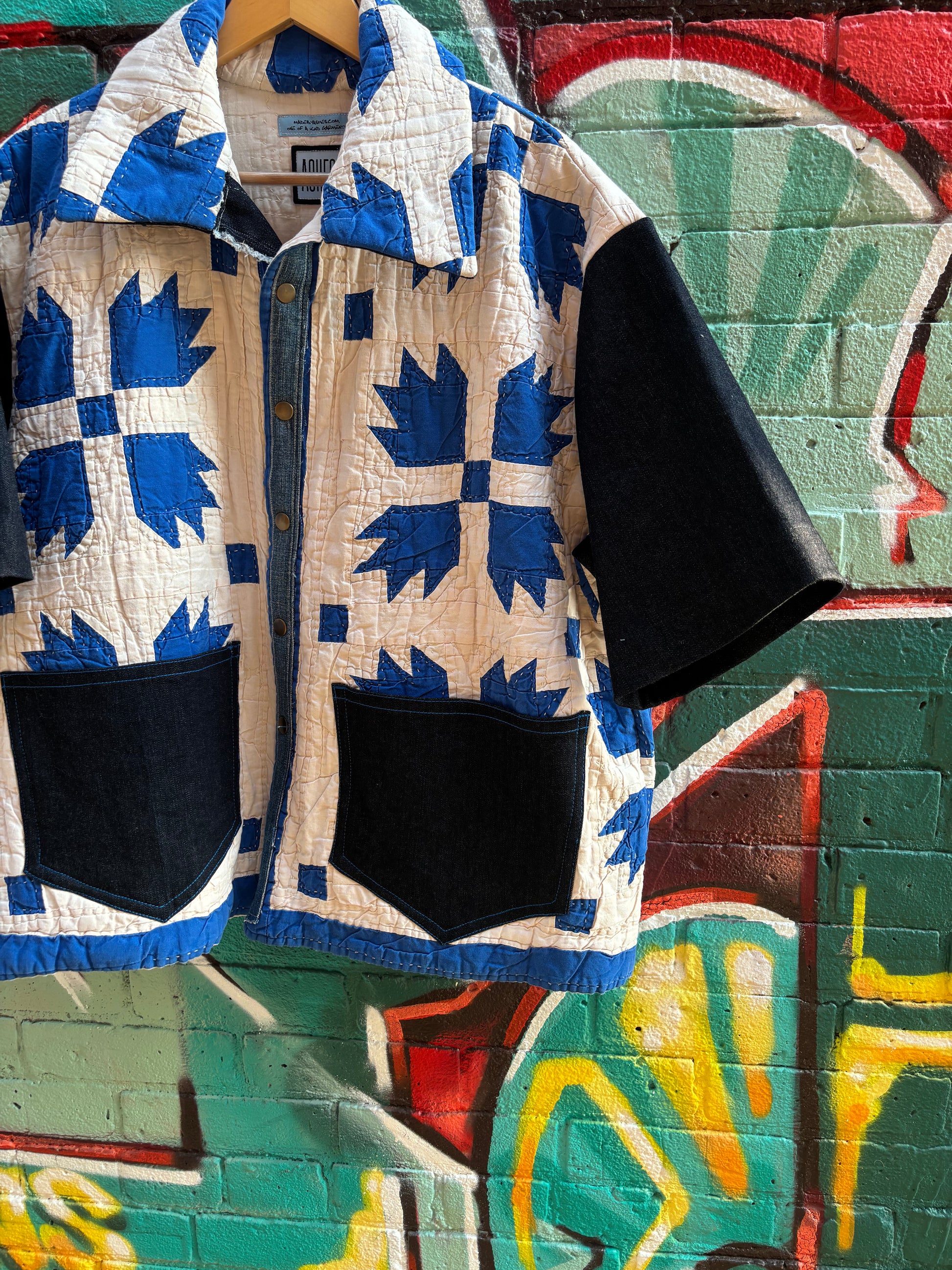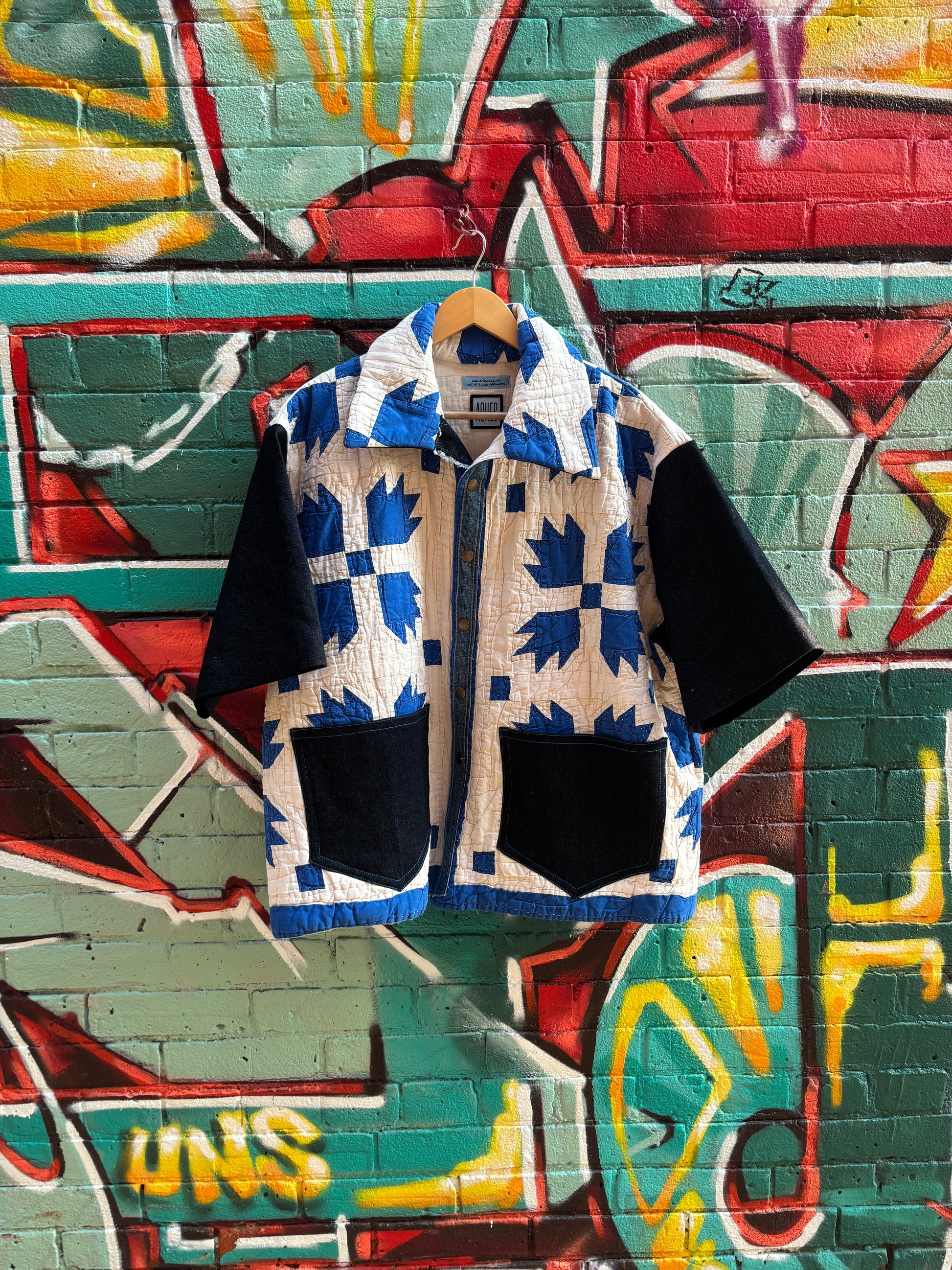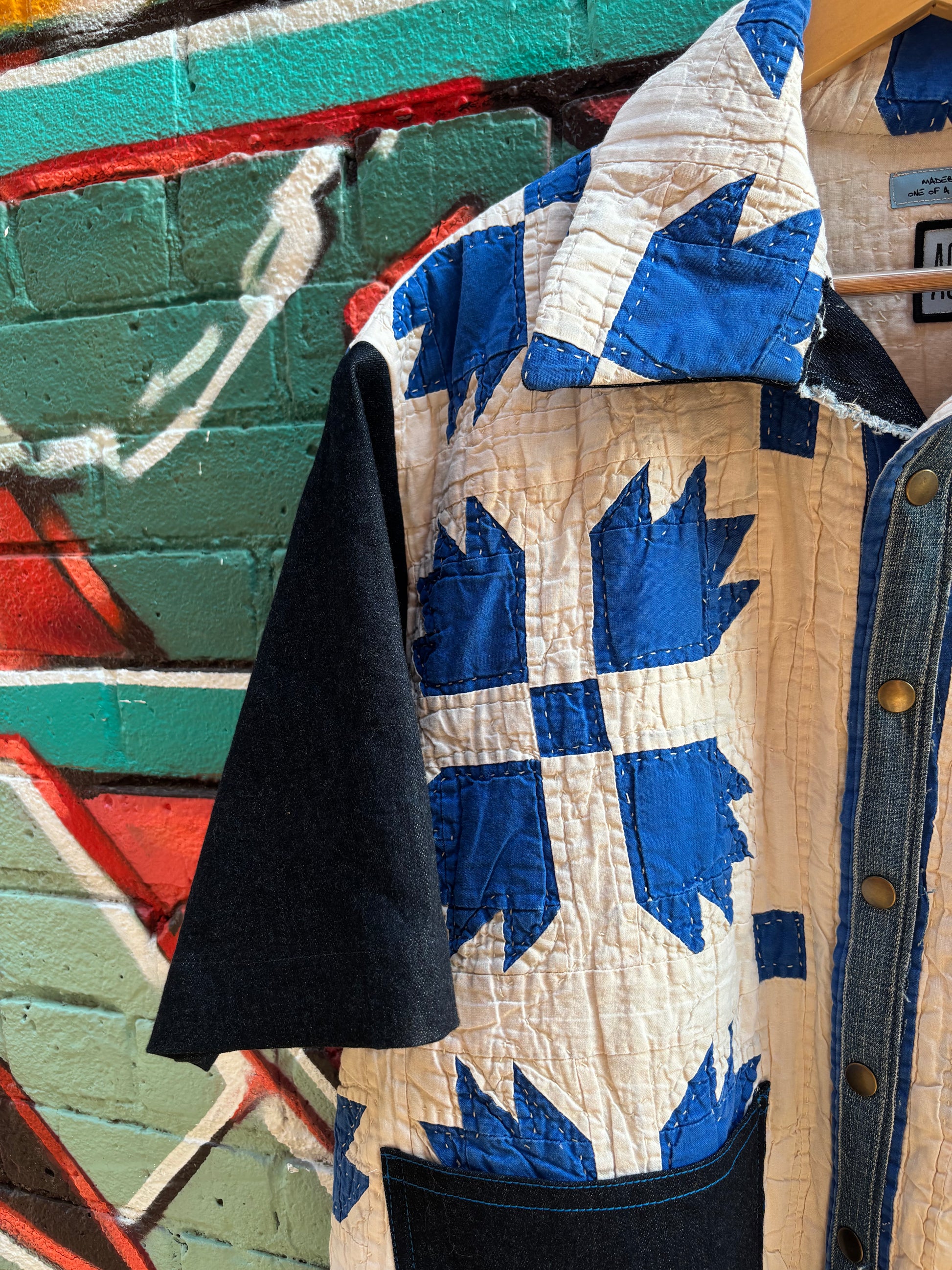 Blue & Ecru upcycled quilt with denim sleeves and pocket detail.