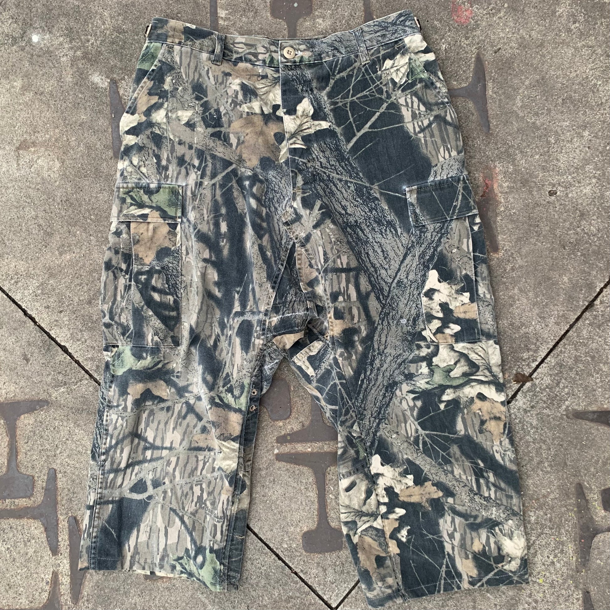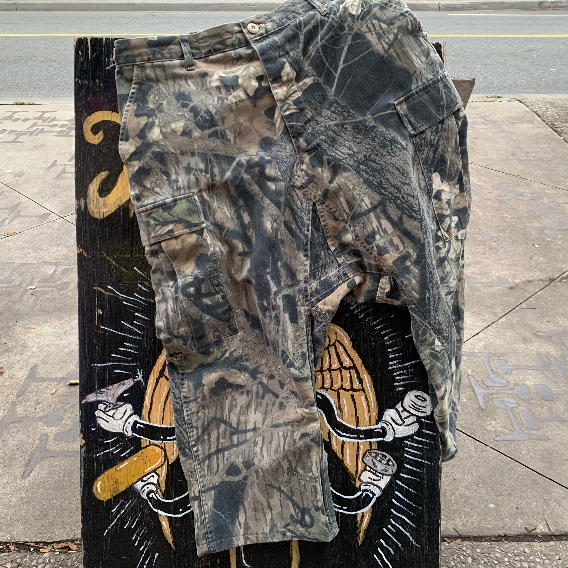 Camo hunting pants MODIFIED & REWORKED by ASHES. Comfortable drop crotch pants with raw edges to encapsulate the already loved and worn in look.