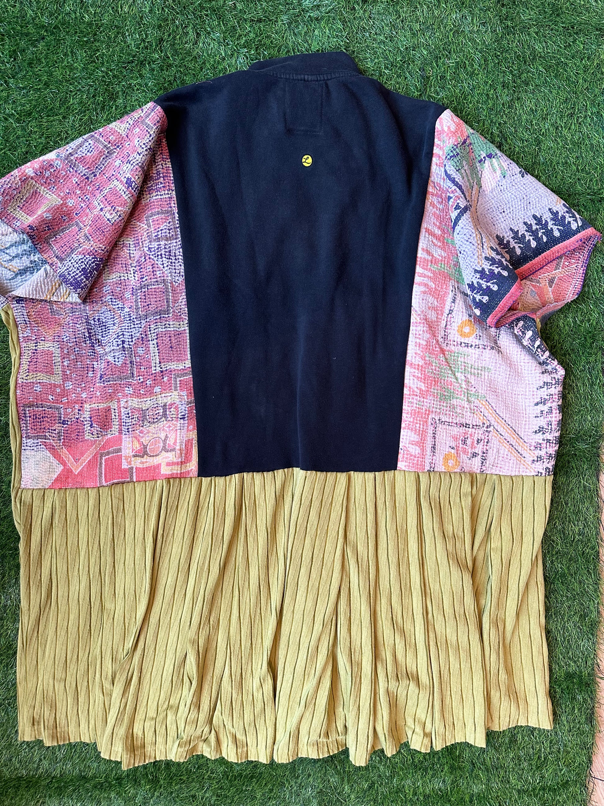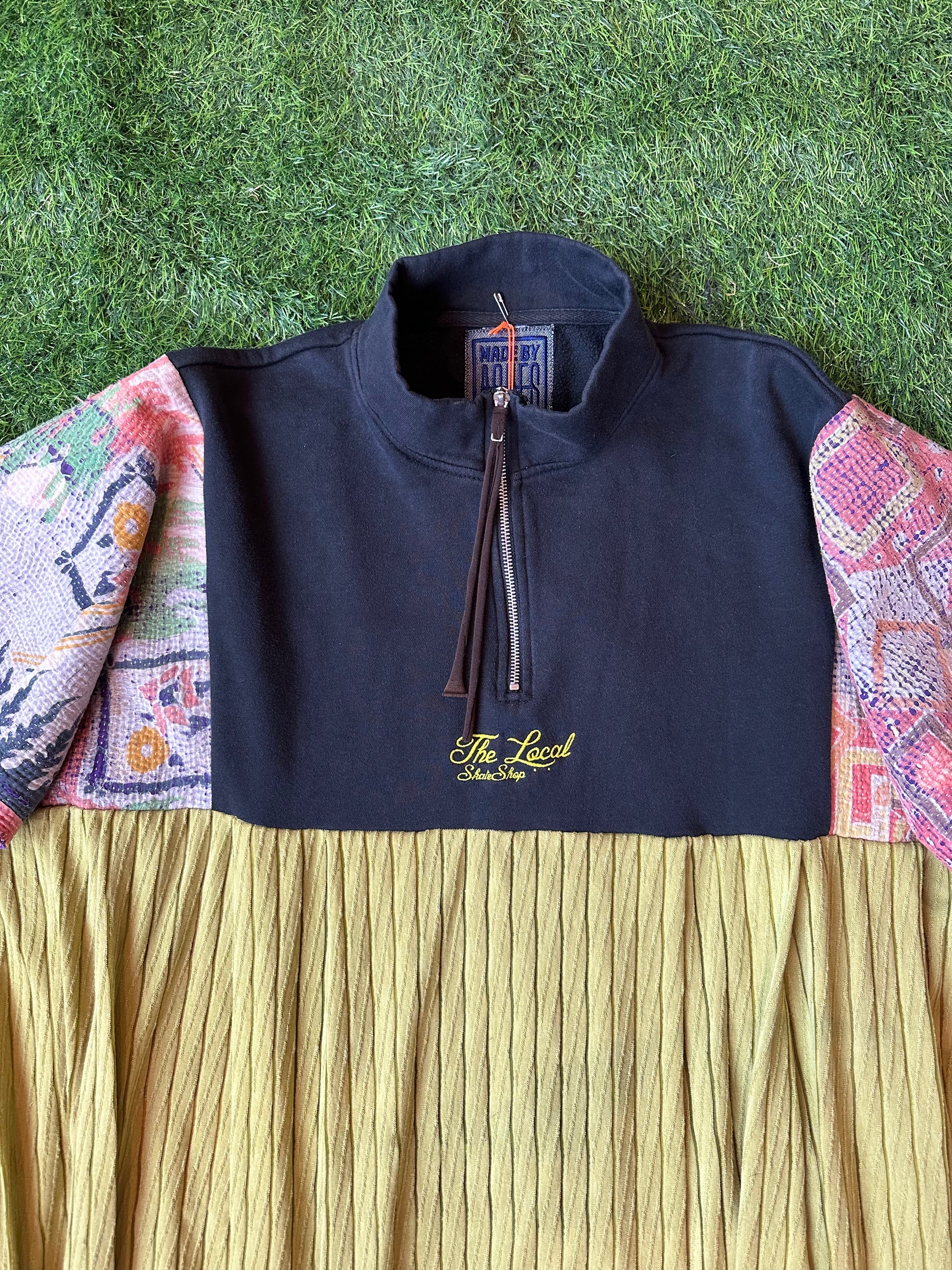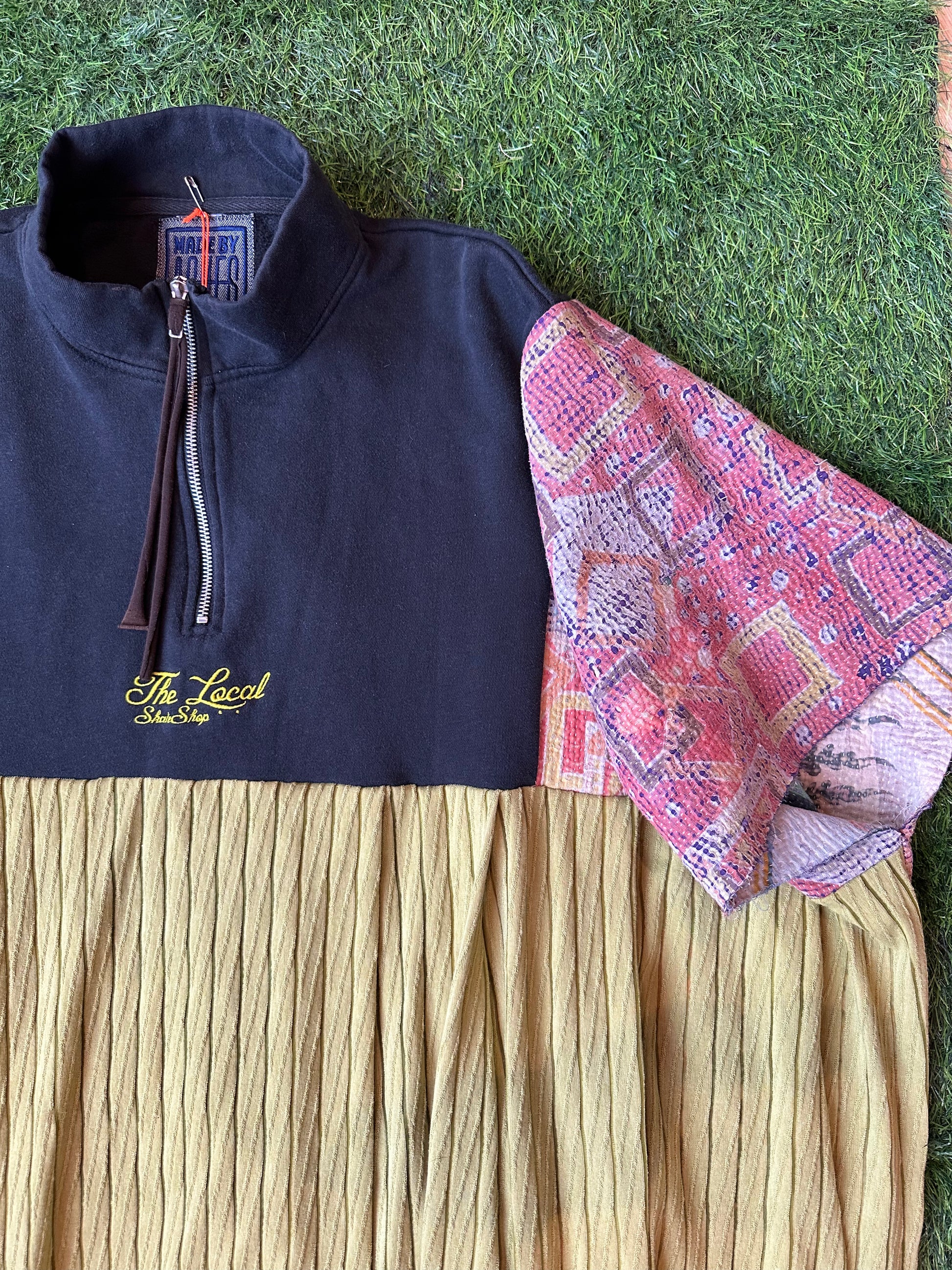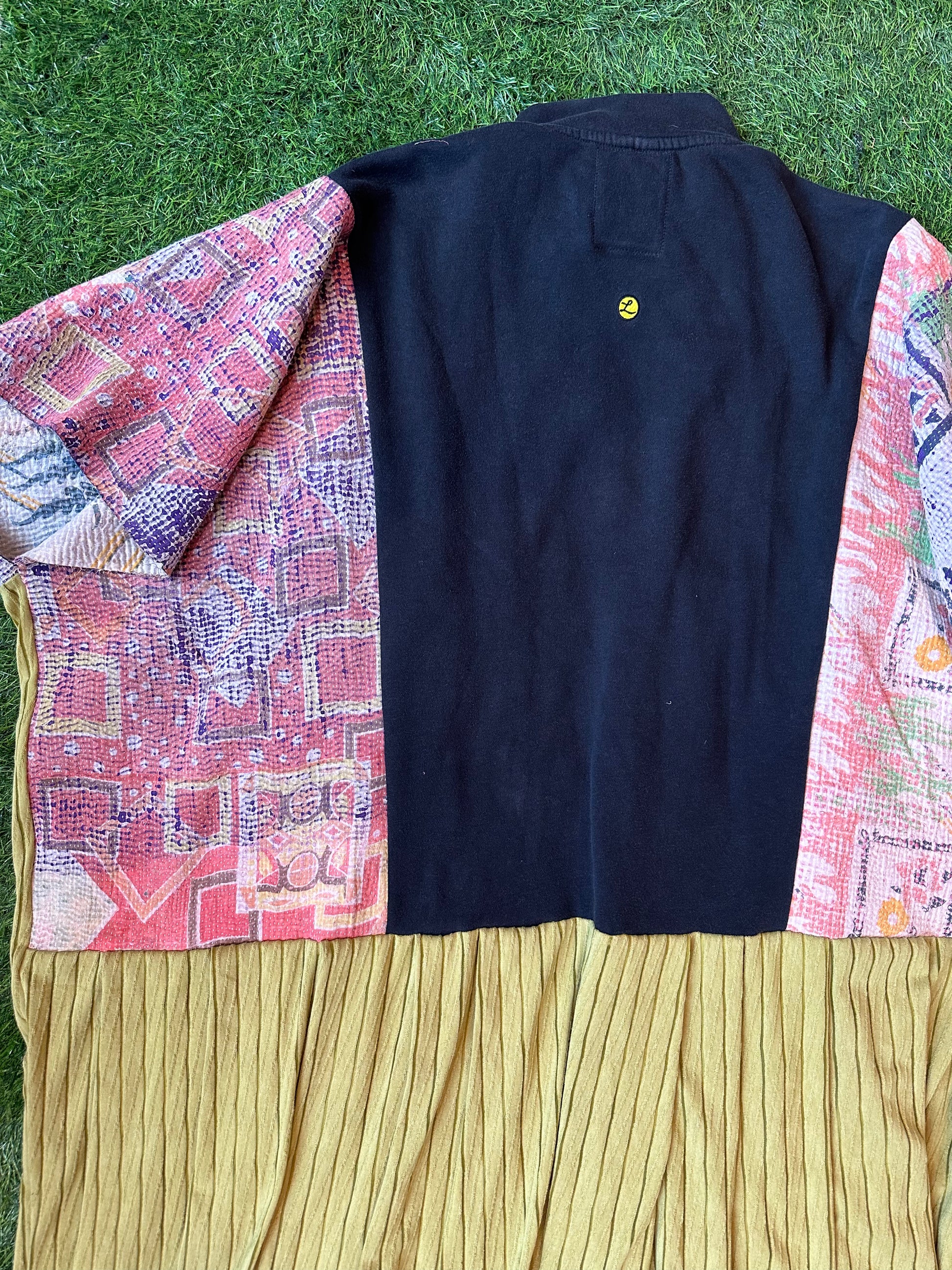 Upcycled Local Skate Shop upcycled sweater modified with Kantha quilt scraps adorning the body and sleeve. Sleeves are left raw with to naturally fray with time.