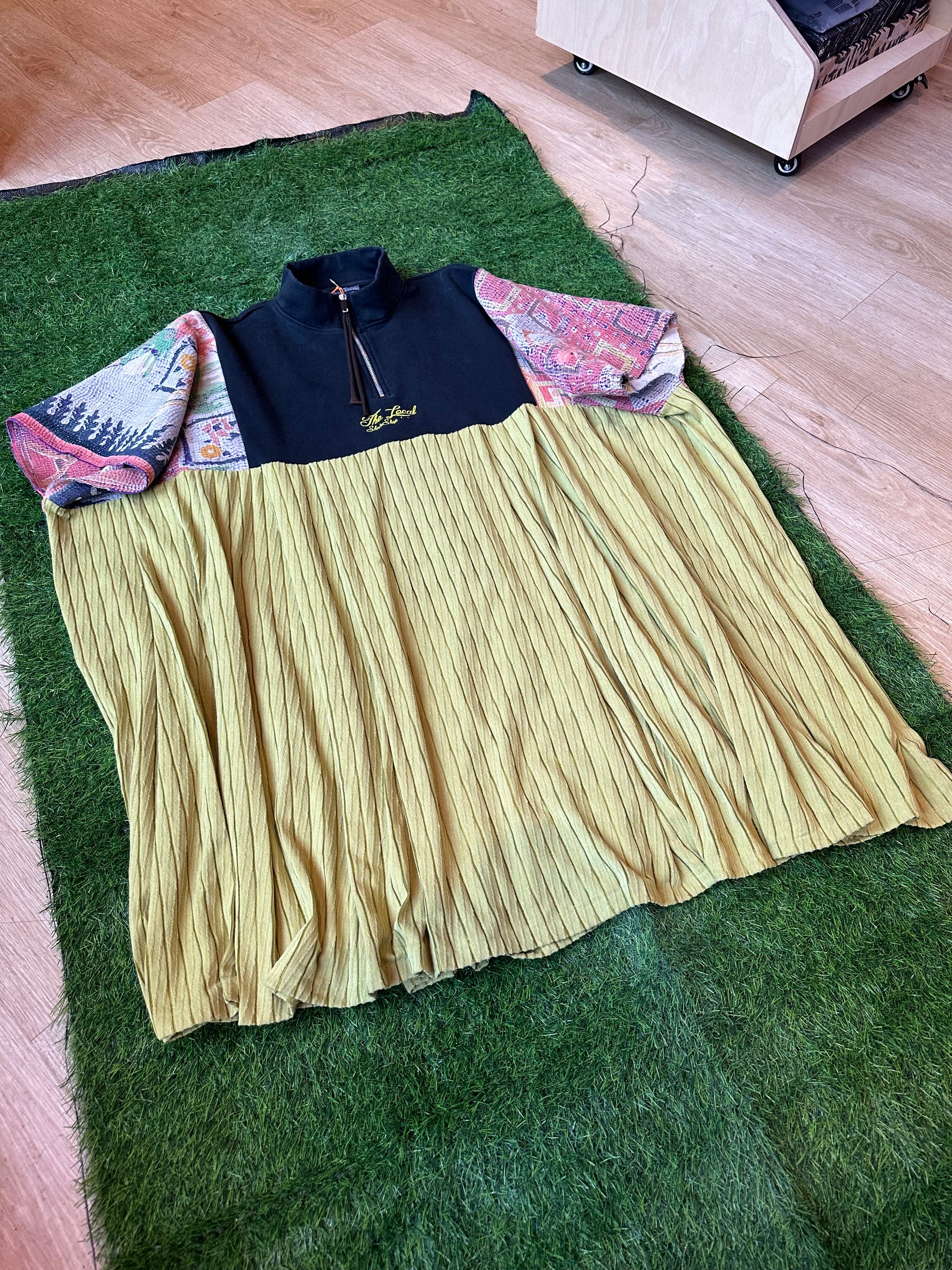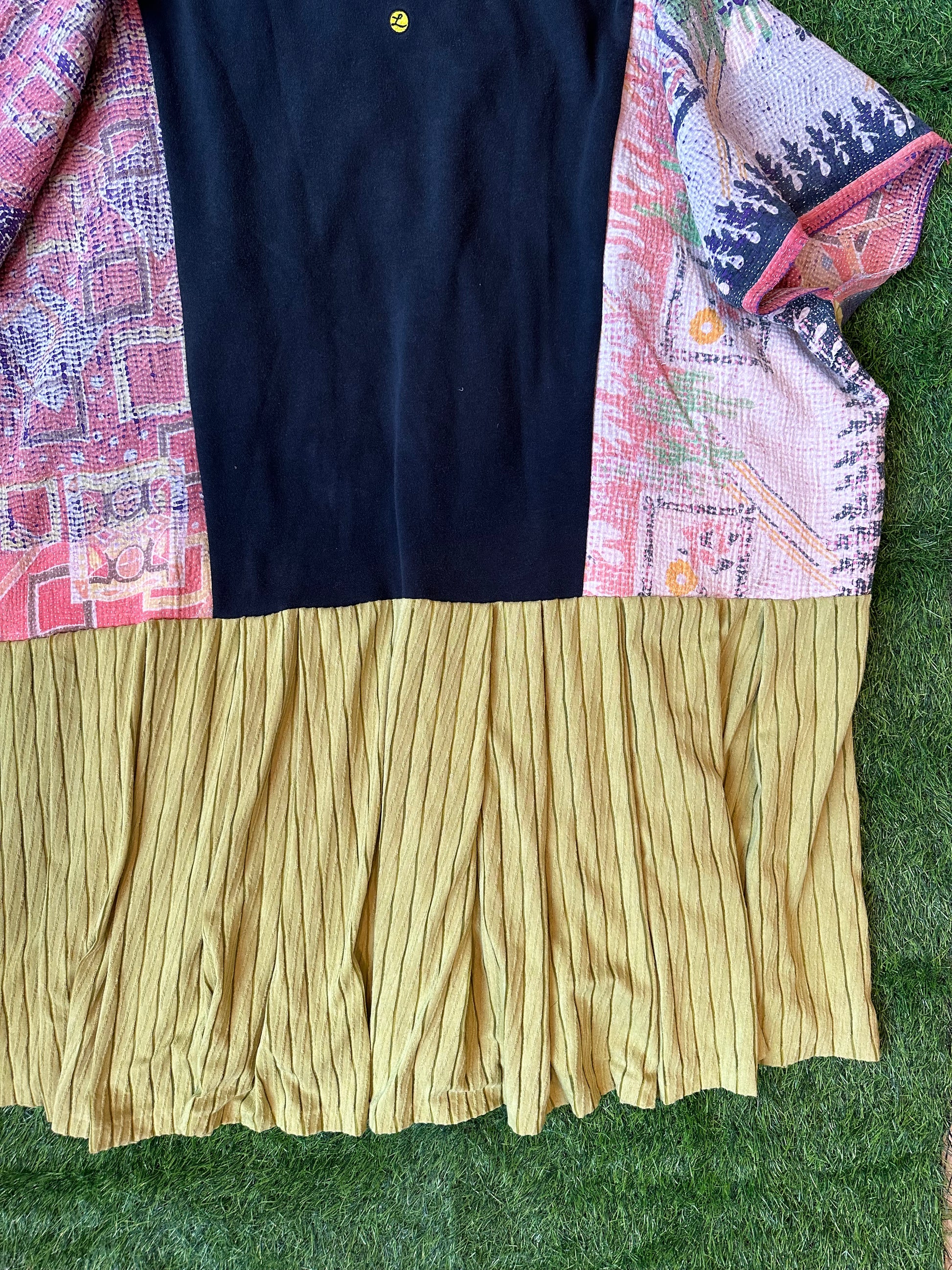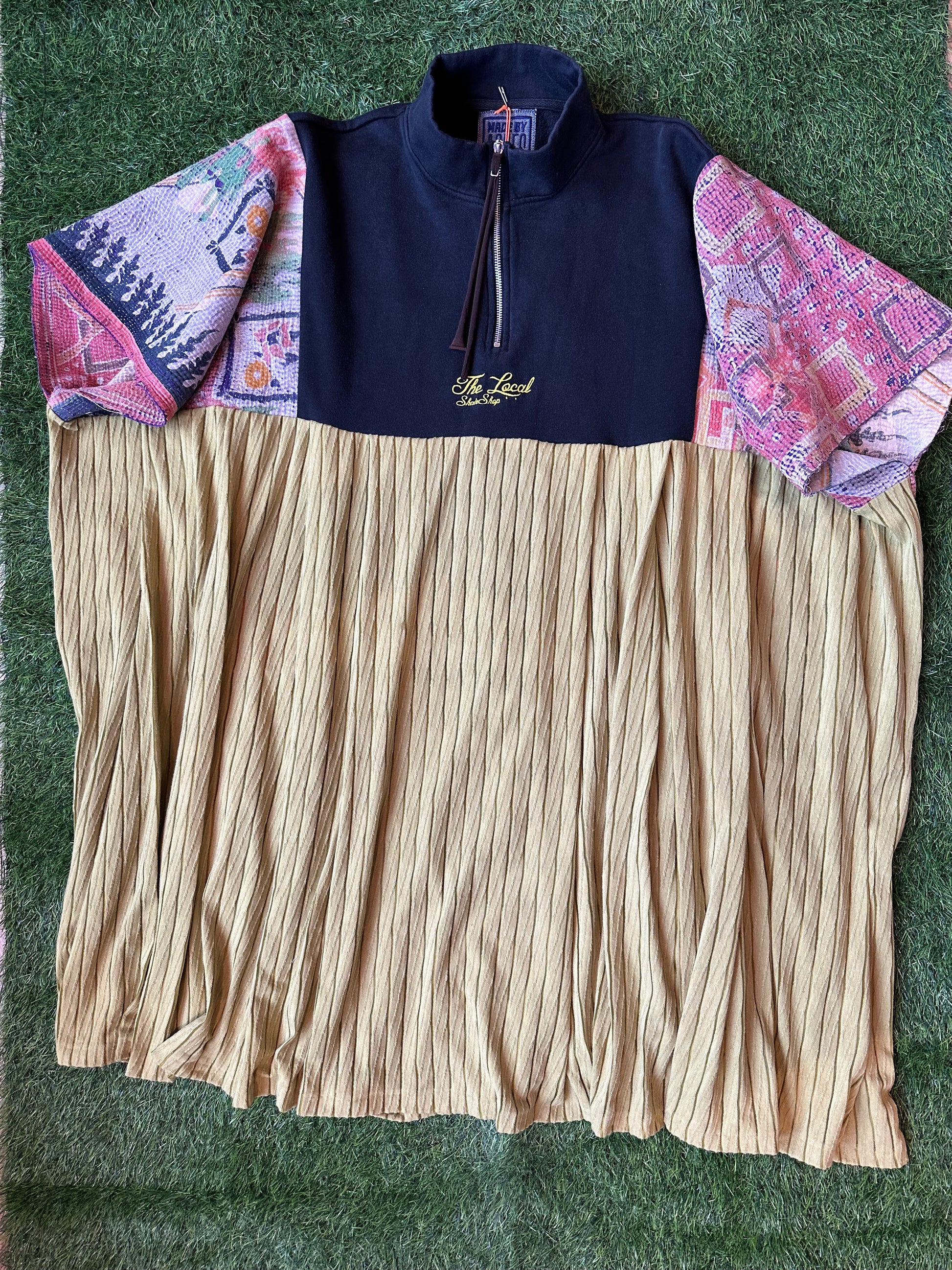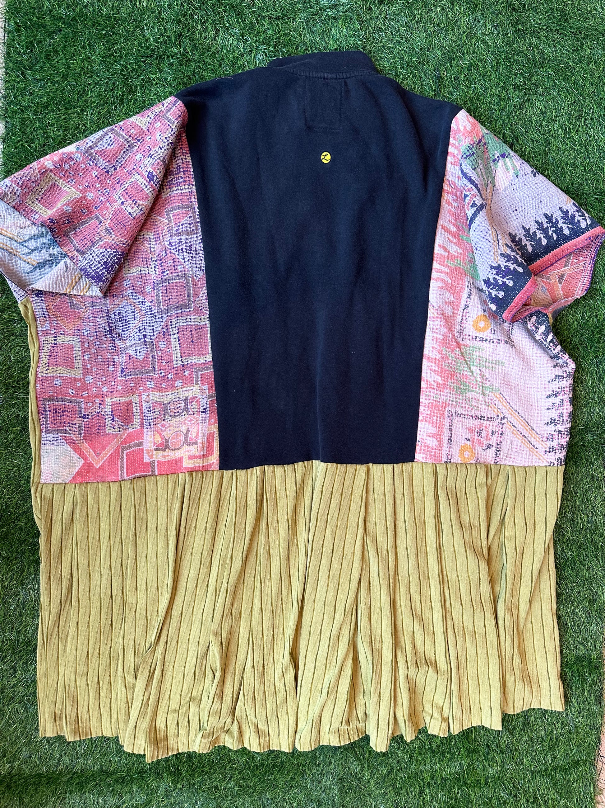 Upcycled Local Skate Shop upcycled sweater modified with Kantha quilt scraps adorning the body and sleeve. Sleeves are left raw with to naturally fray with time.