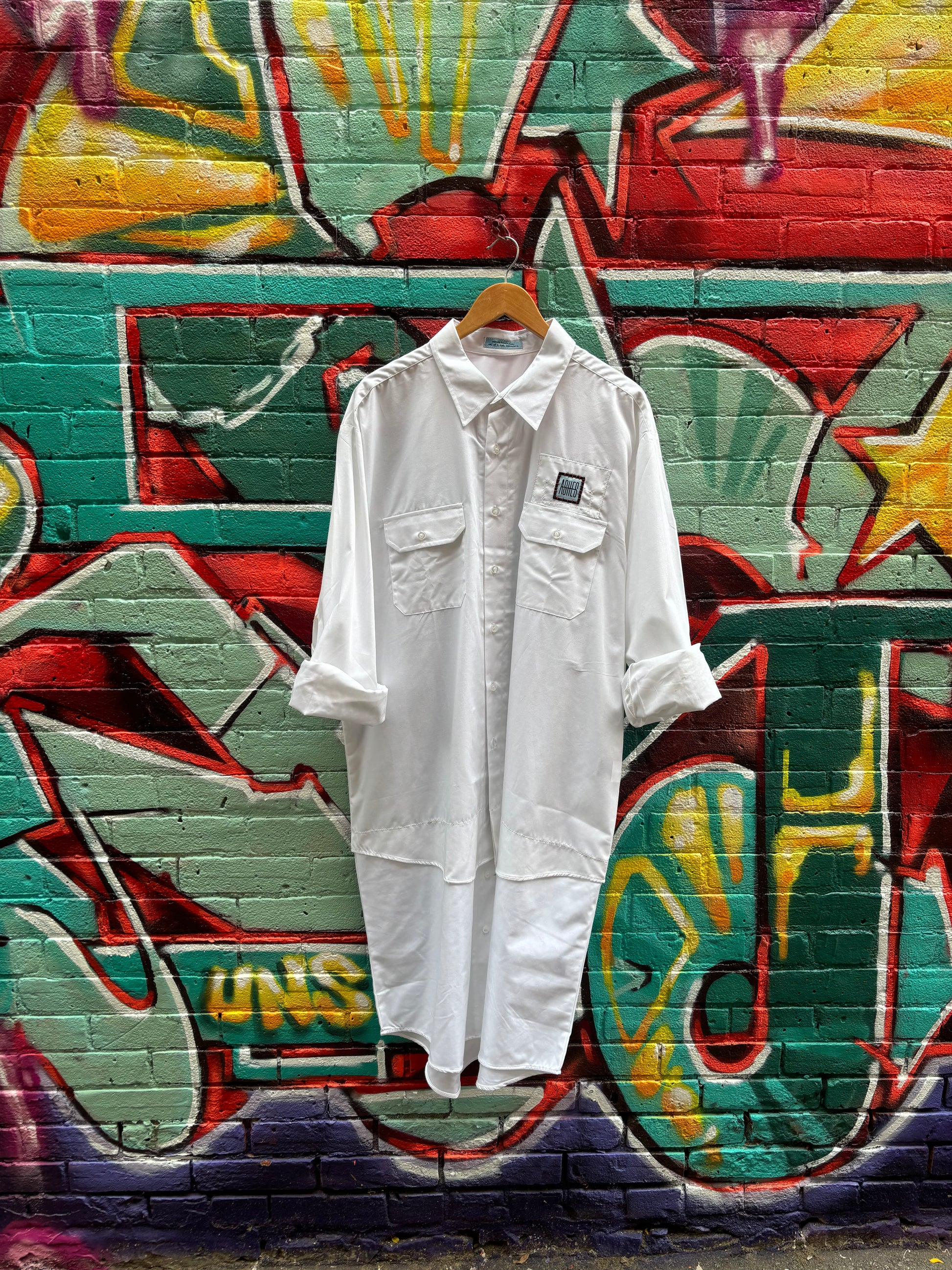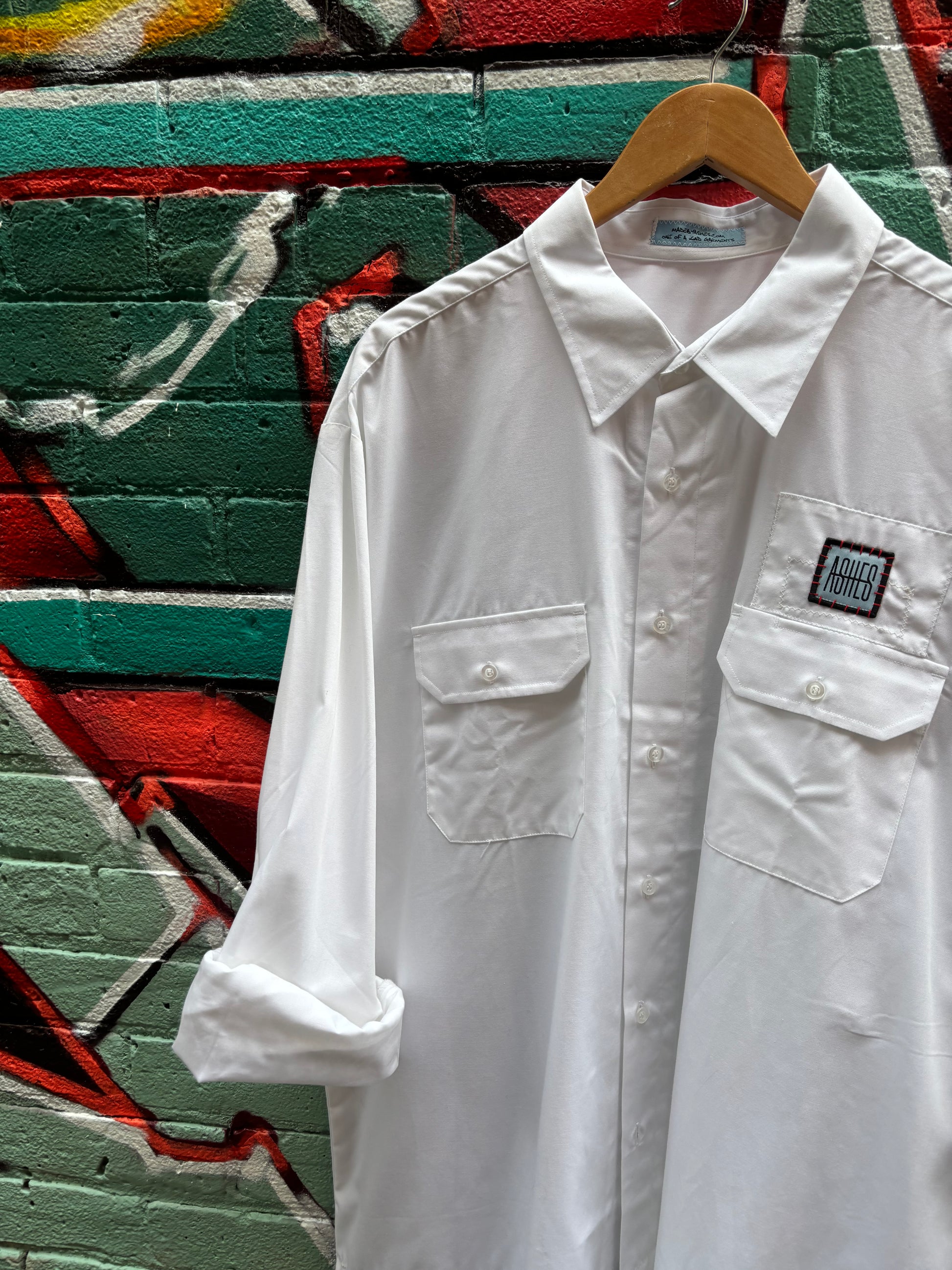 Two crisp polyester mix shirts combined together to create a classic final layer. ASHES patch on front with red hand stitch detail.