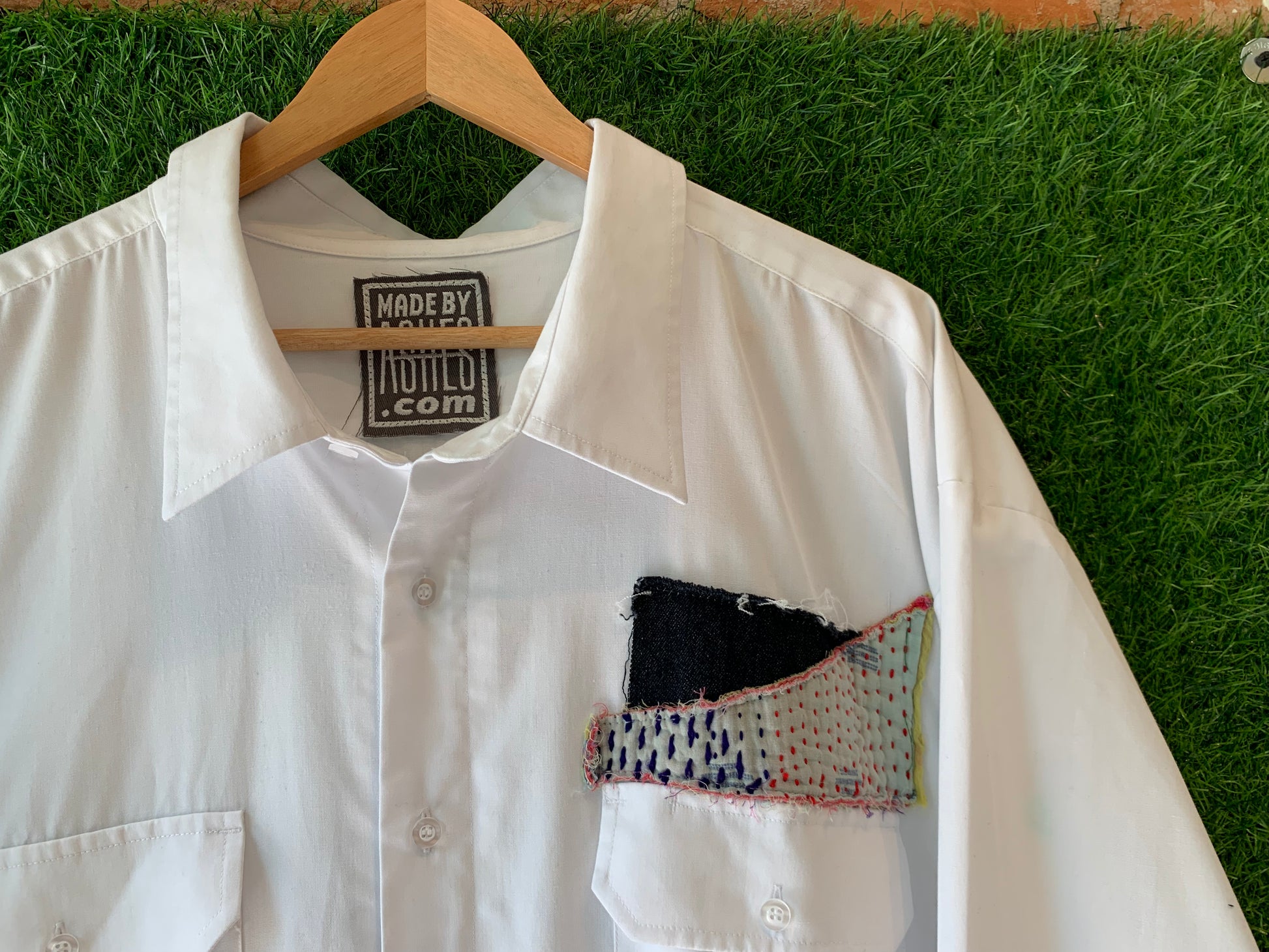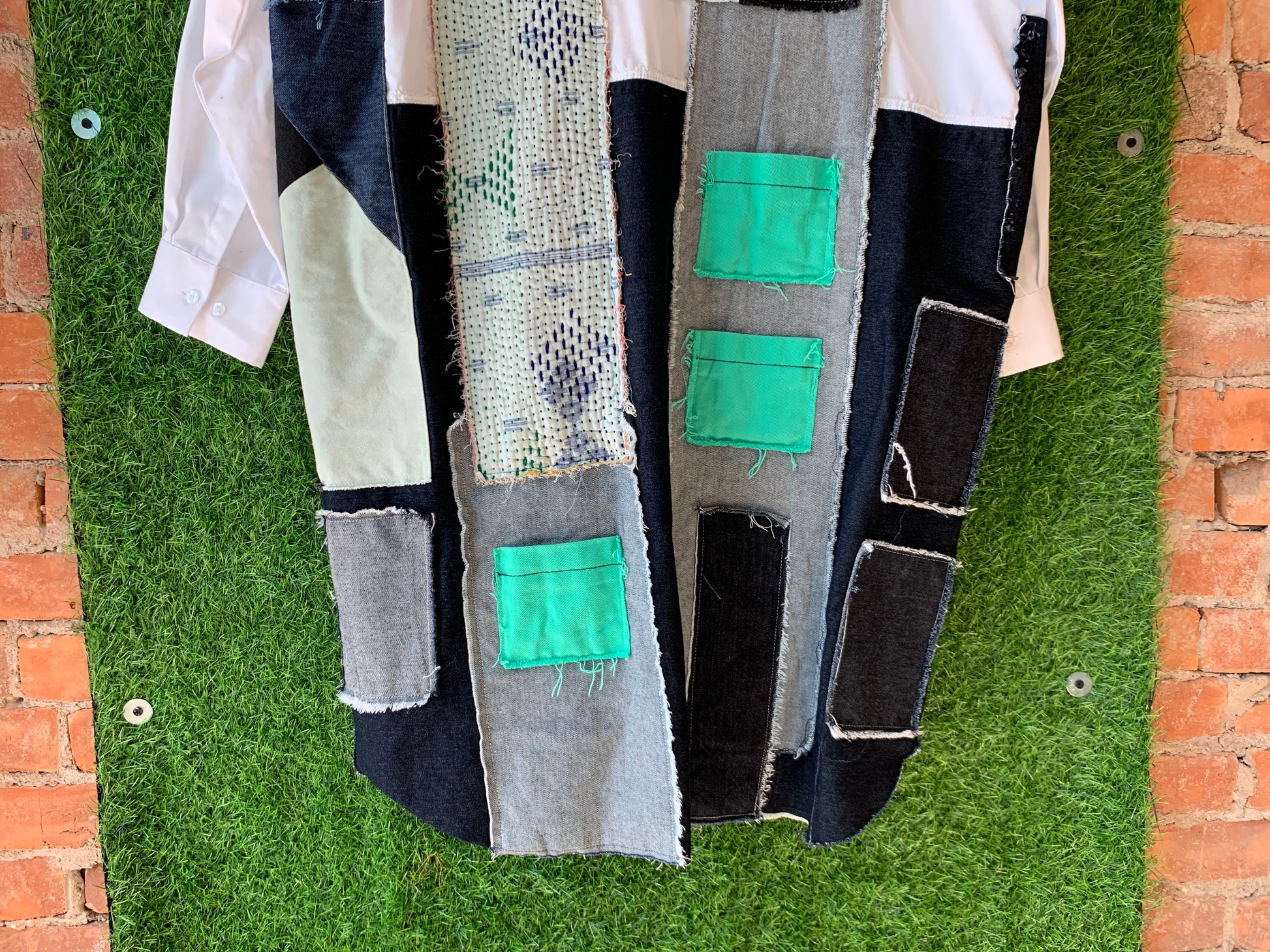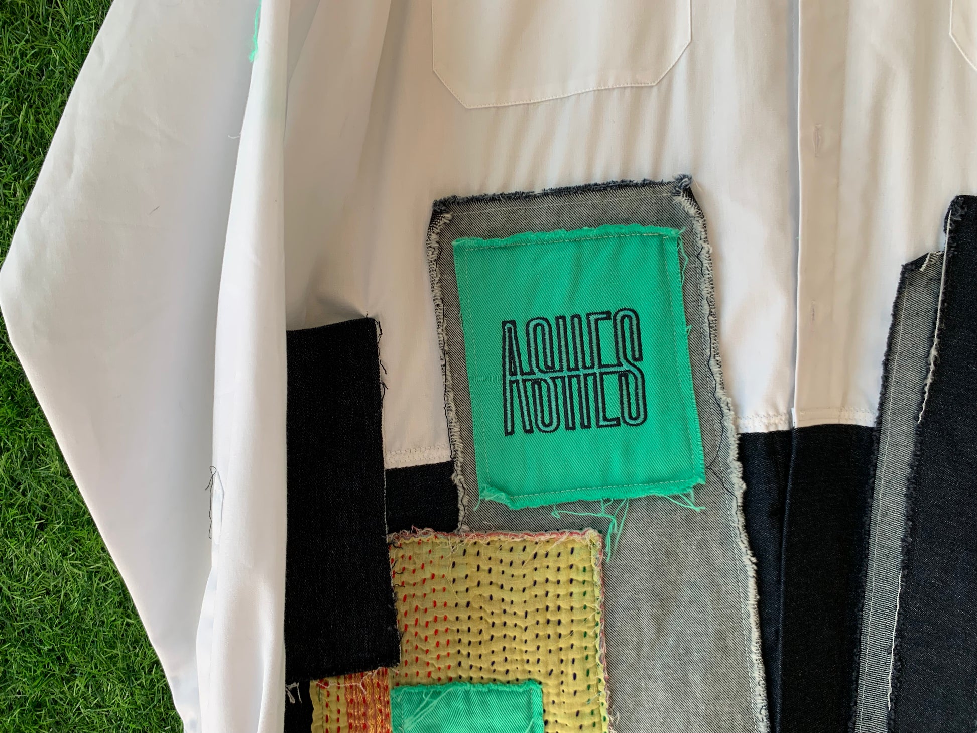 A crisp white collared button up started this creation. Deep blue denim with raw edges to give a natural frayed look. Mini mint pockets stitched throughout. Denim and quilt patchwork throughout. Embroidered ASHES logo. ONE OF A KIND.