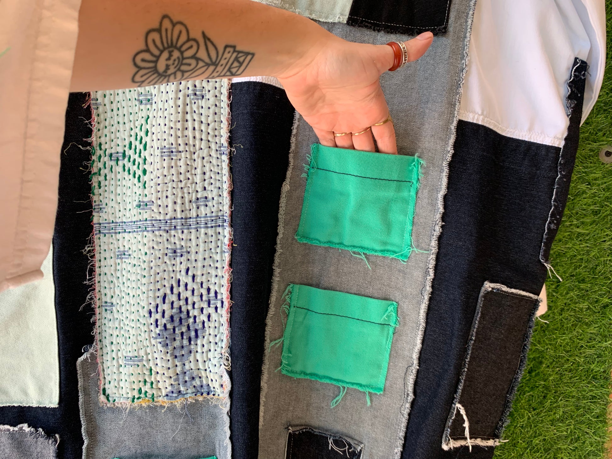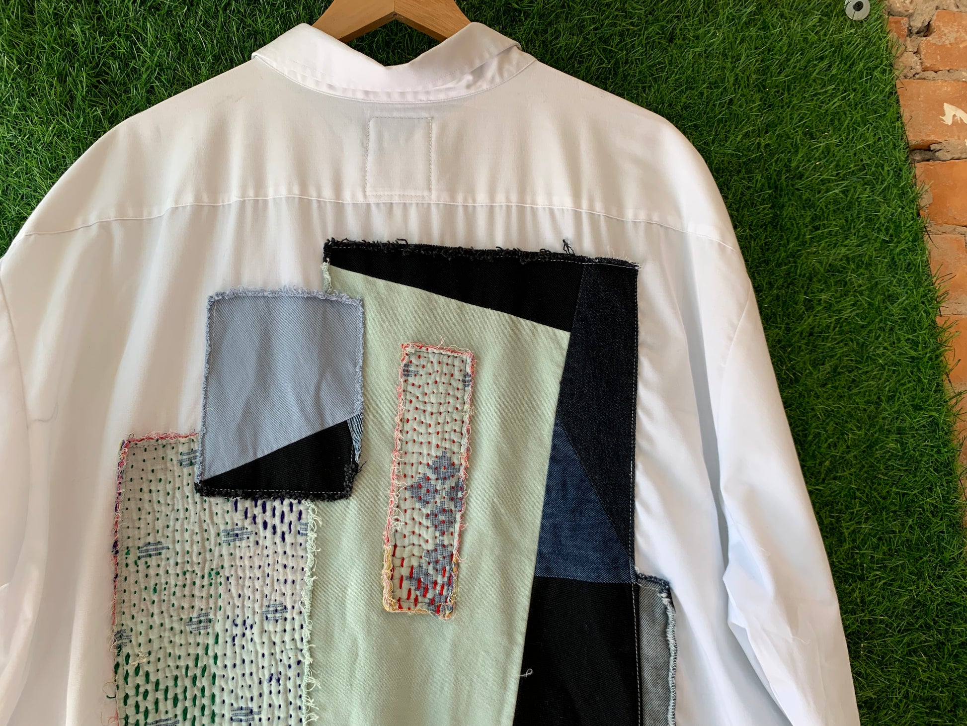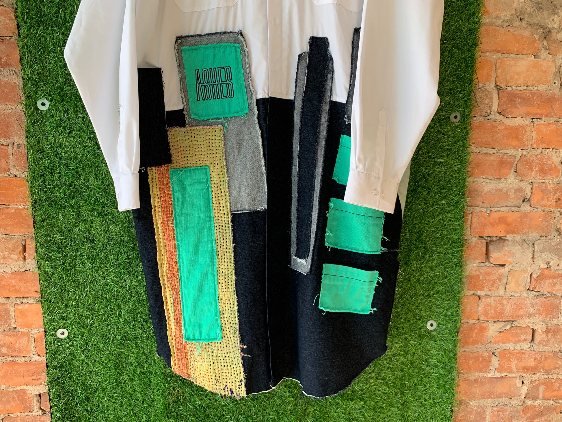 A crisp white collared button up started this creation. Deep blue denim with raw edges to give a natural frayed look. Mini mint pockets stitched throughout. Denim and quilt patchwork throughout. Embroidered ASHES logo. ONE OF A KIND.