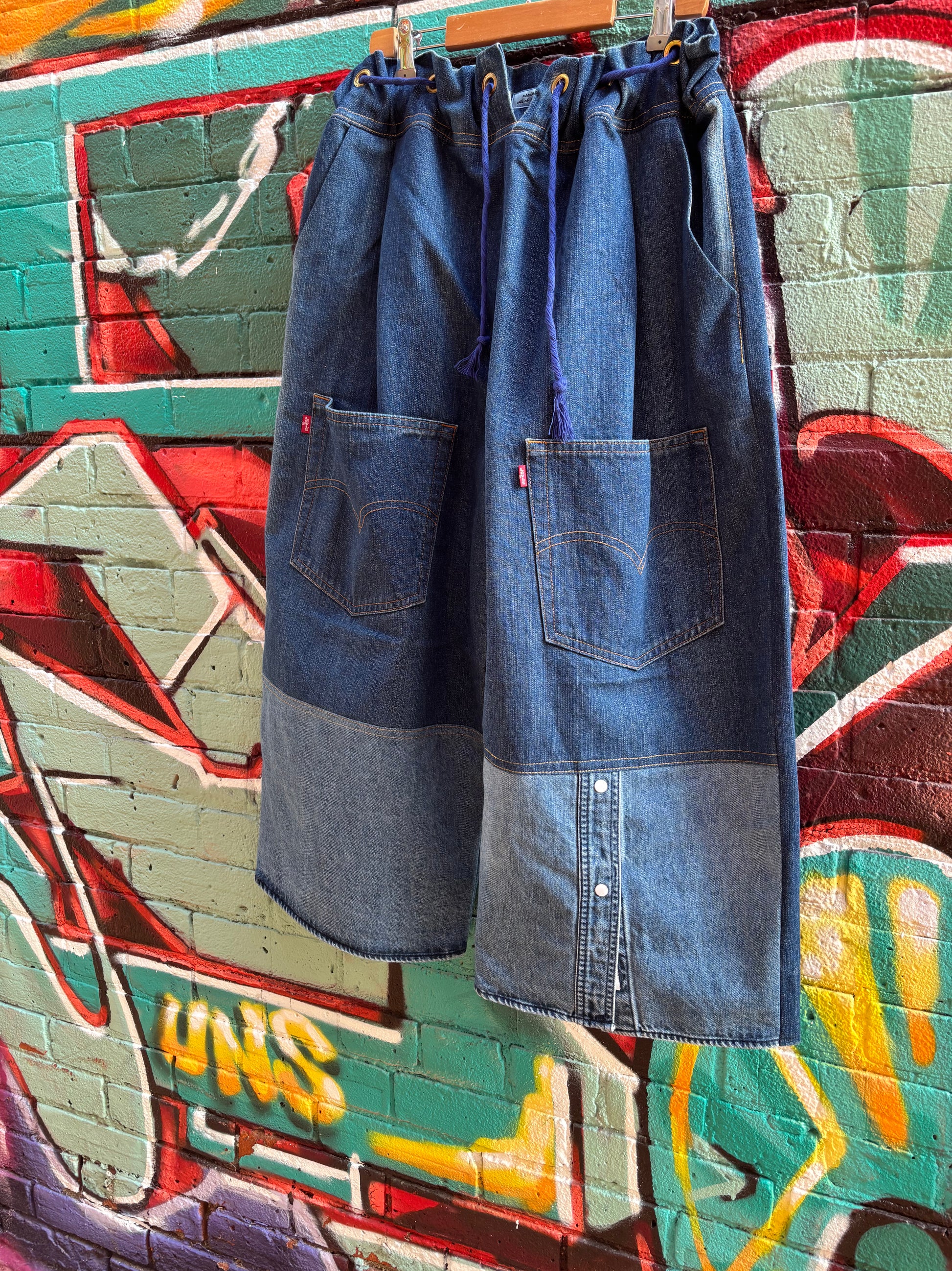Denim pants made from Levi’s curtains and denim shirt with placket.