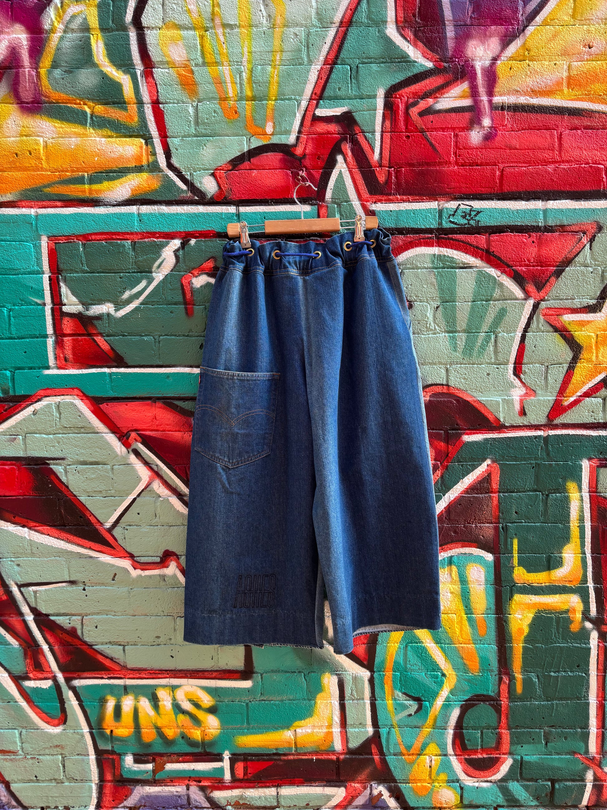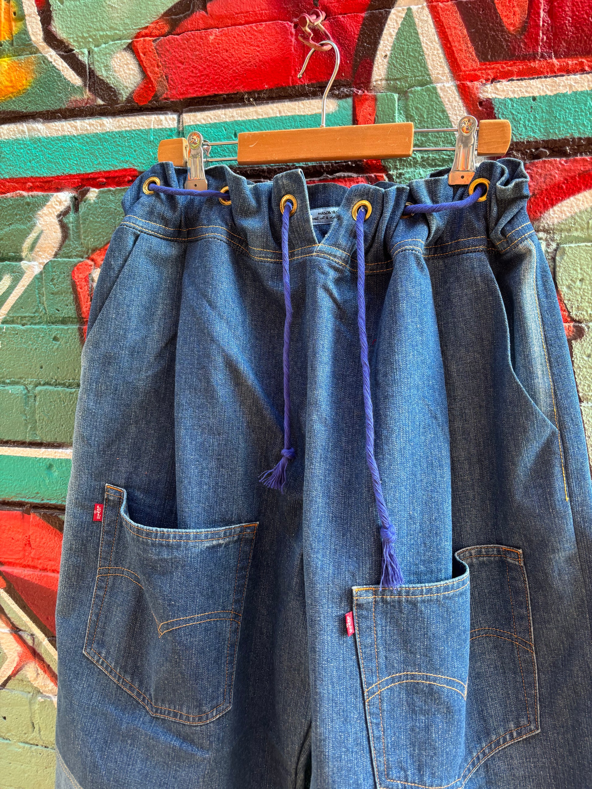 All materials rescued and upcycled into a wonderful , magical one of a kind pair of pants.