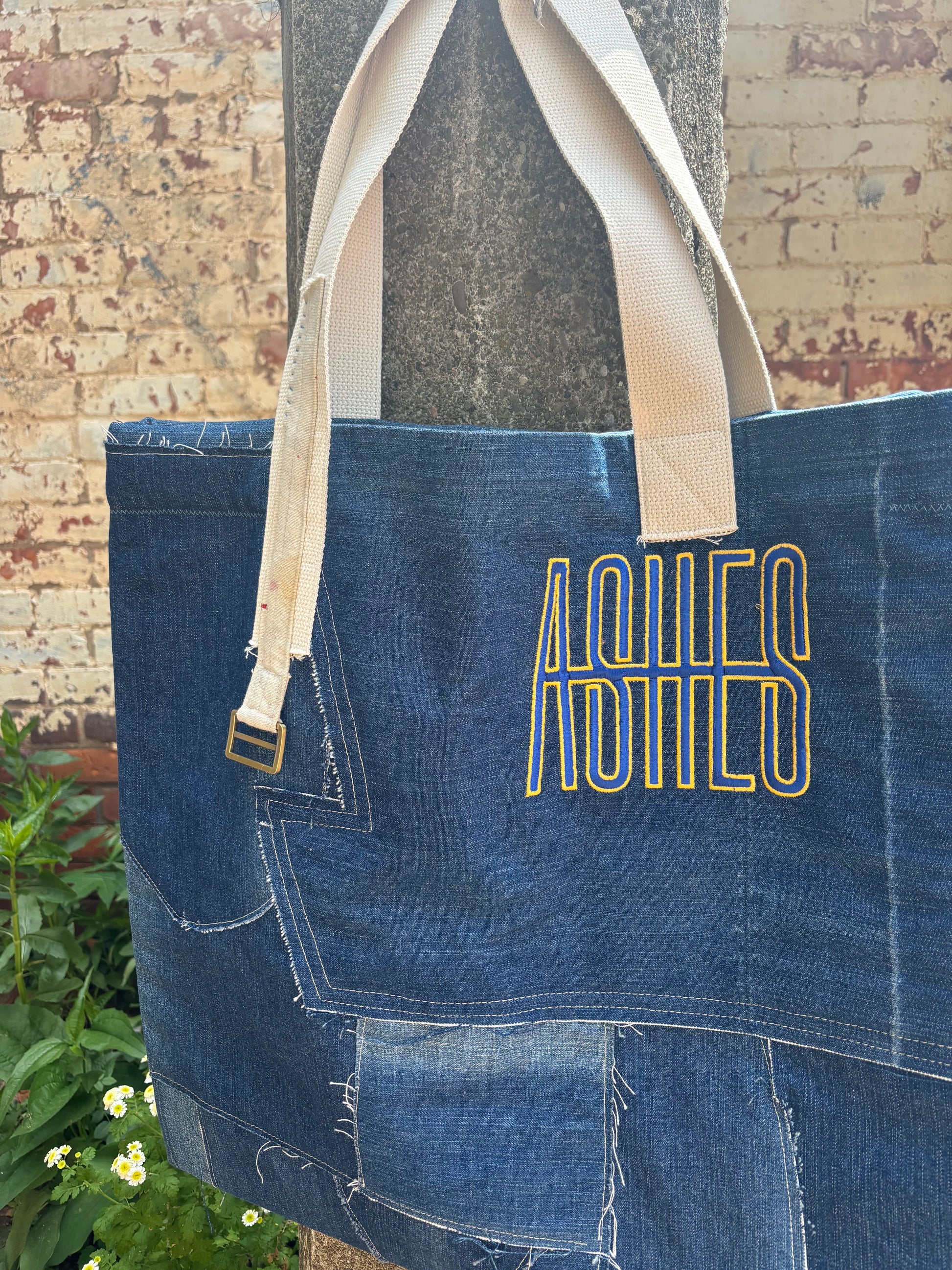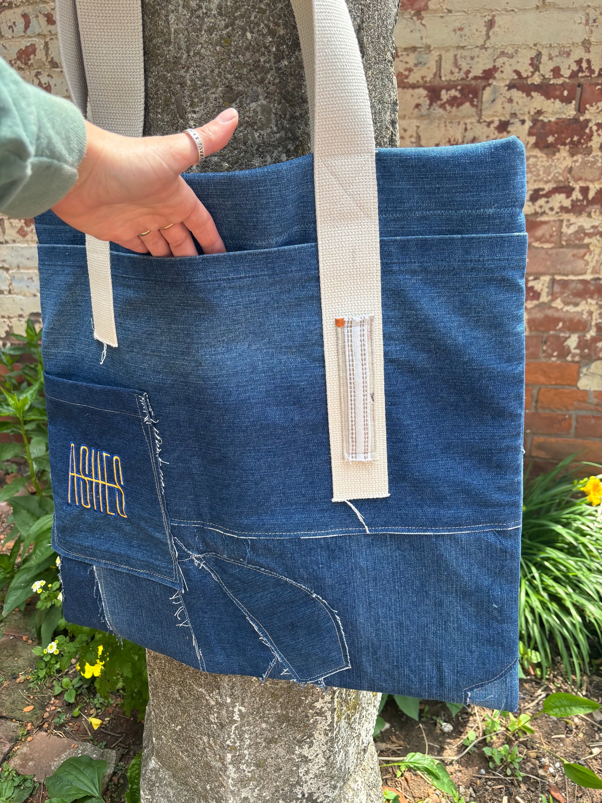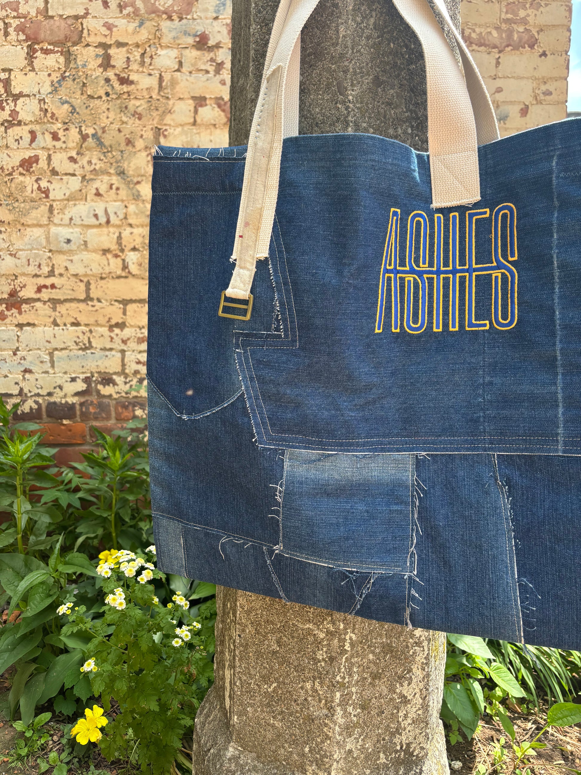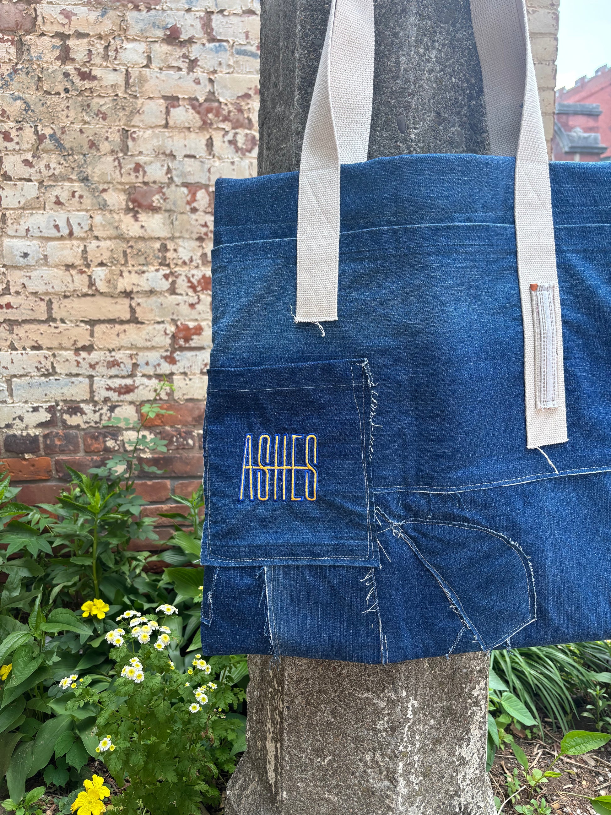 Denim remnants stitched together to create a new textile. Sewn onto an upholstery fabric for a durable heavyweight tote bag. Double pockets on both sides with ASHES embroidered logo. Hand stitch detail and hardware detail for attaching key rings and decorative items on outside. Unlined but seams are finished with an organza ribbon to give it a finished look.
