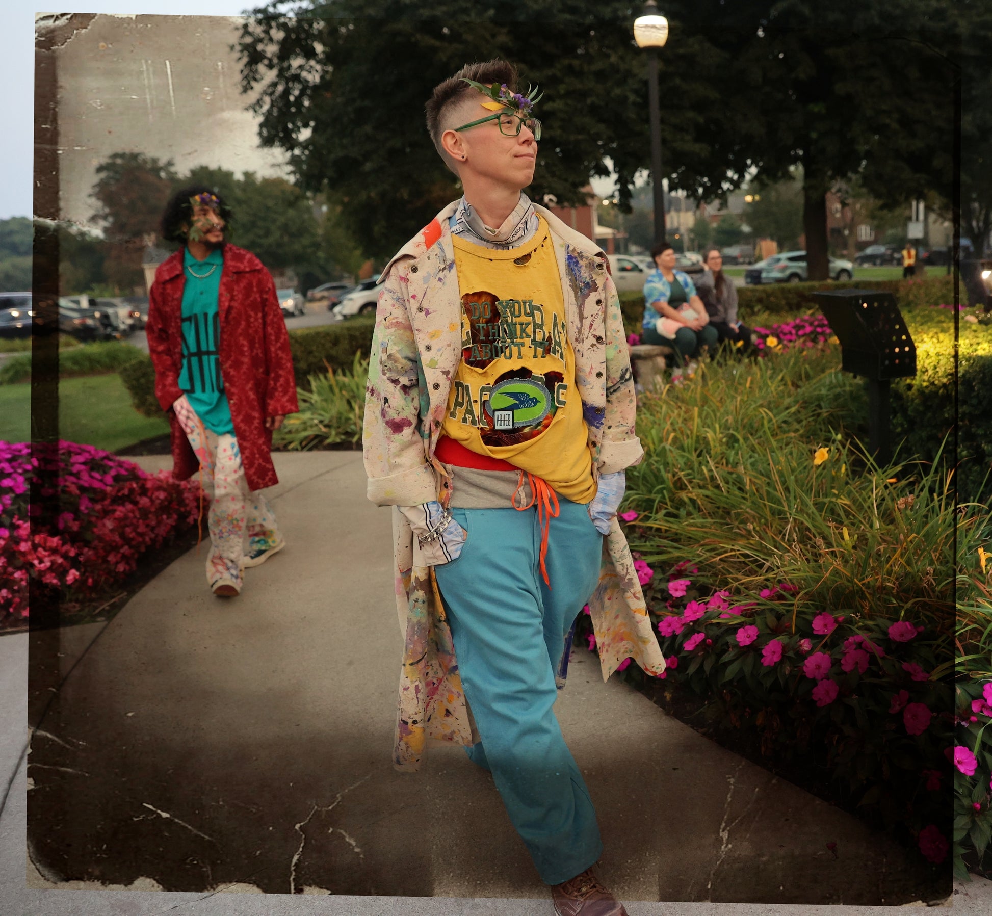 Velvet knit hand stitched onto front and back sections. Wear ART denim bird patch and DO YOU THINK ABOUT IT embroidered onto front.