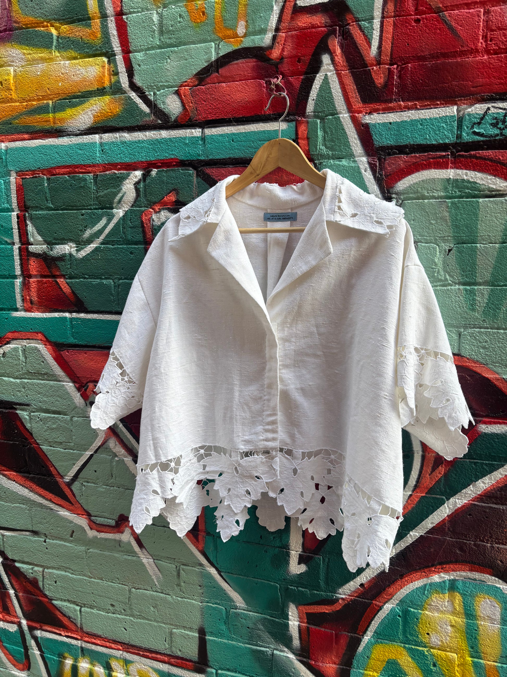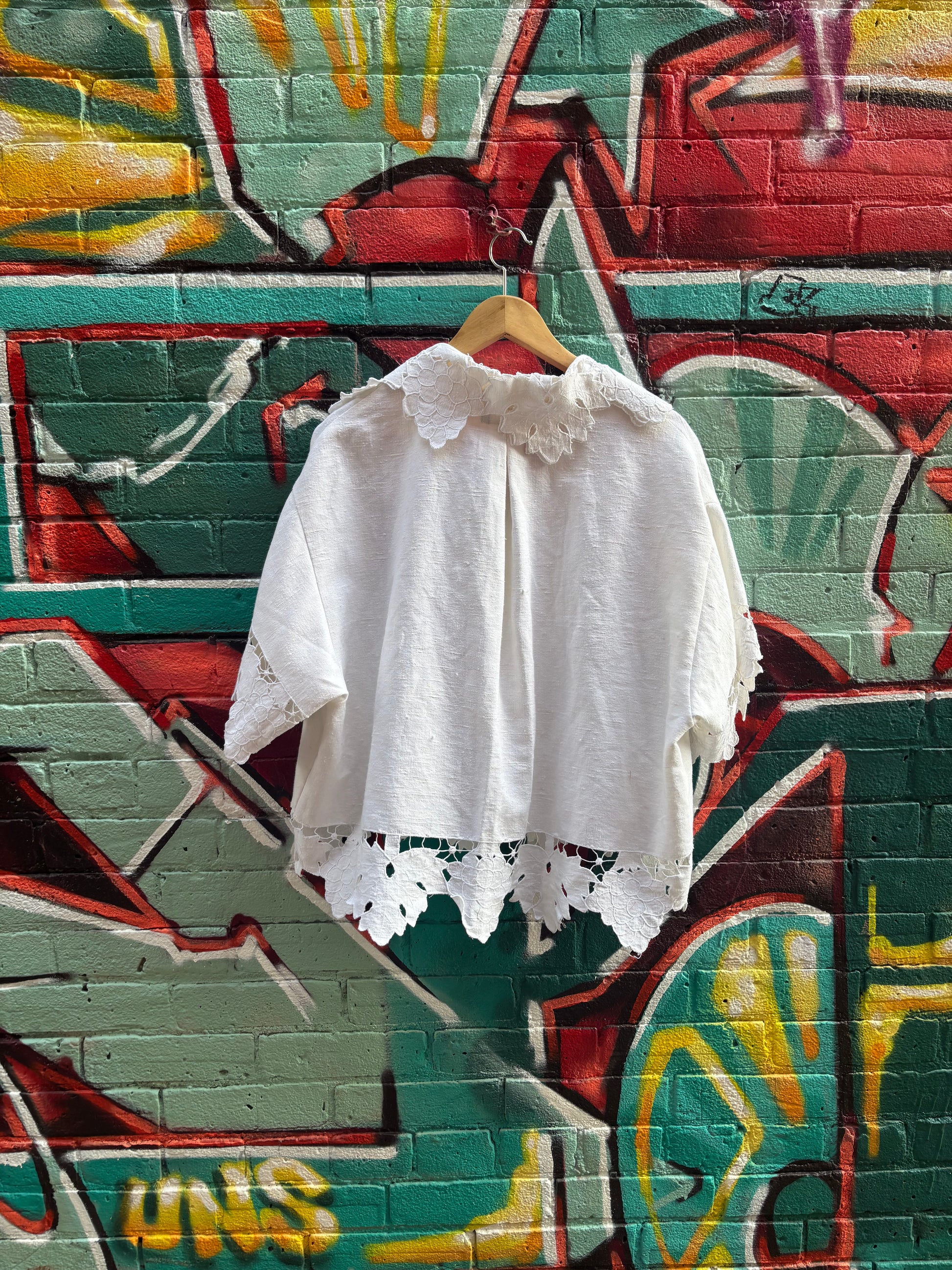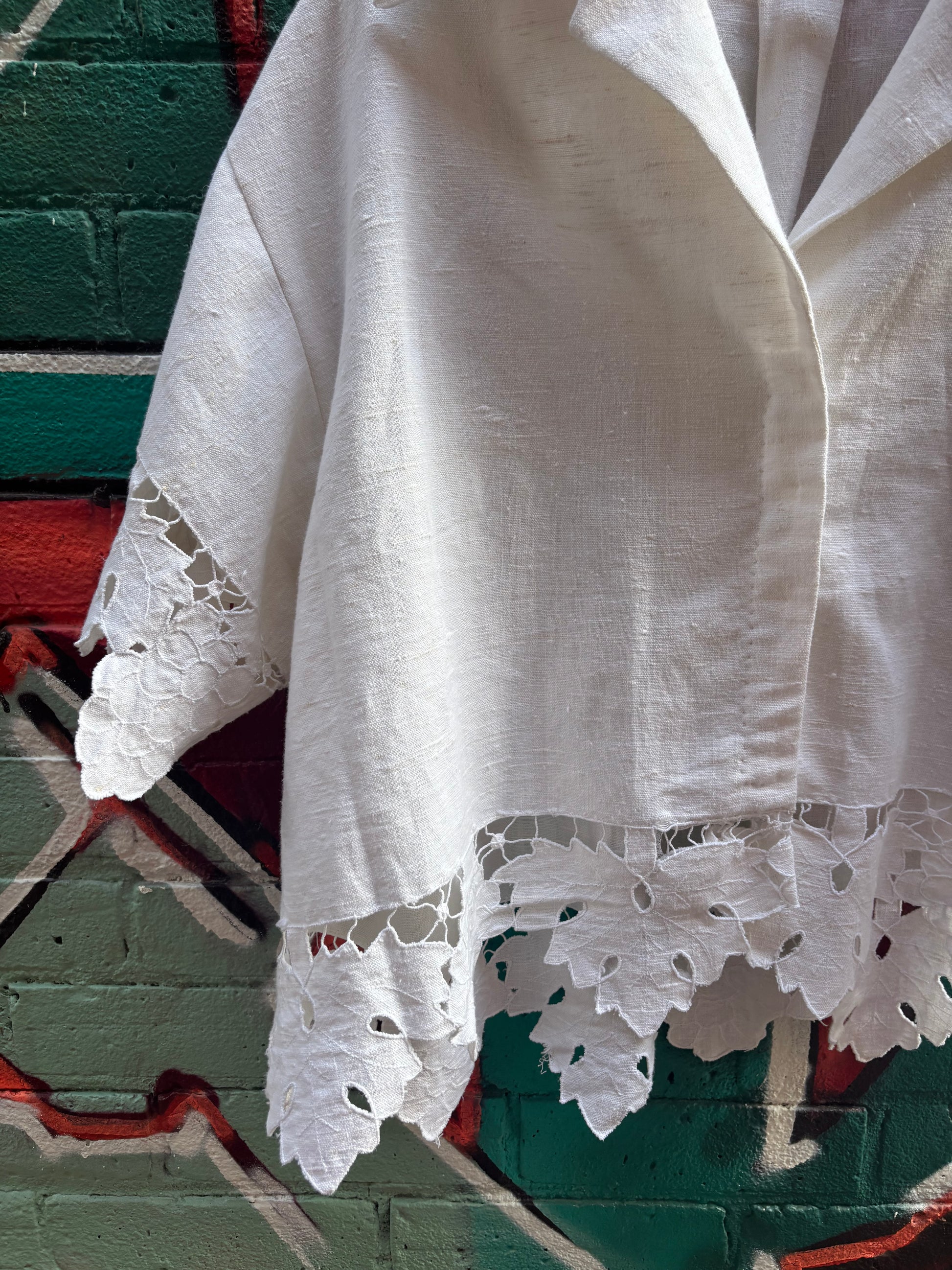 Cotton upcycled slubby tablecloth. Lovely floral details around edges. Pleat down center back for additional comfort.
