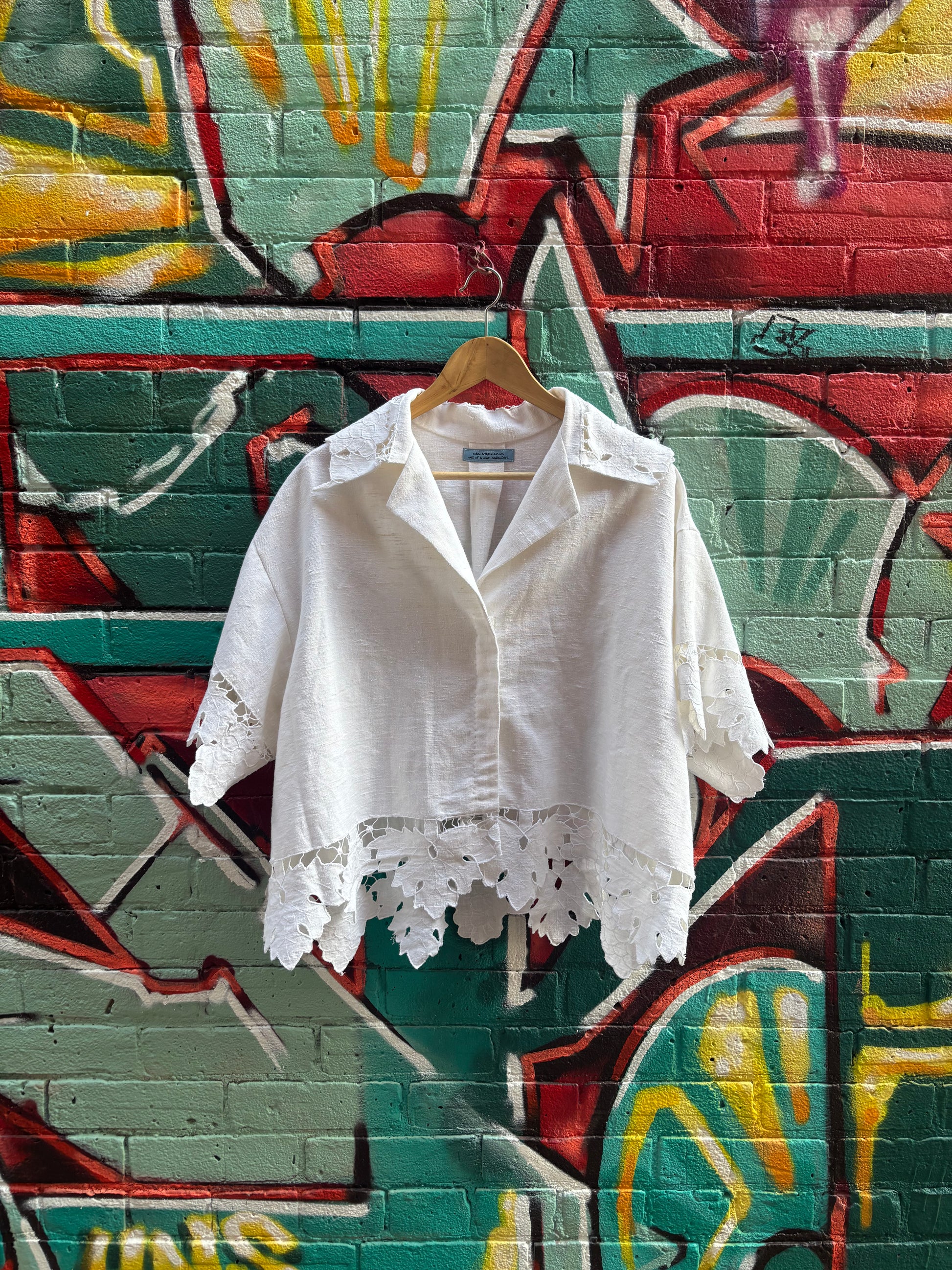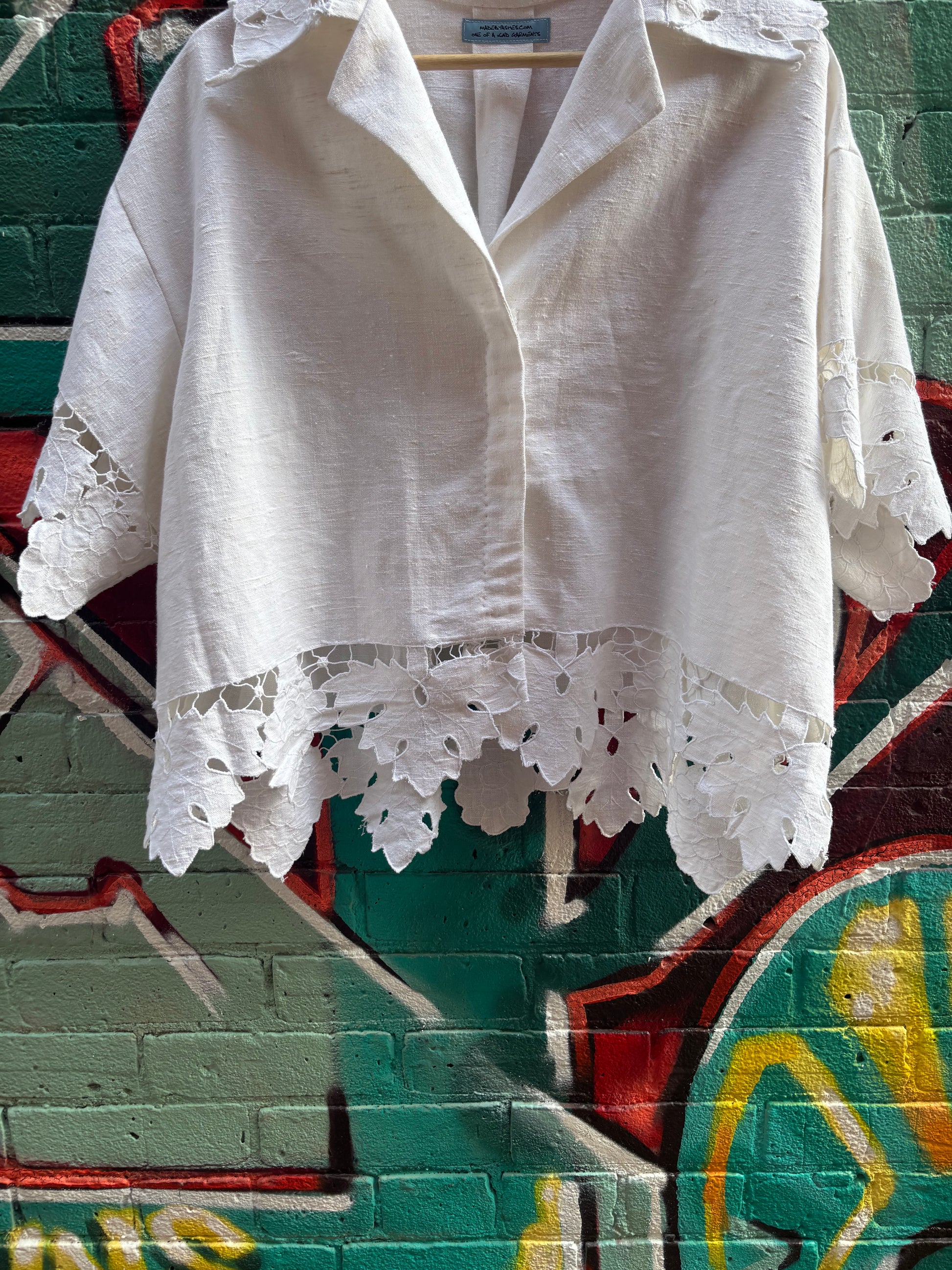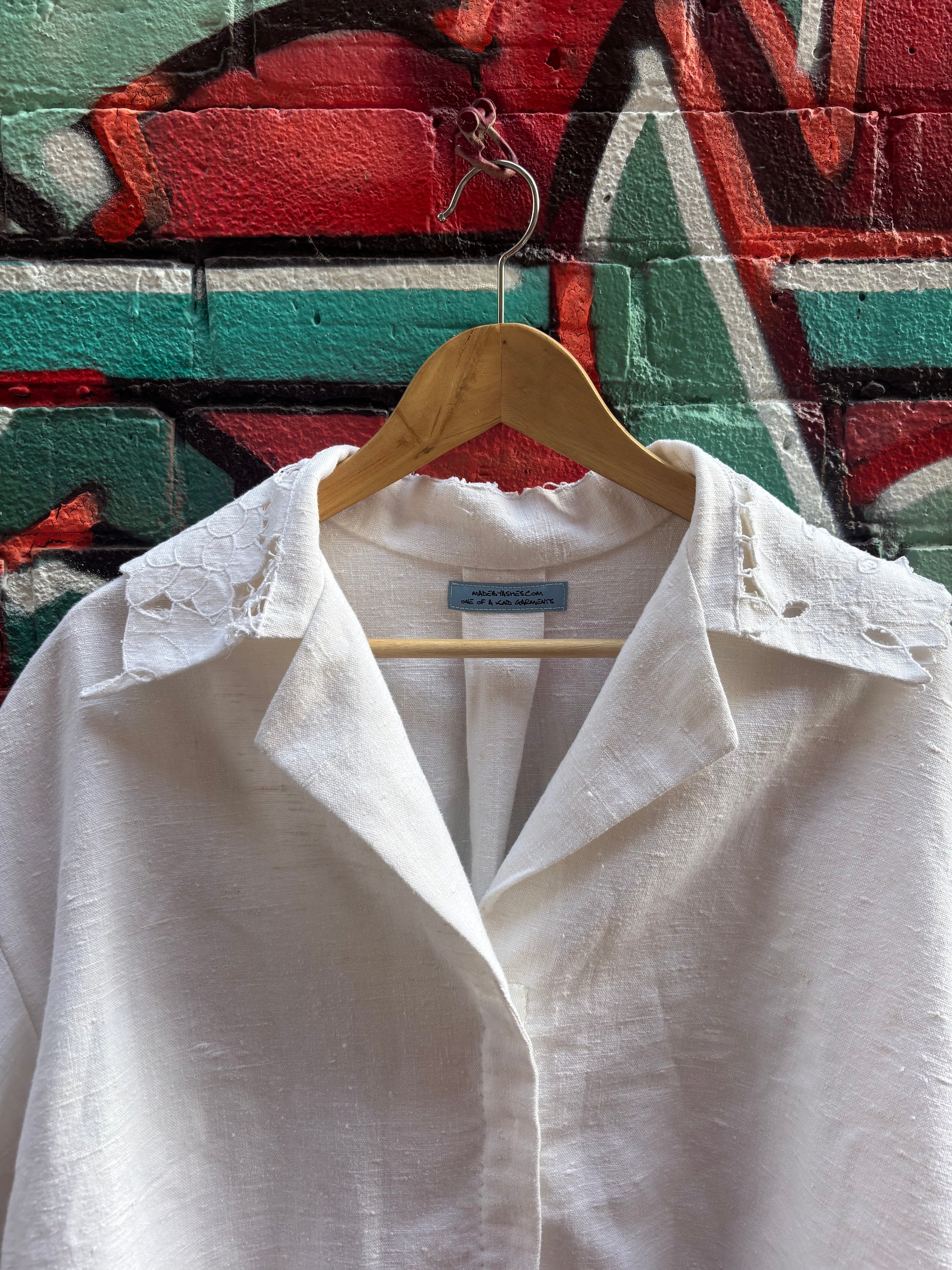 Cotton upcycled slubby tablecloth. Lovely floral details around edges. Pleat down center back for additional comfort.