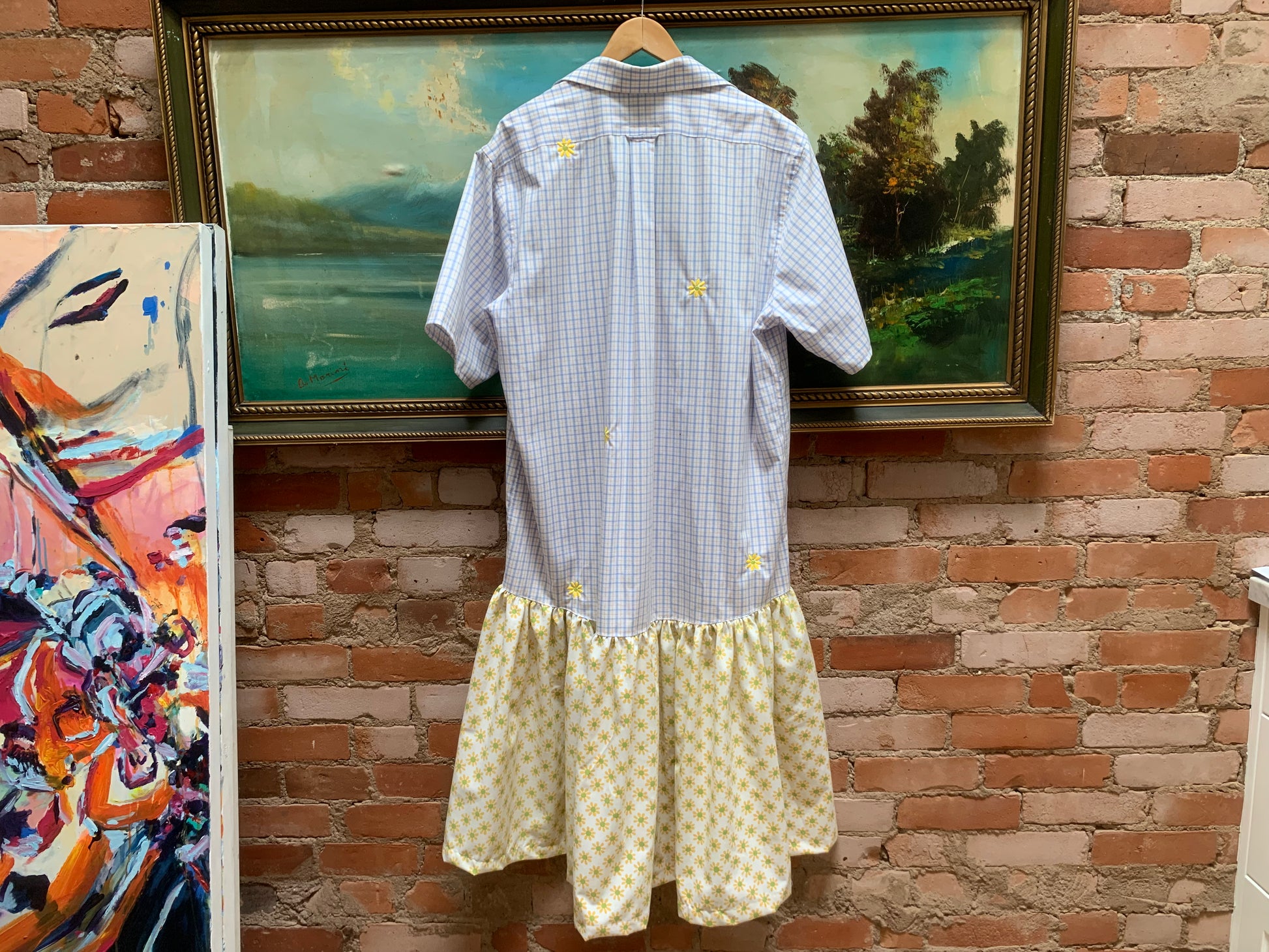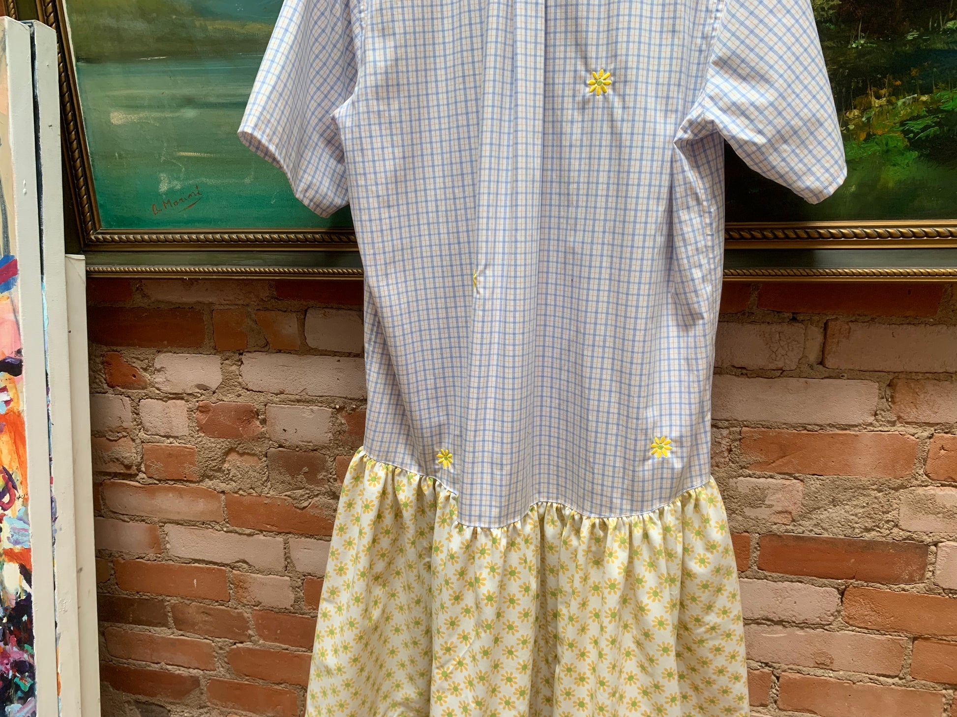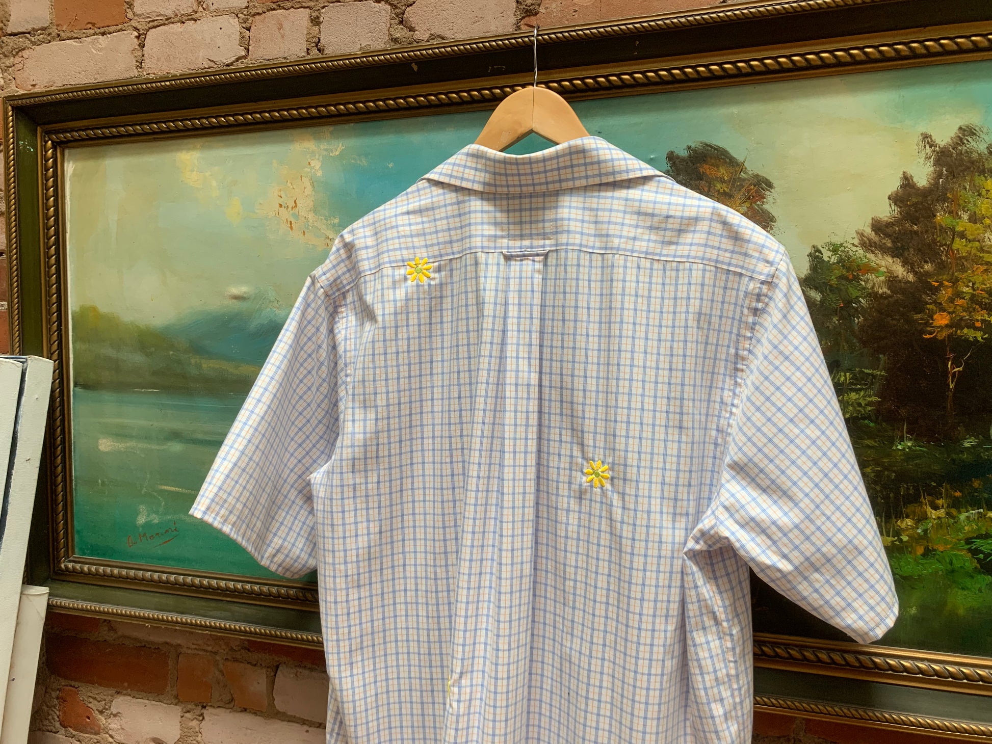 Upcycled button up plaid lightweight shirt with vintage floral fabric base. Short sleeve. Embroidered ASHES on chest. Flowers embroidered throughout.