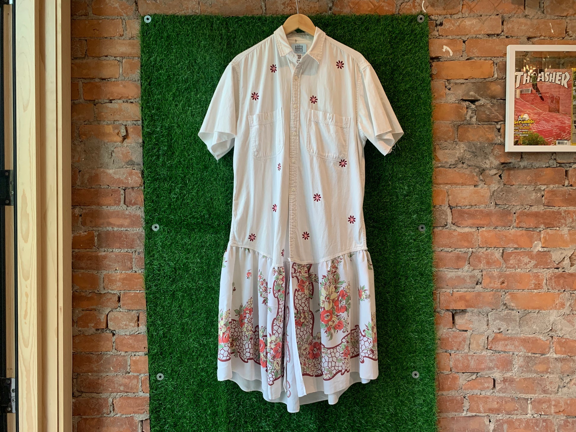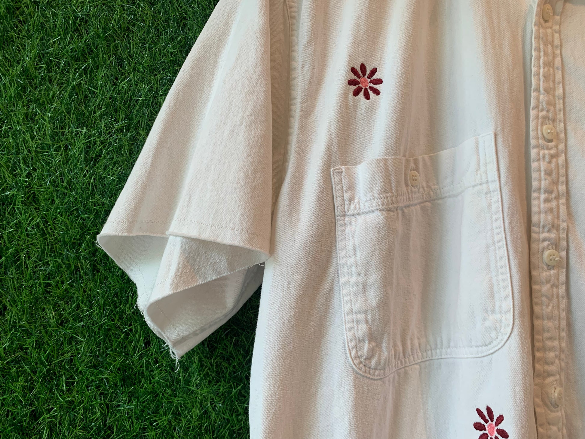Upcycled button up natural cotton twill shirt with vintage floral fabric base. Short sleeve. Sleeves are left raw with zig zag stitch to naturally fray with time. Embroidered Burgundy and pink flowers throughout top.