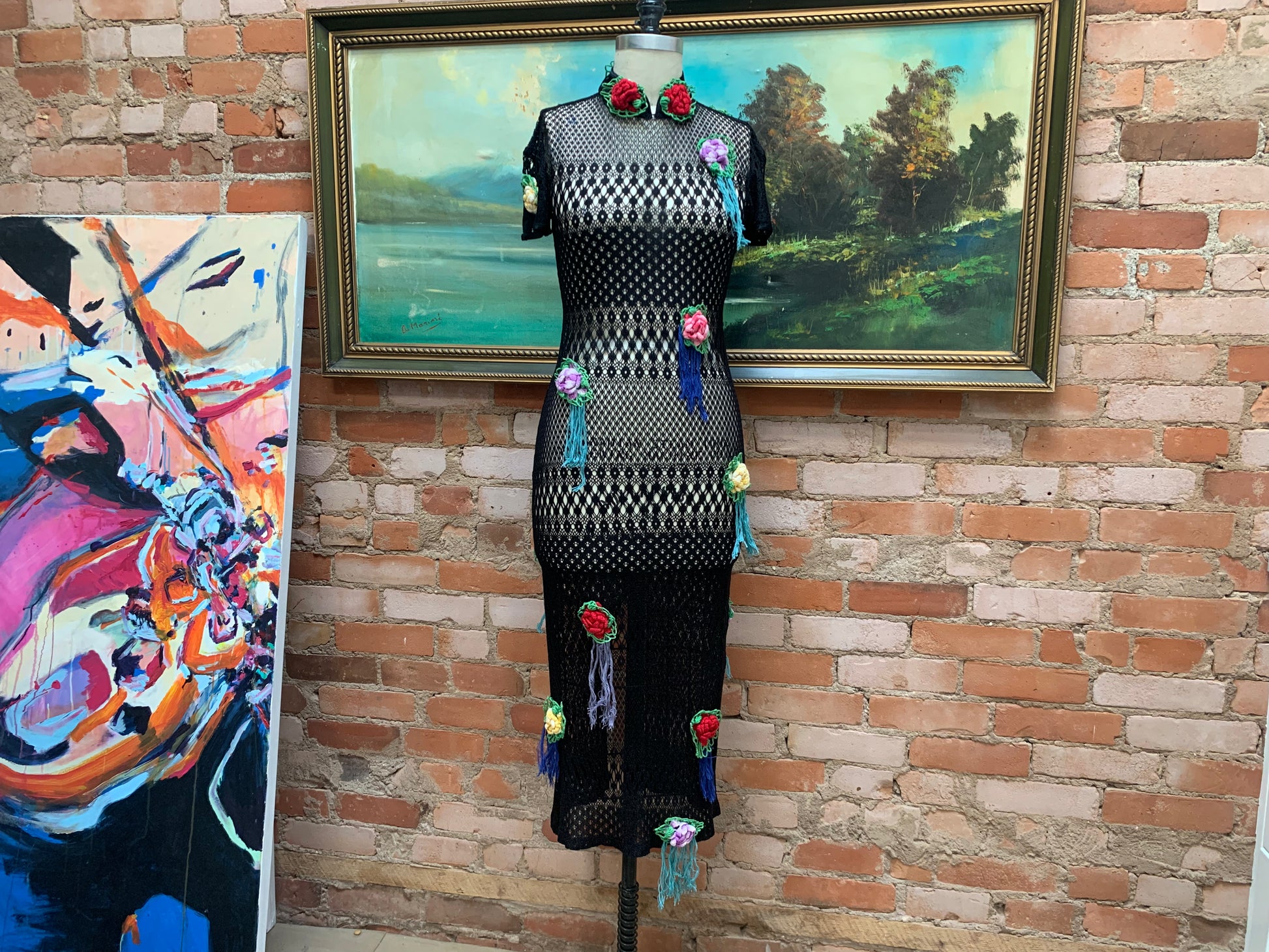 Vintage sheer polyester lace dress with vintage crocheted flowers hand stitched throughout. Cotton yarn details stitched around flowers.