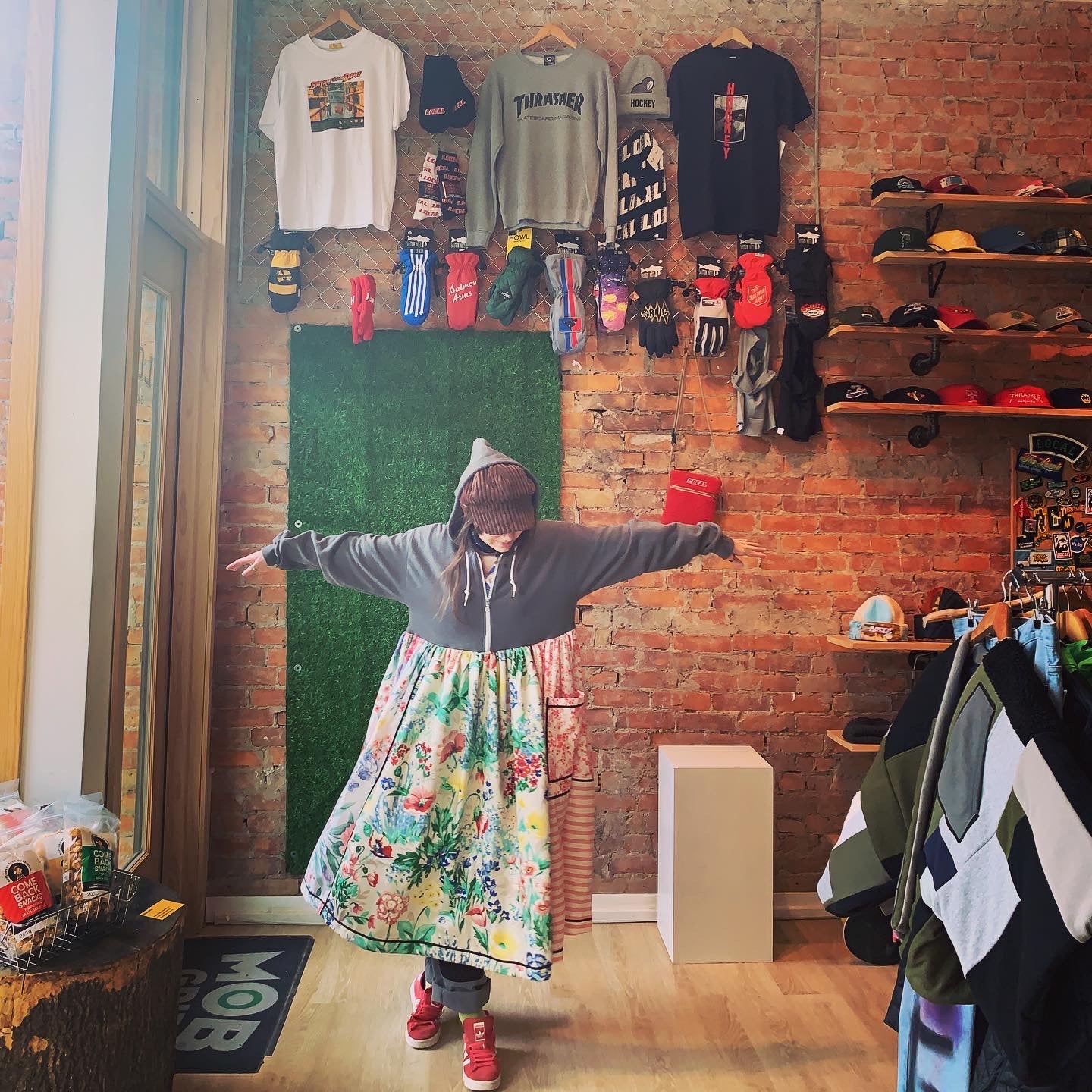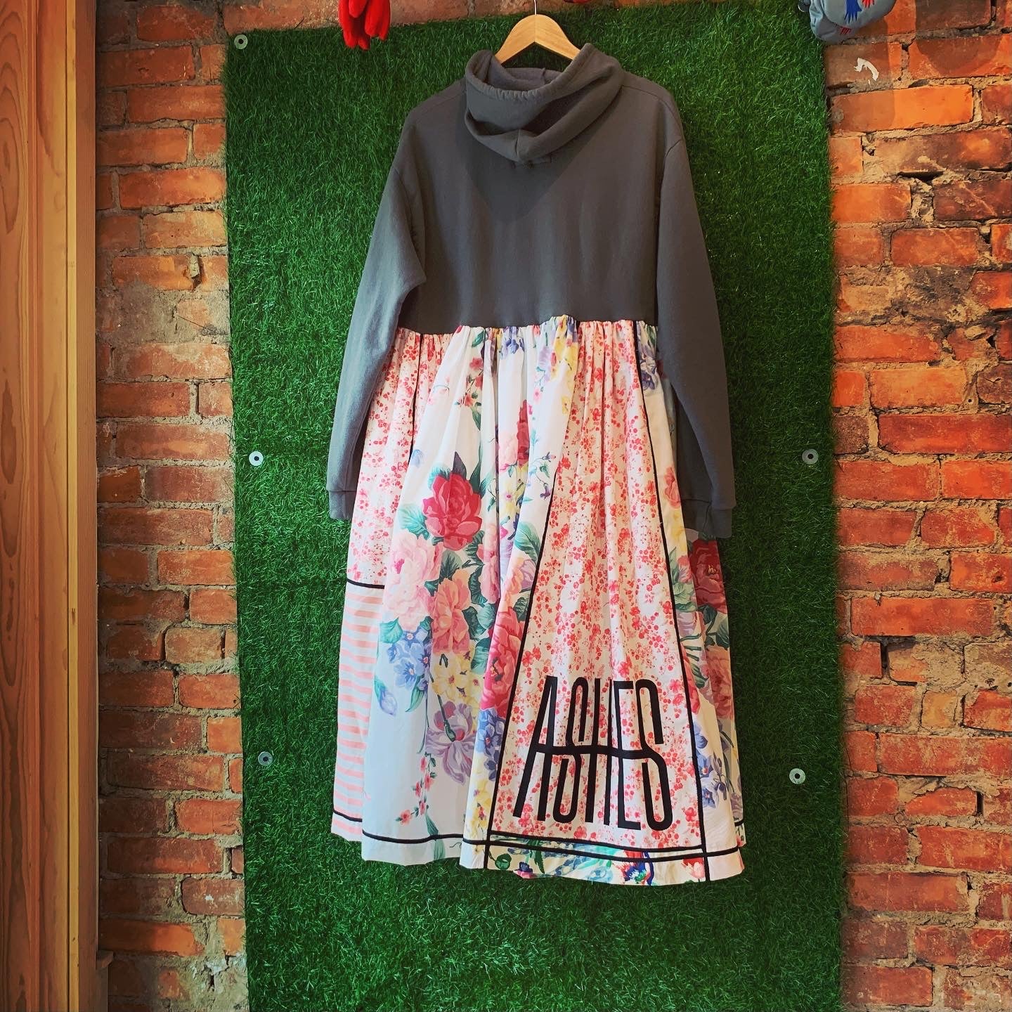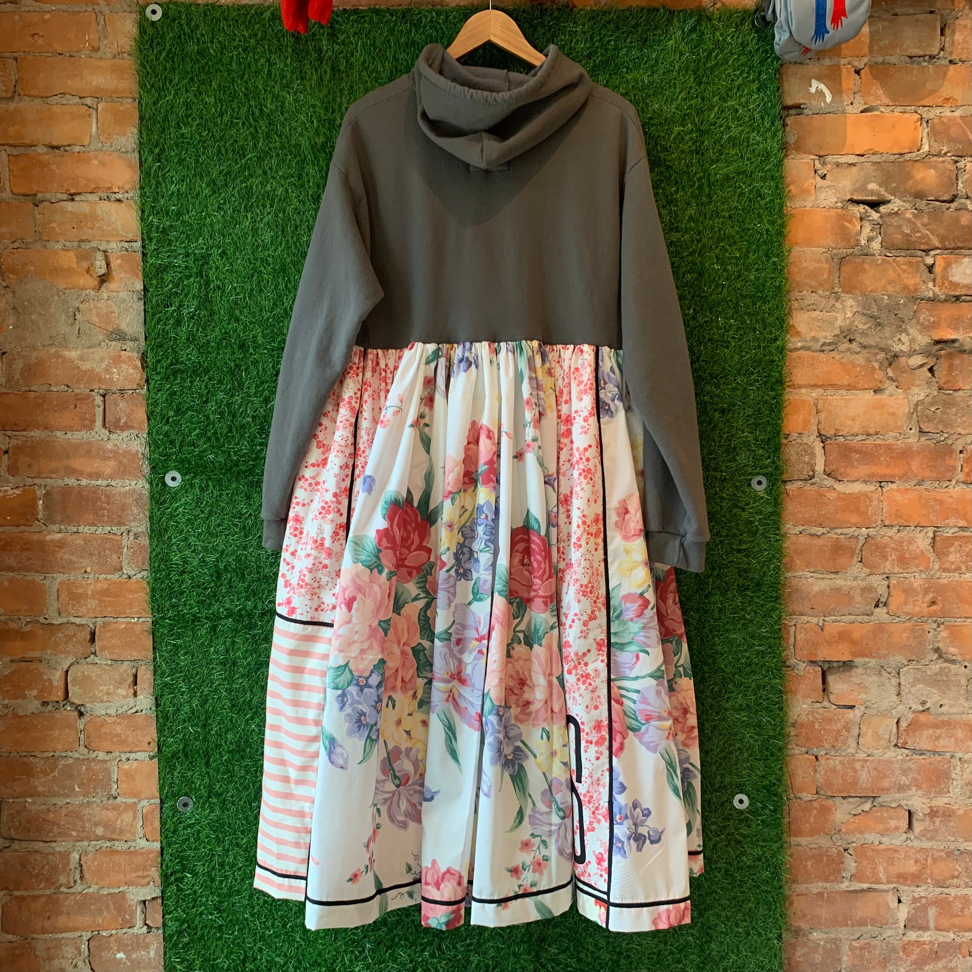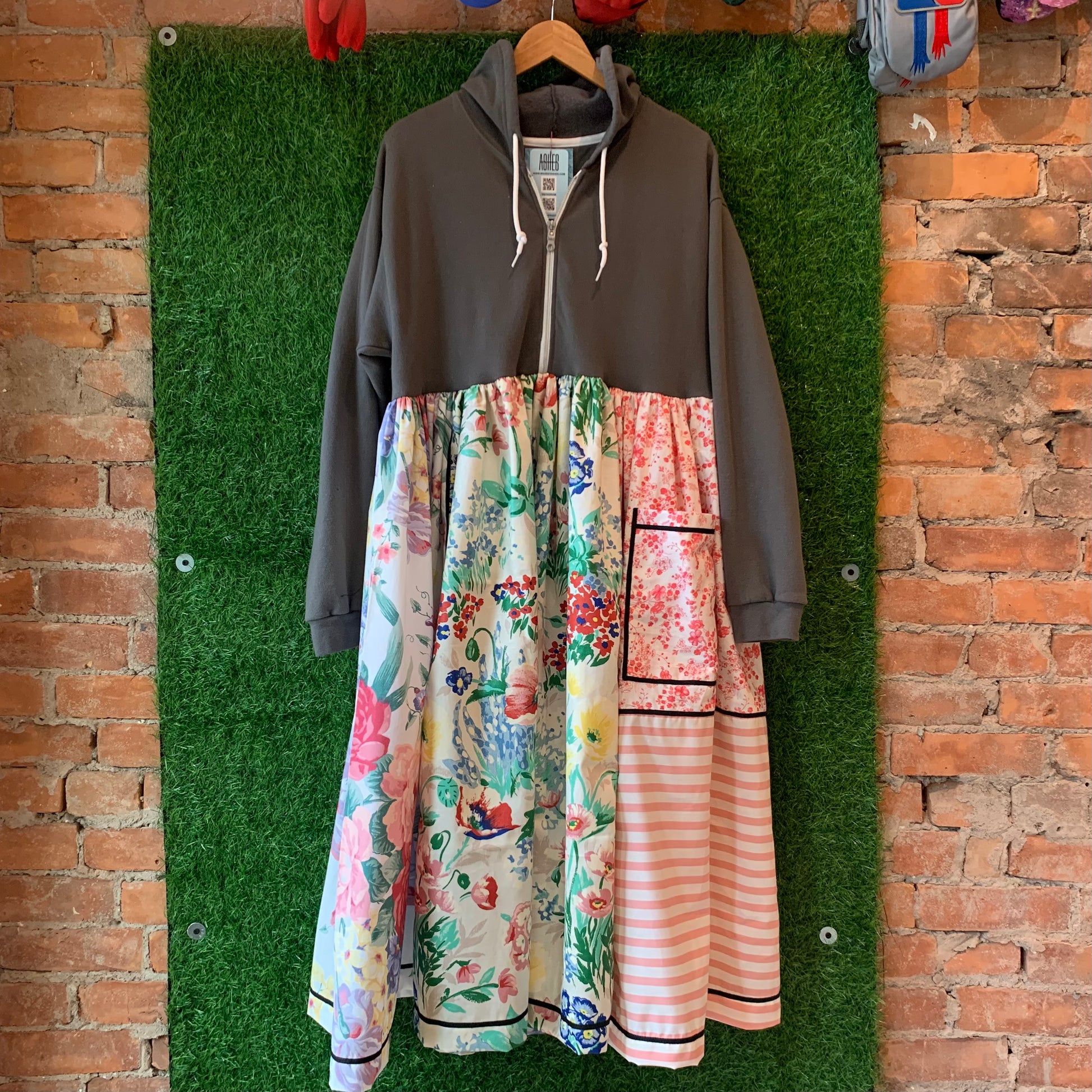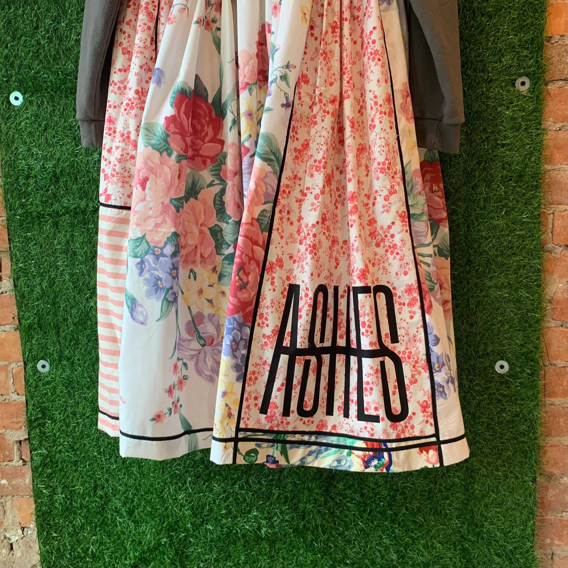 Patchwork gathered bottom with a mixture of floral cottons. Black cotton detailing stitched over seams. Front patch pocket.