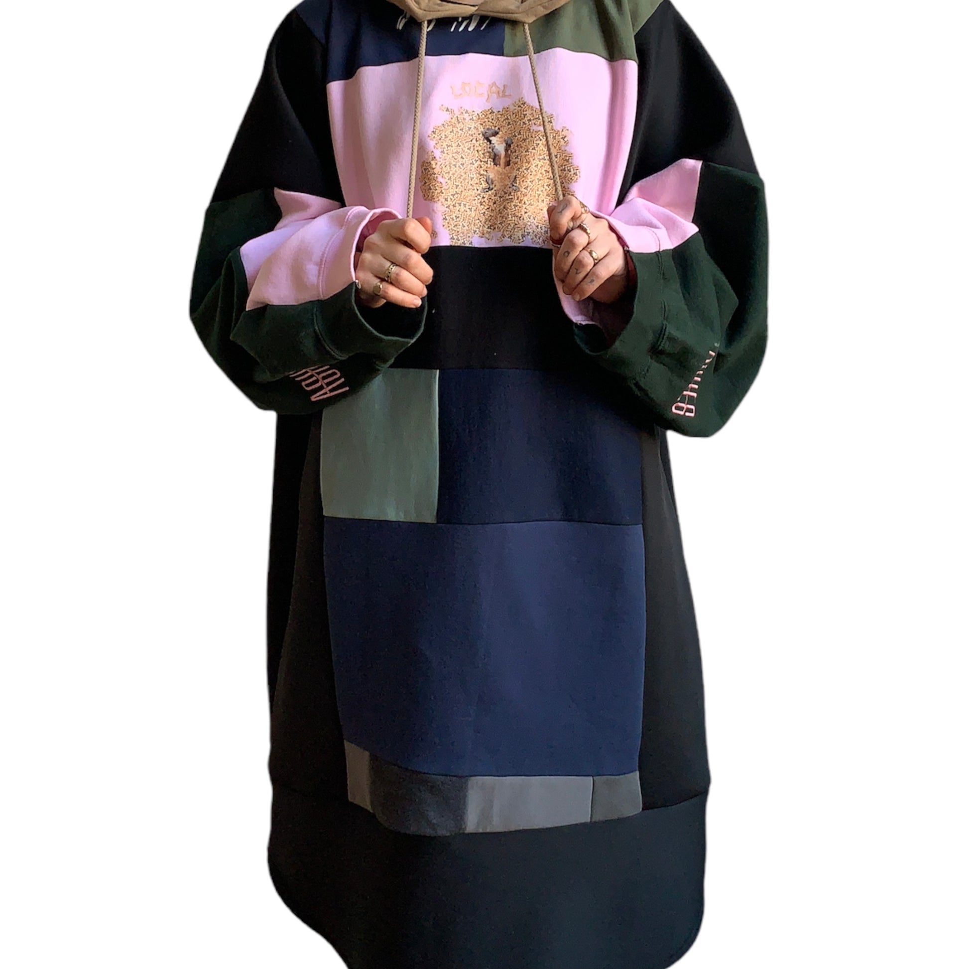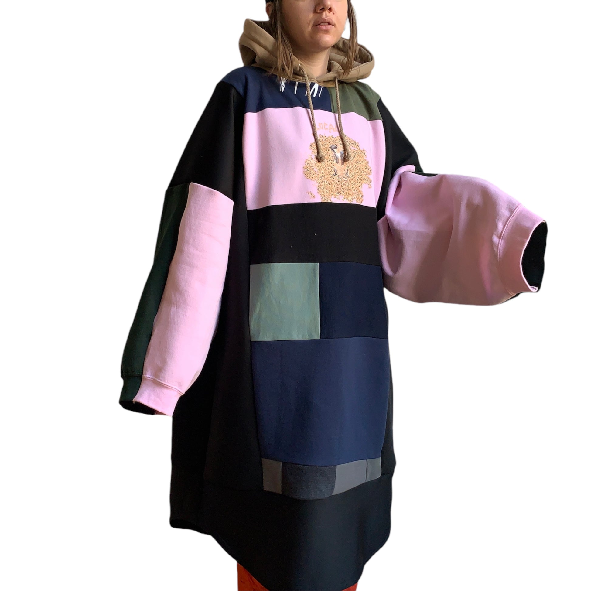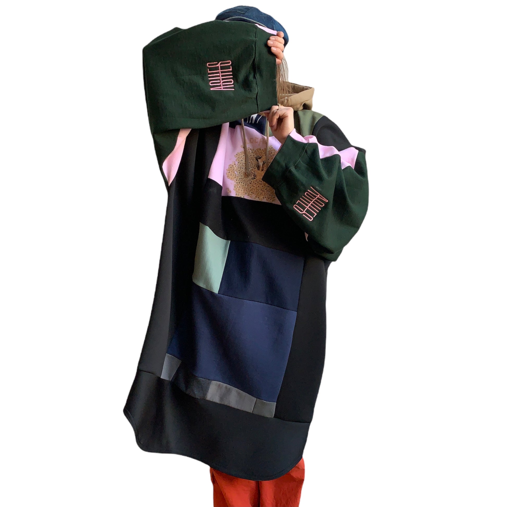 One of my main reasons for creating is using what’s around me. Taking the left behind and creating new and better. Started with a sweater from The Local Skate Shop that had a few stains on hood and was unsellable as is. Based this squared away MEGA HOODIE around it.