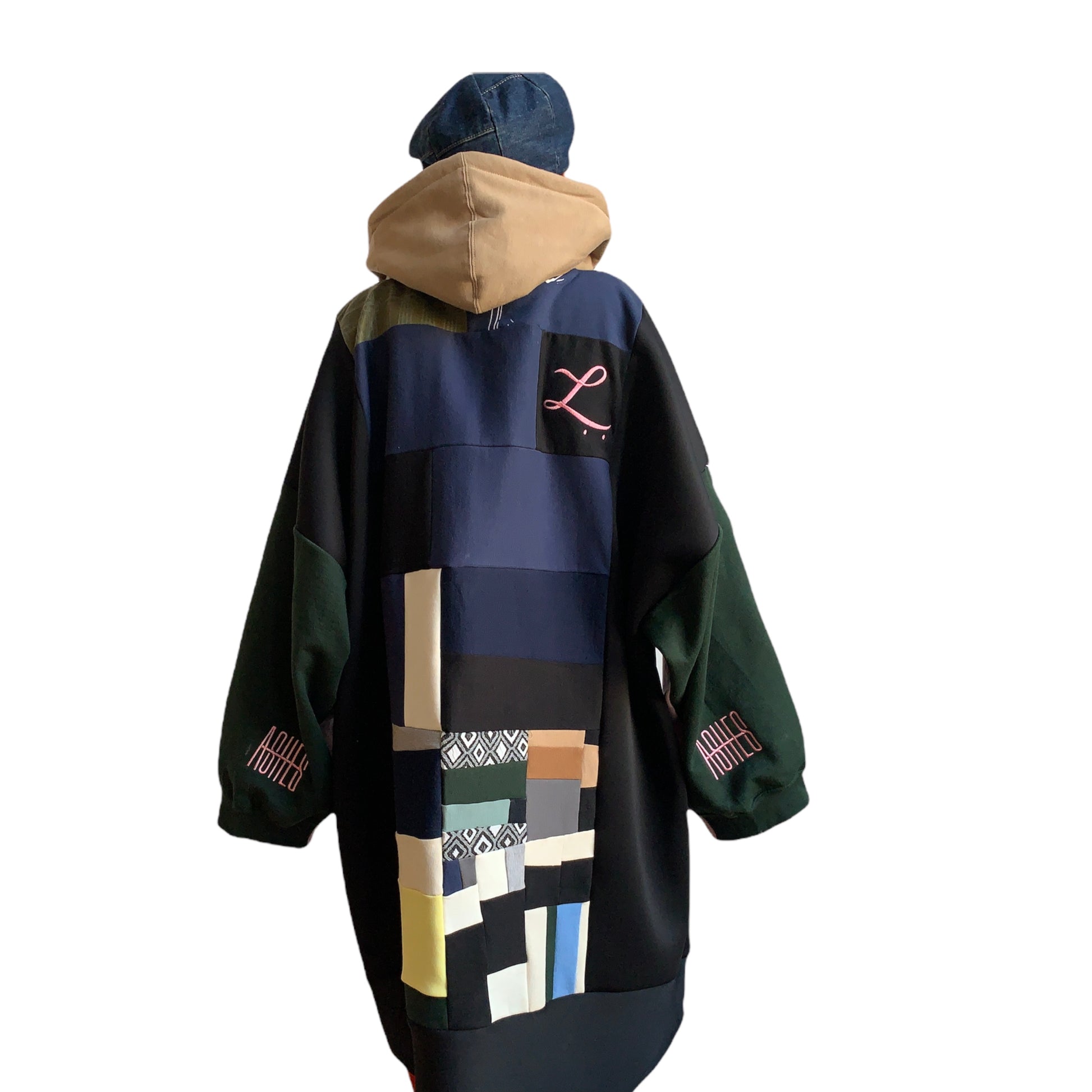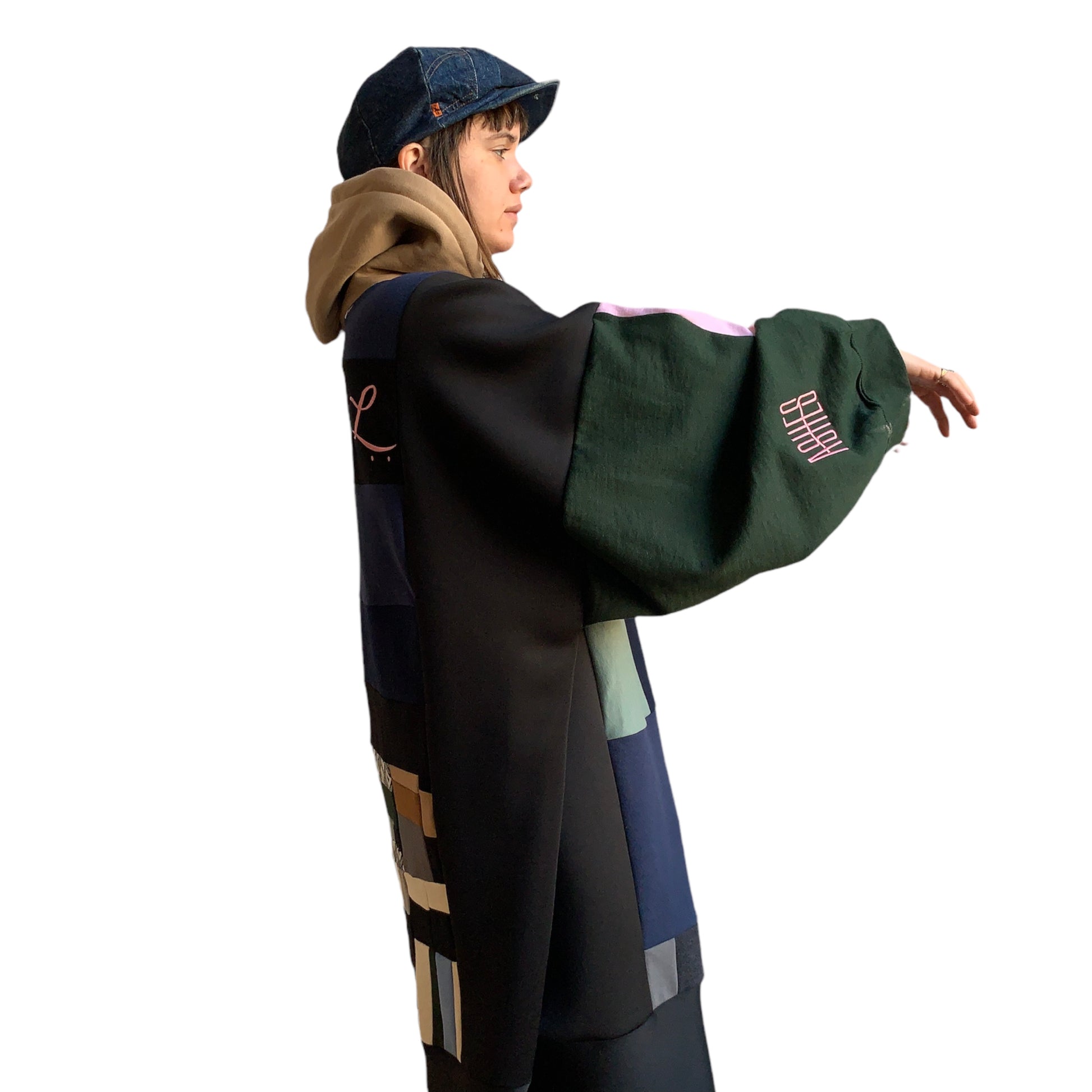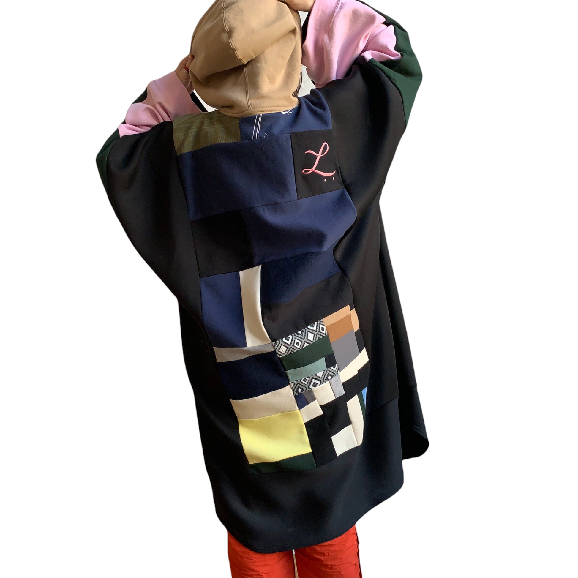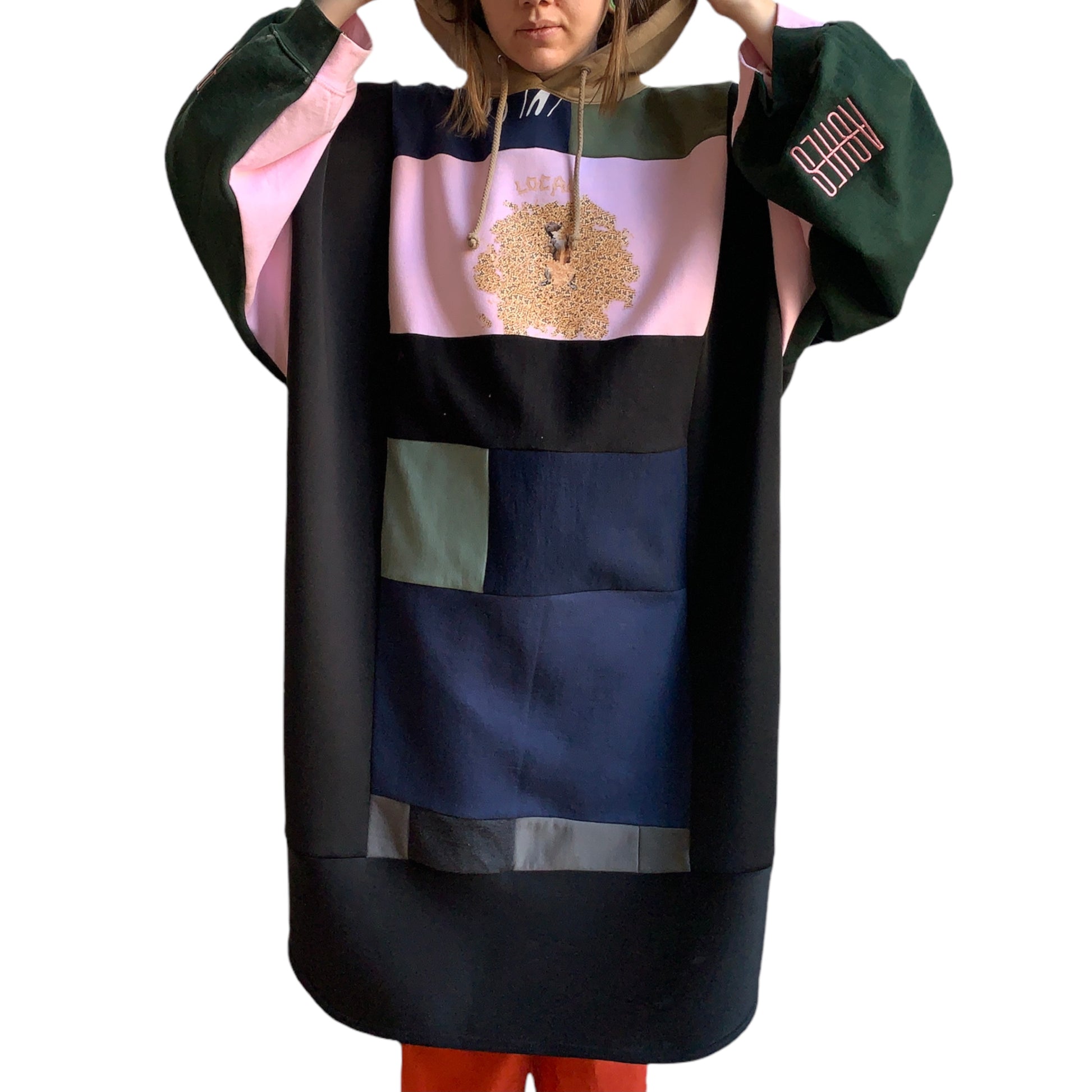 One of my main reasons for creating is using what’s around me. Taking the left behind and creating new and better. Started with a sweater from The Local Skate Shop that had a few stains on hood and was unsellable as is. Based this squared away MEGA HOODIE around it.