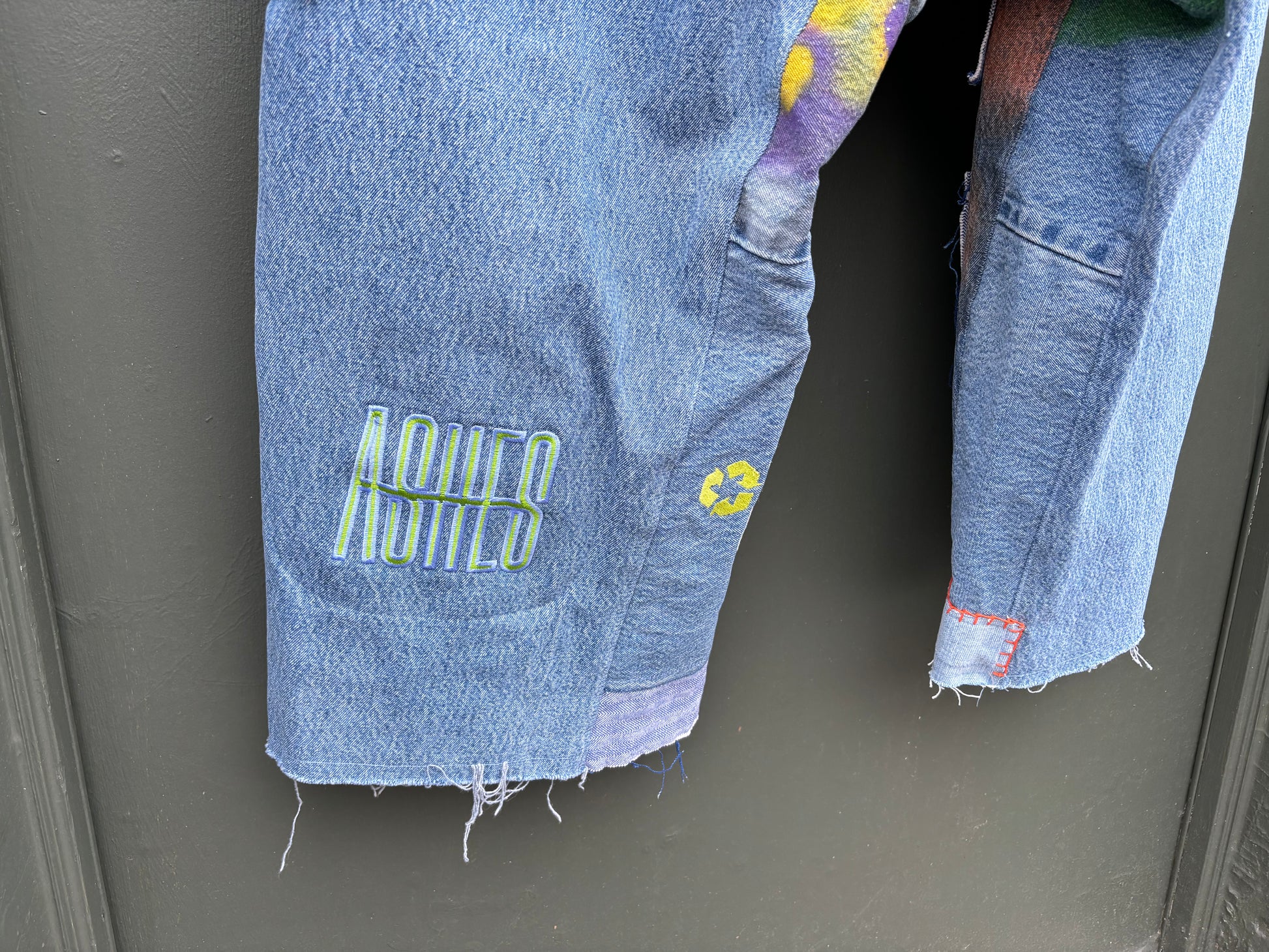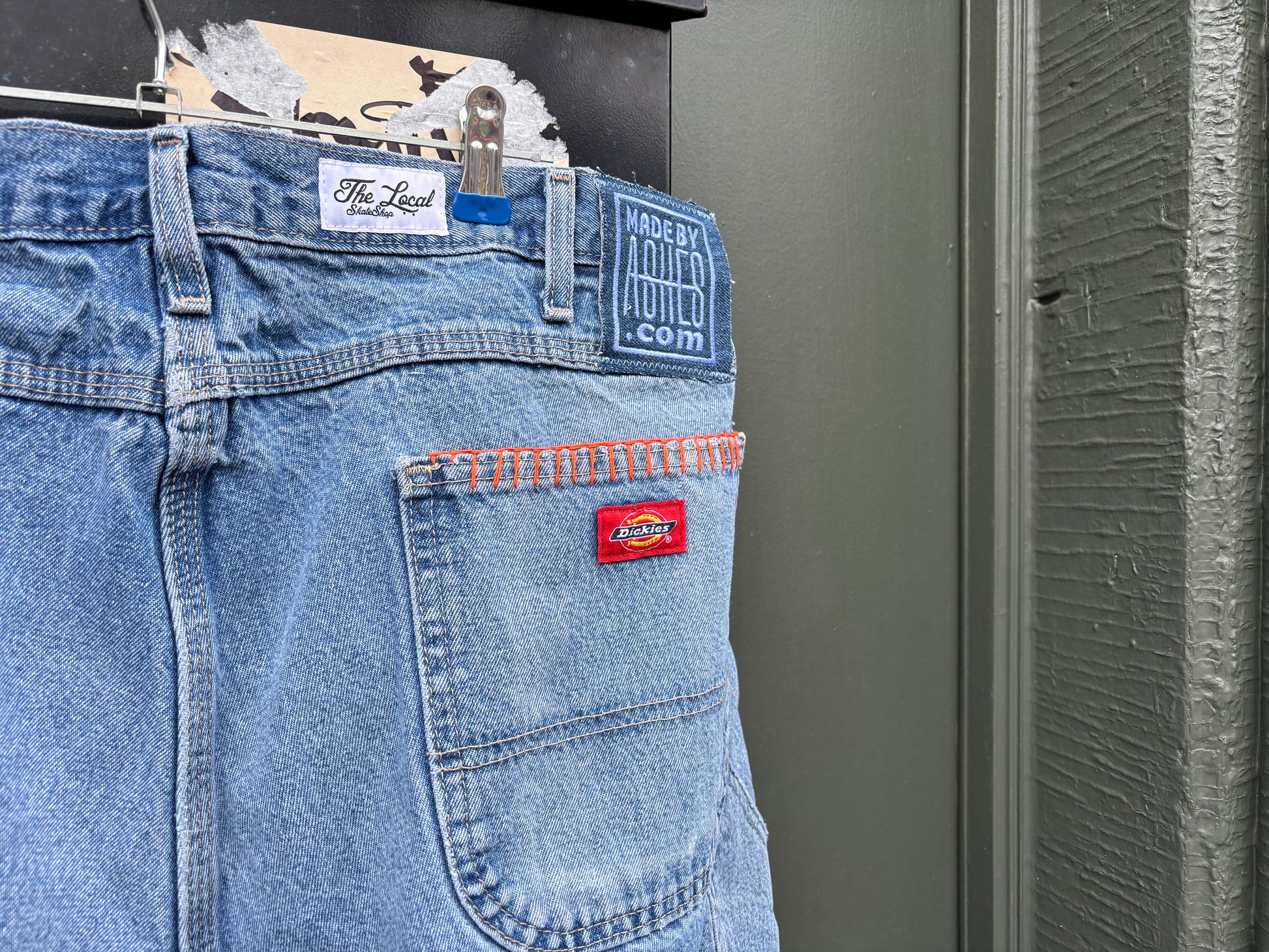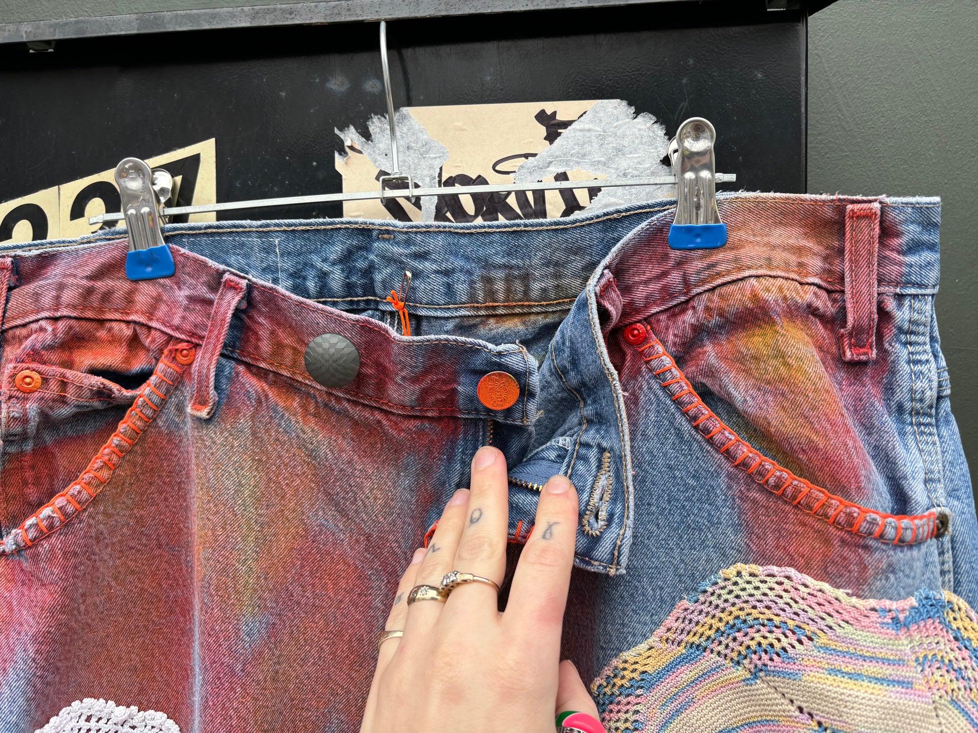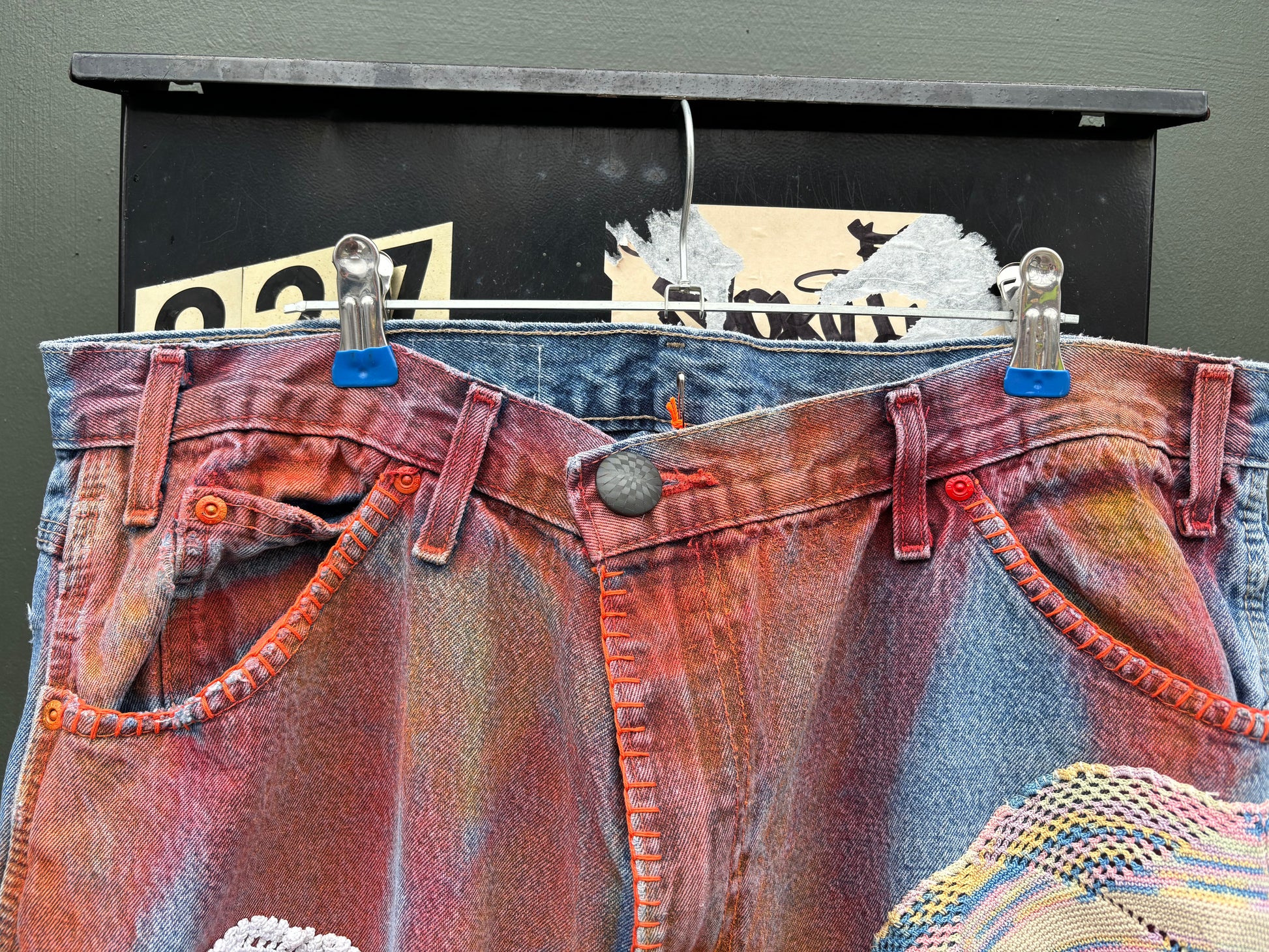 Modified Dickies denim pants turned into low rise drop crotch. Altered into a smaller adjustable size with button closure at front. Fits between 36-38”waist. Heavily loved jeans with patchwork denim details throughout. Spray painted collab with The Local Skate Shop. Decorative orange hand stitched thread throughout. Super wide and left with raw hem ( stitch line around to prevent additional fraying) Vintage doilies hand stitched throughout.