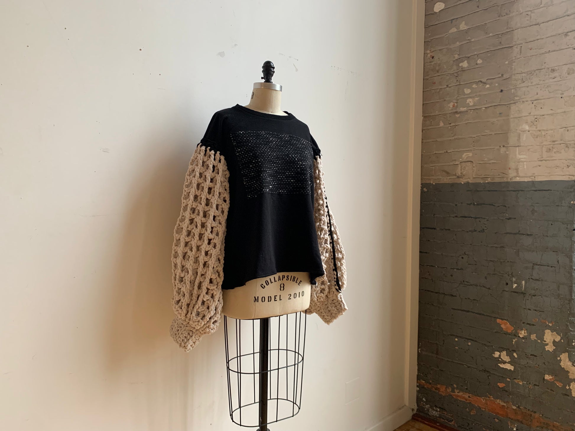 M218 - CROCHET SWEATER - BLACK SWEATER W/ CREAM SLEEVES