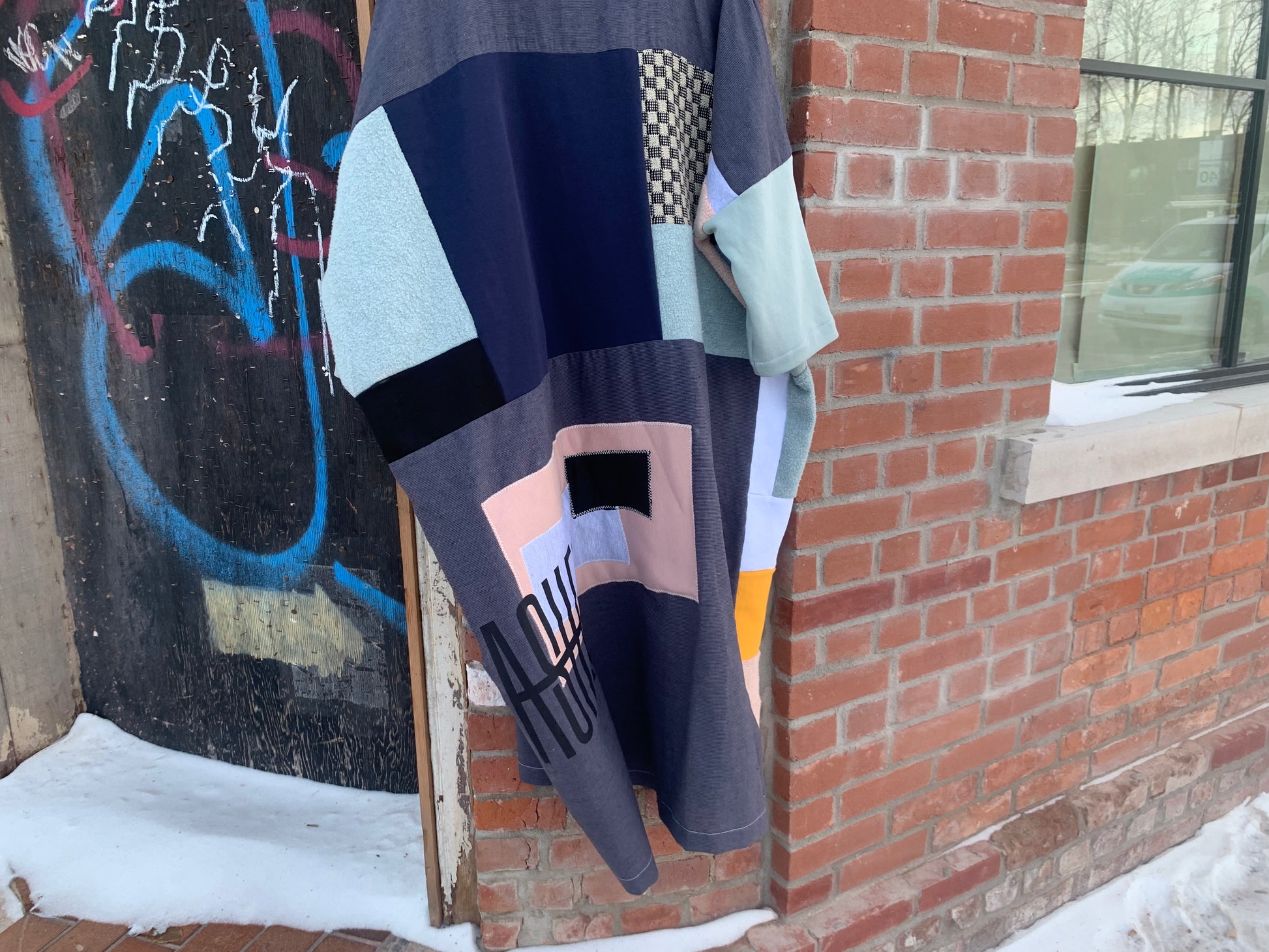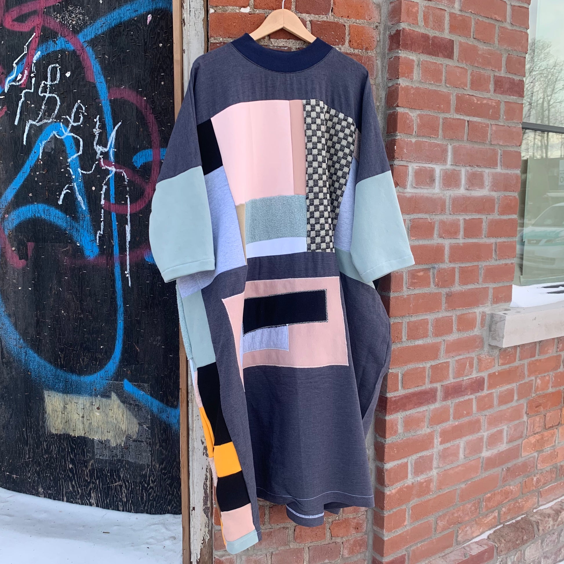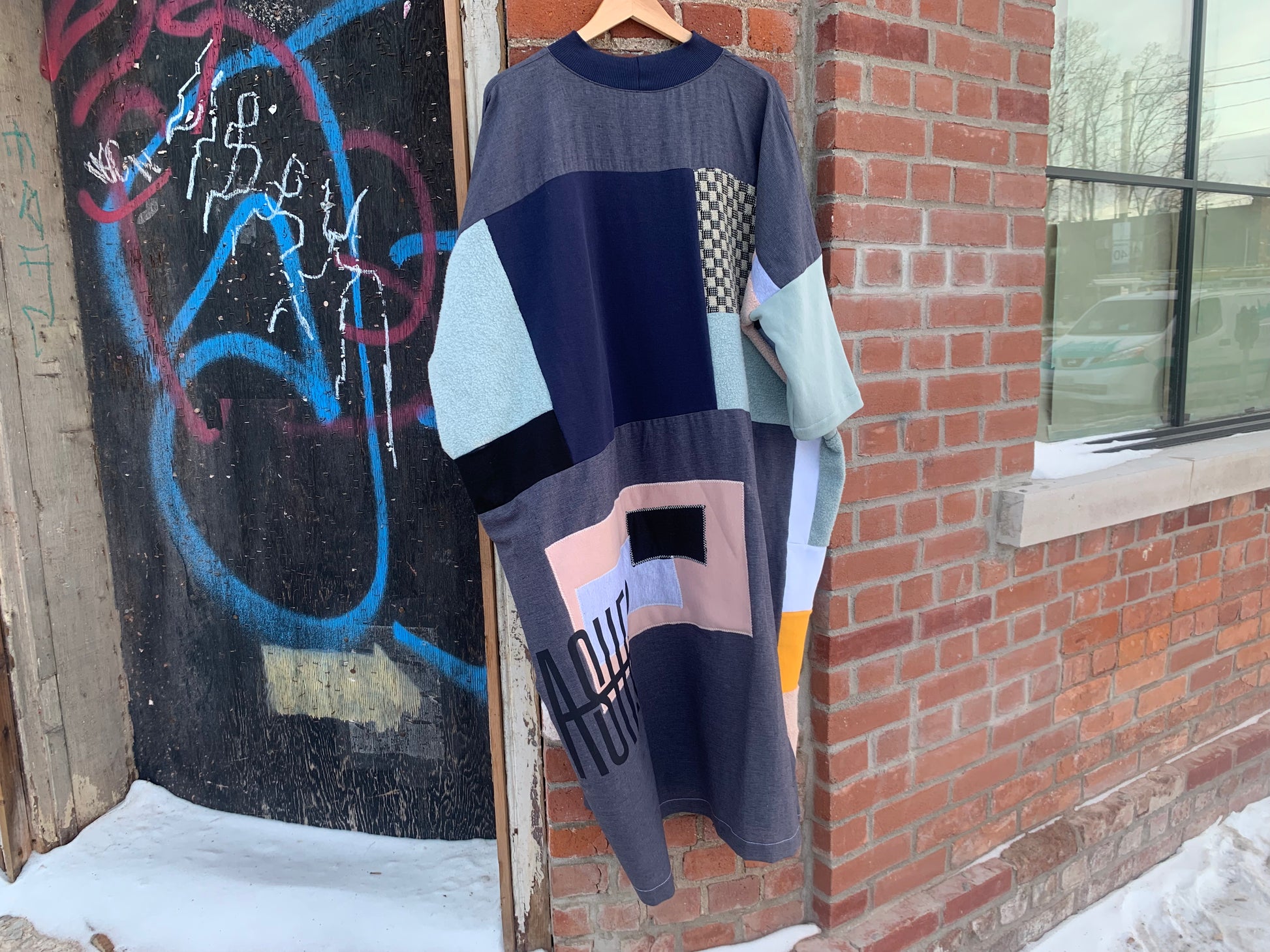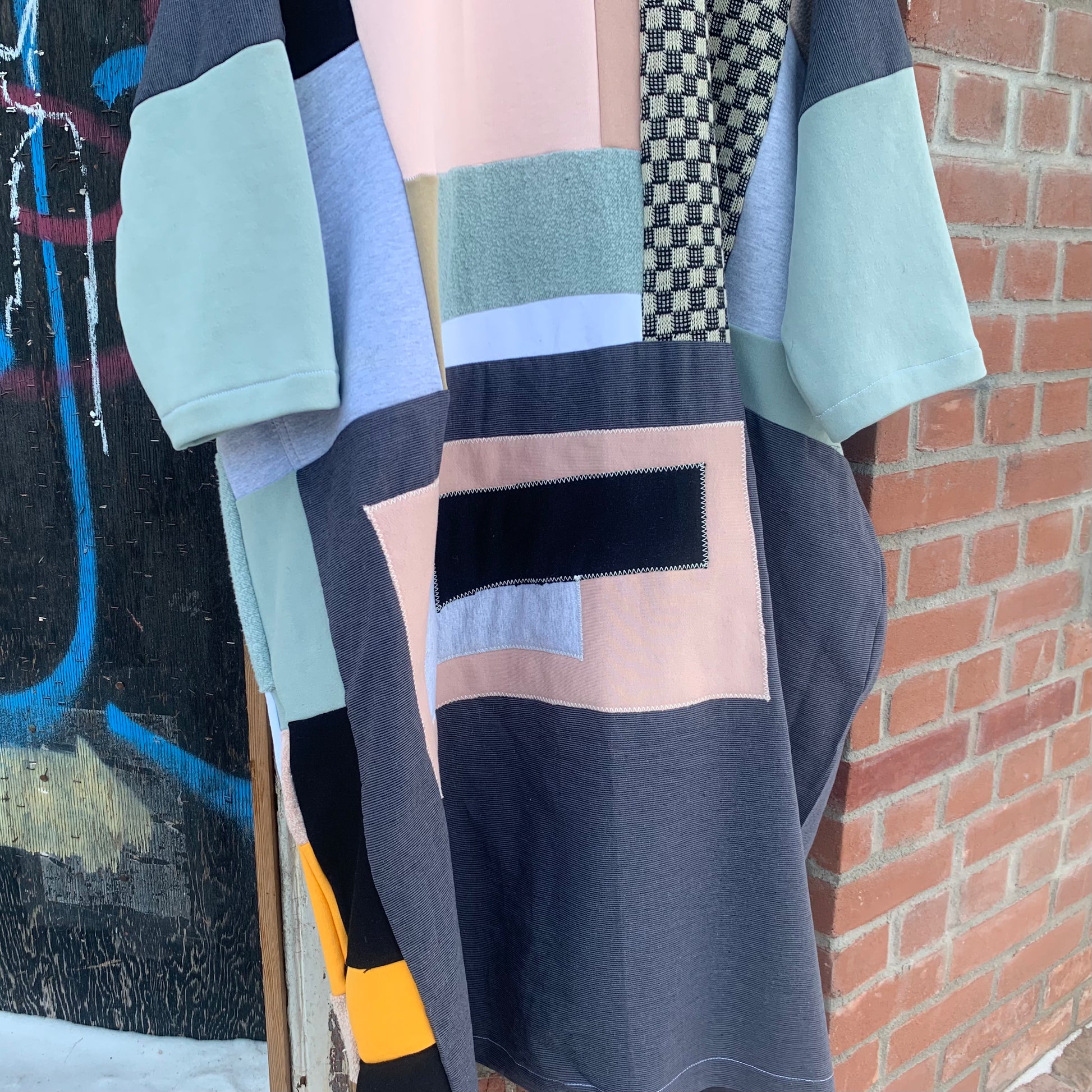 Full length with asymmetrical pockets. All made in flow state with upcycled materials. A combination of knit and grey micro pinstriped woven cotton. Completely one of a kind and unique.