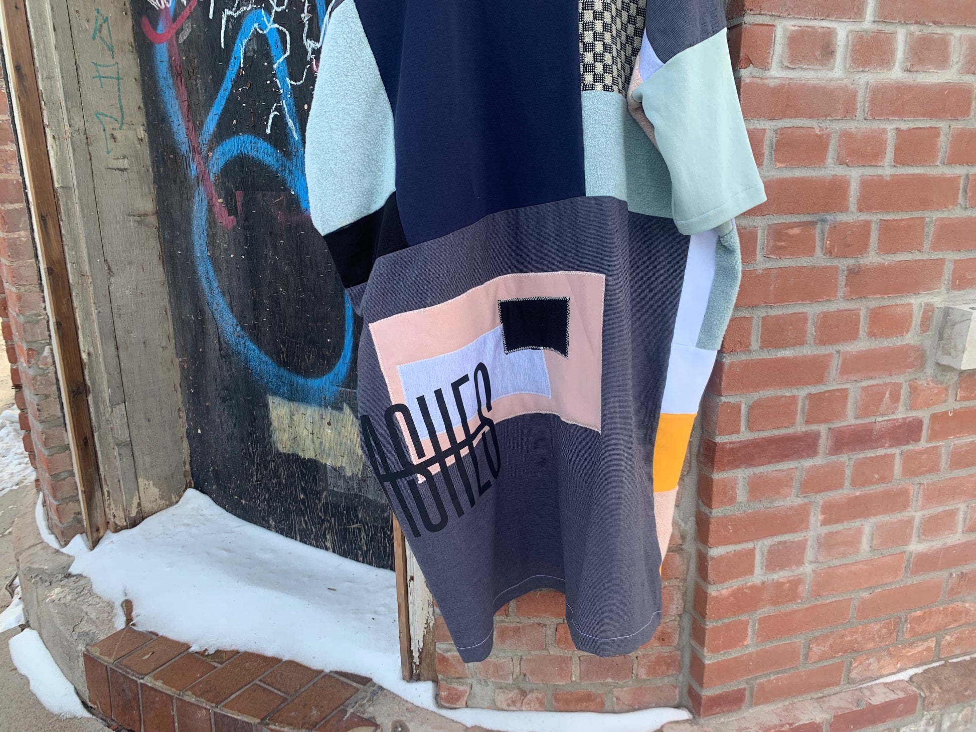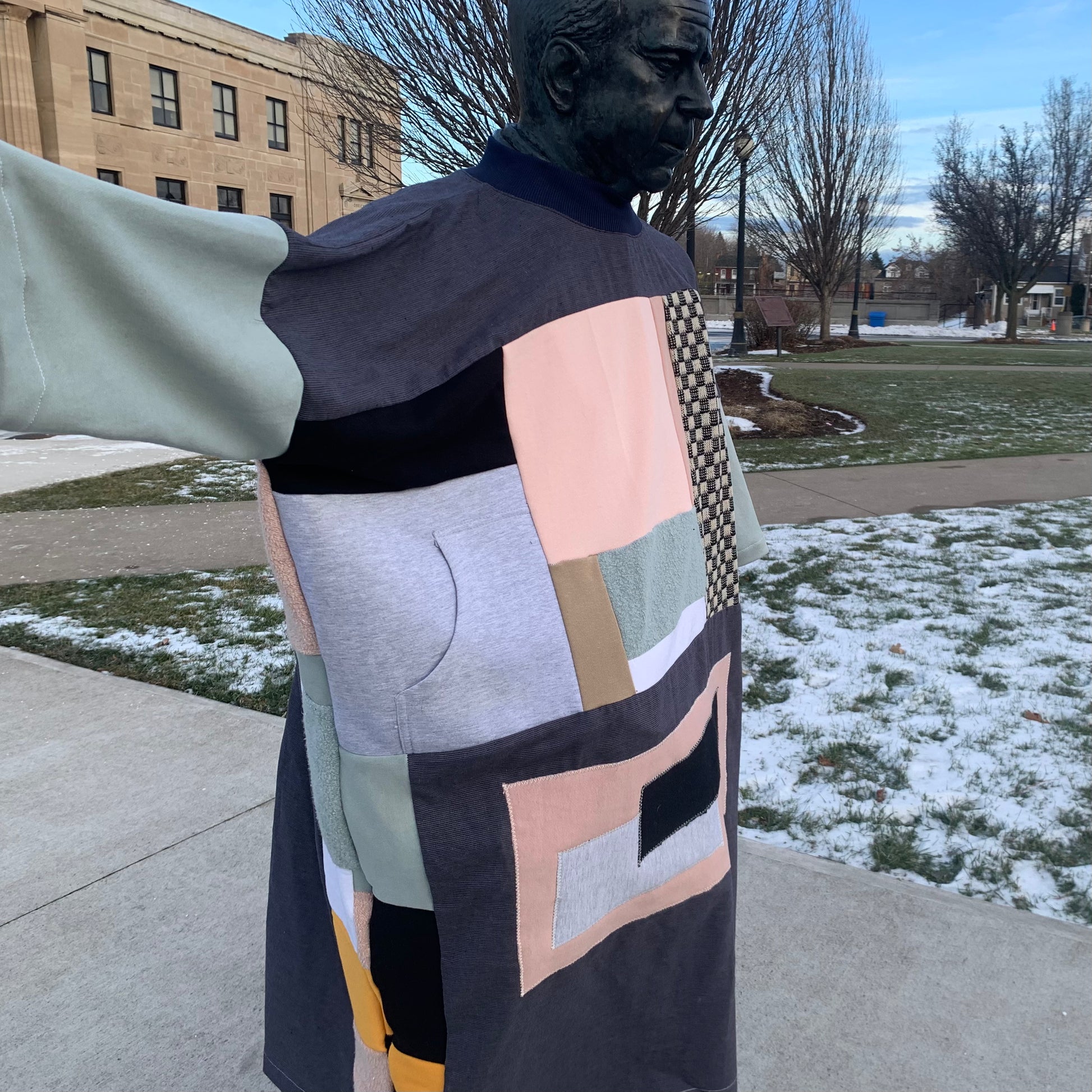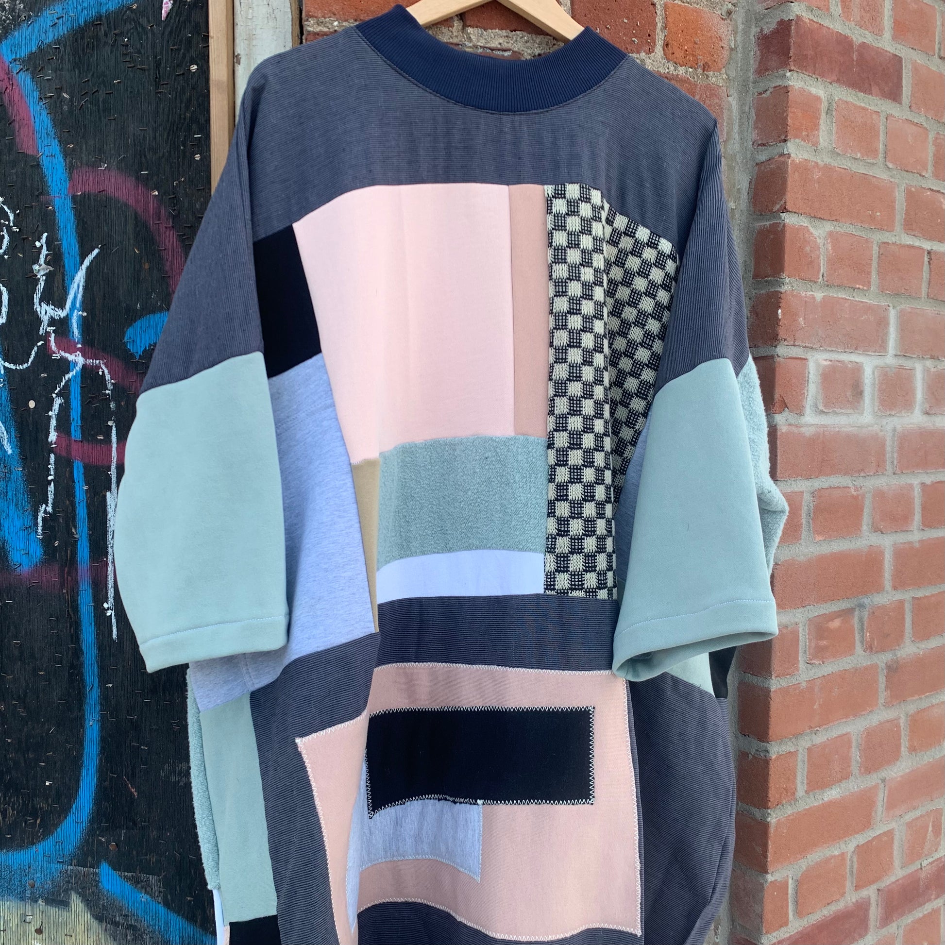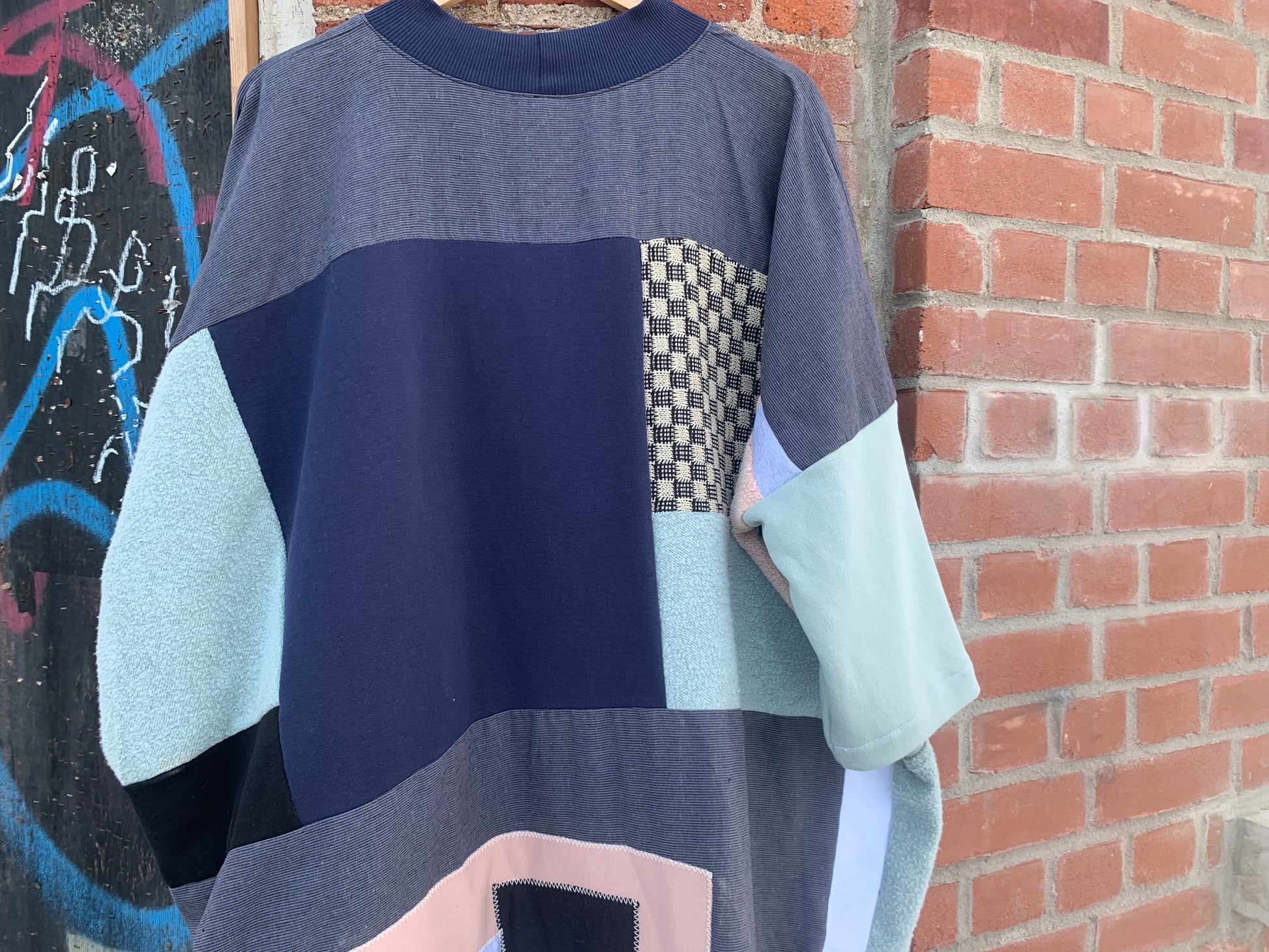 Full length with asymmetrical pockets. All made in flow state with upcycled materials. A combination of knit and grey micro pinstriped woven cotton. Completely one of a kind and unique.