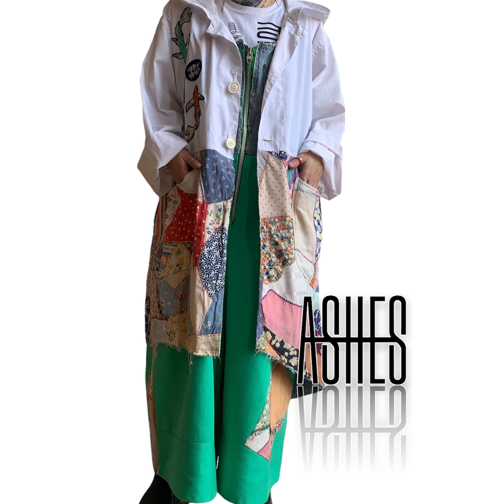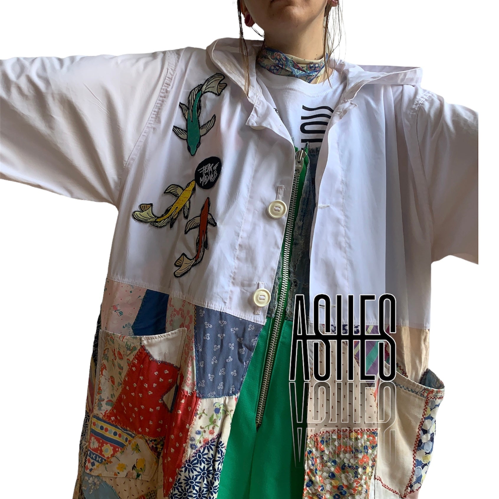 Koi fish patches and circular “fear of madness” embroidered patch on front.