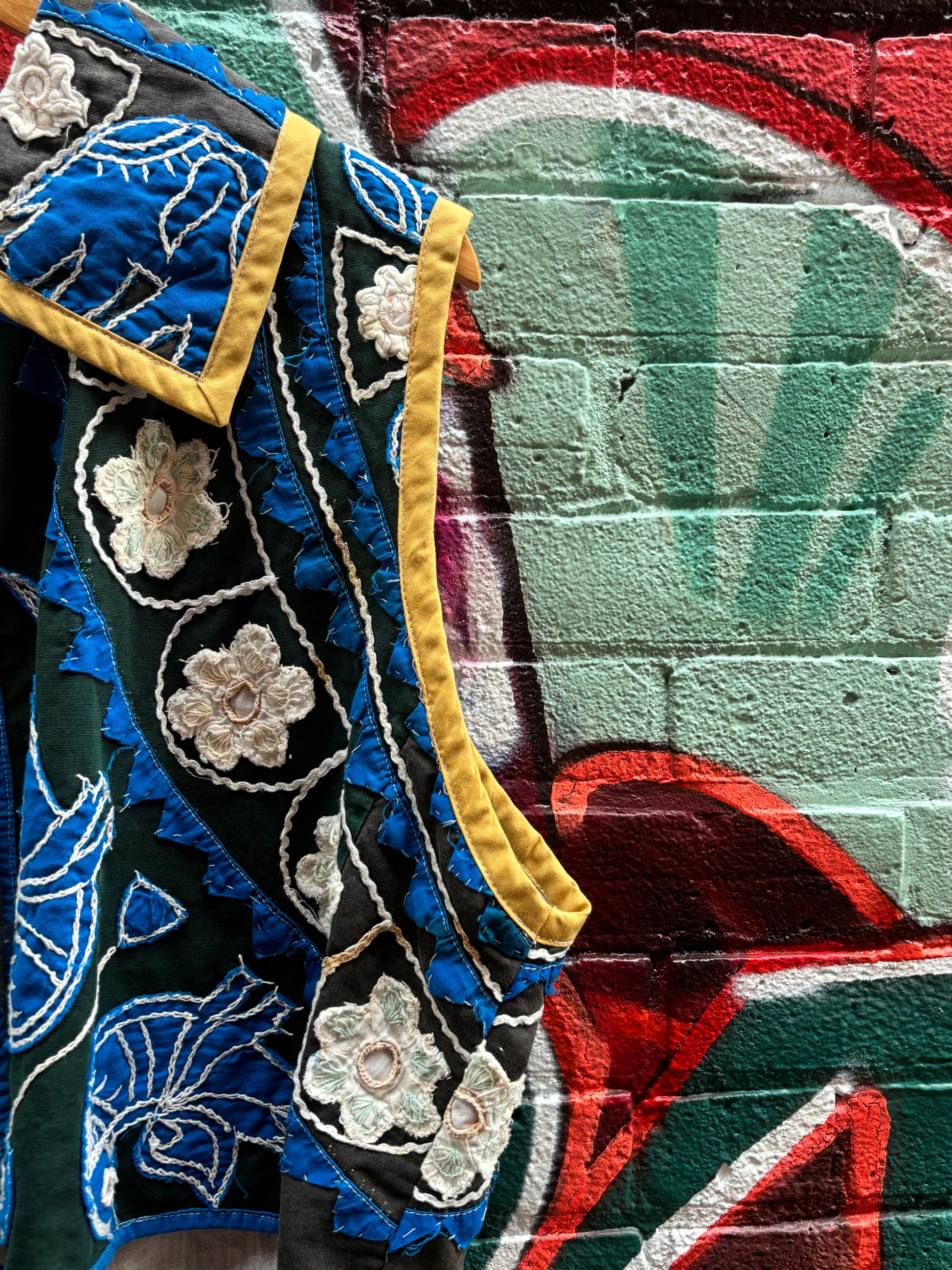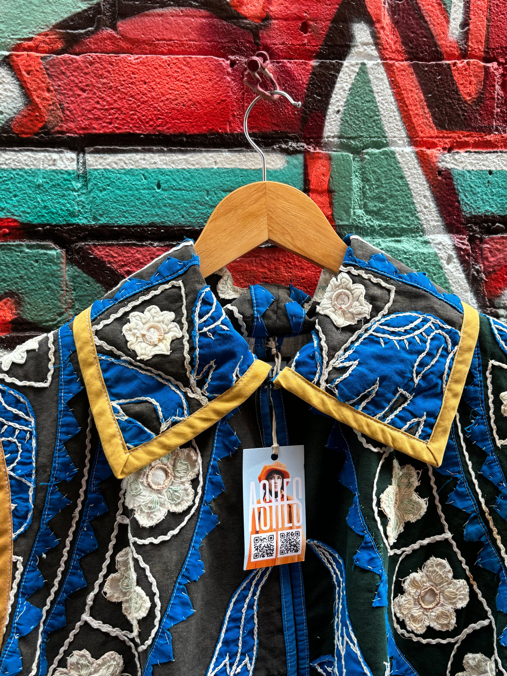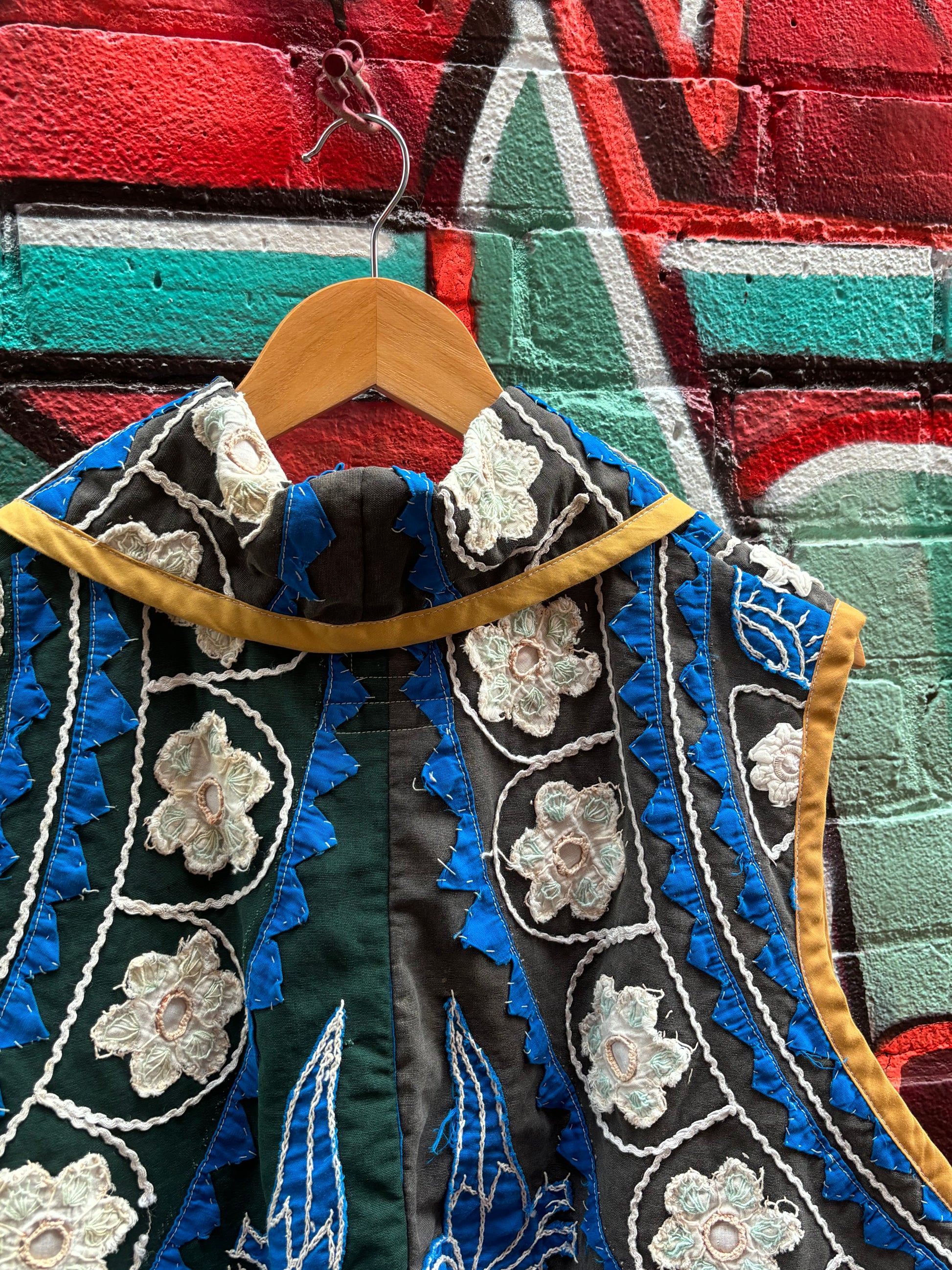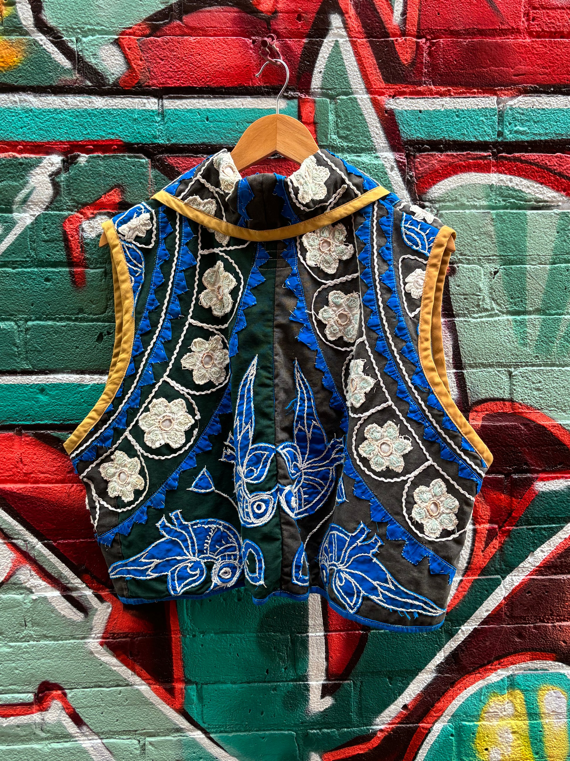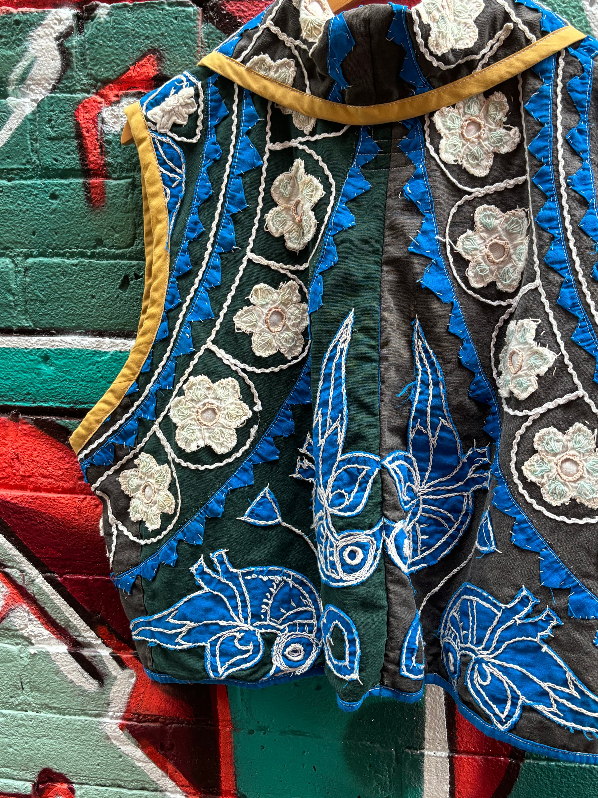 Beautiful quilted blanket upcycled into a vest. Mustard orange binding with hook and eye closure at top neck.