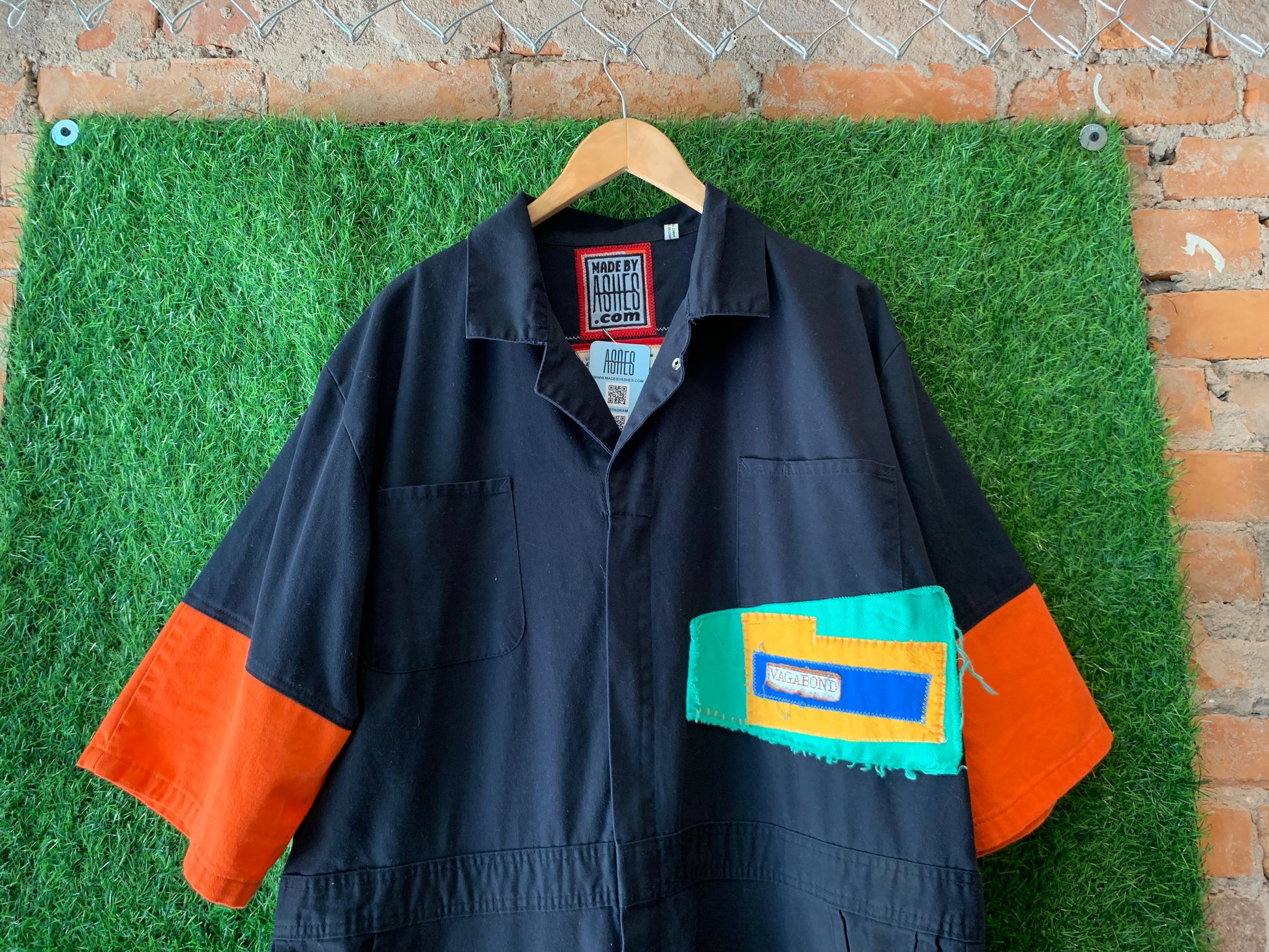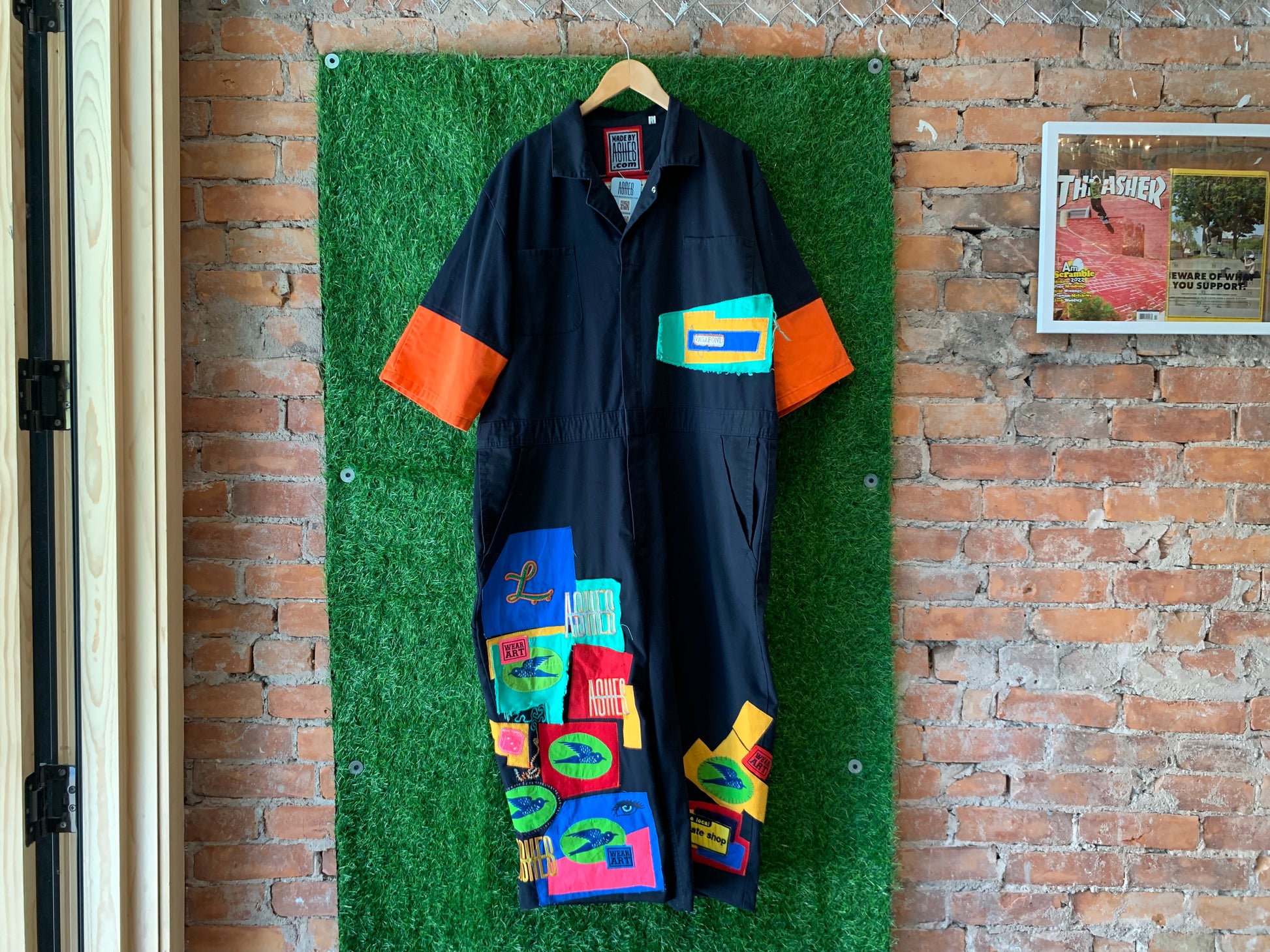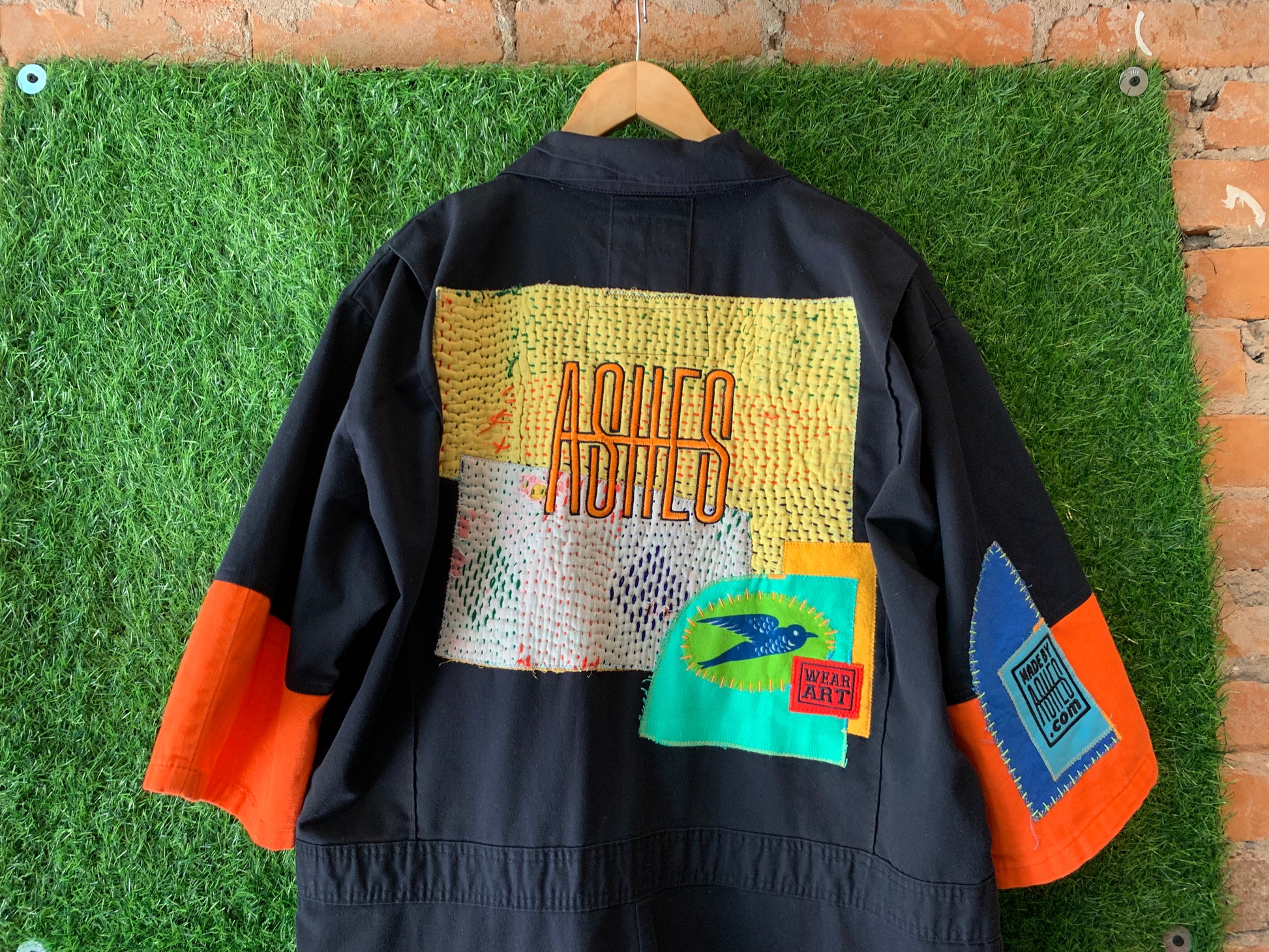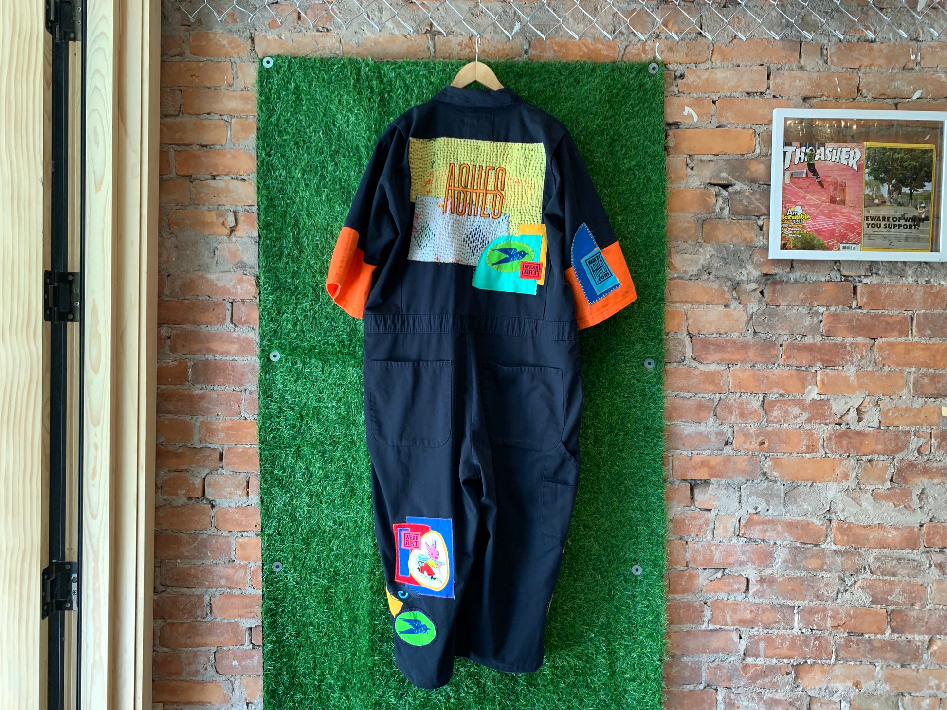 Made with CINTAS workwear jumpsuit. Modified citrus orange sleeves with shortened length and ASHES patchwork throughout.