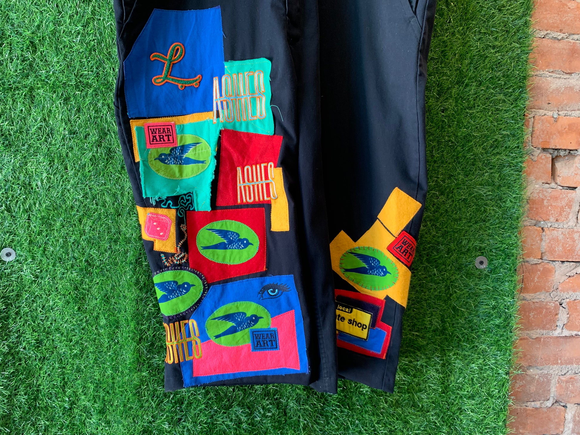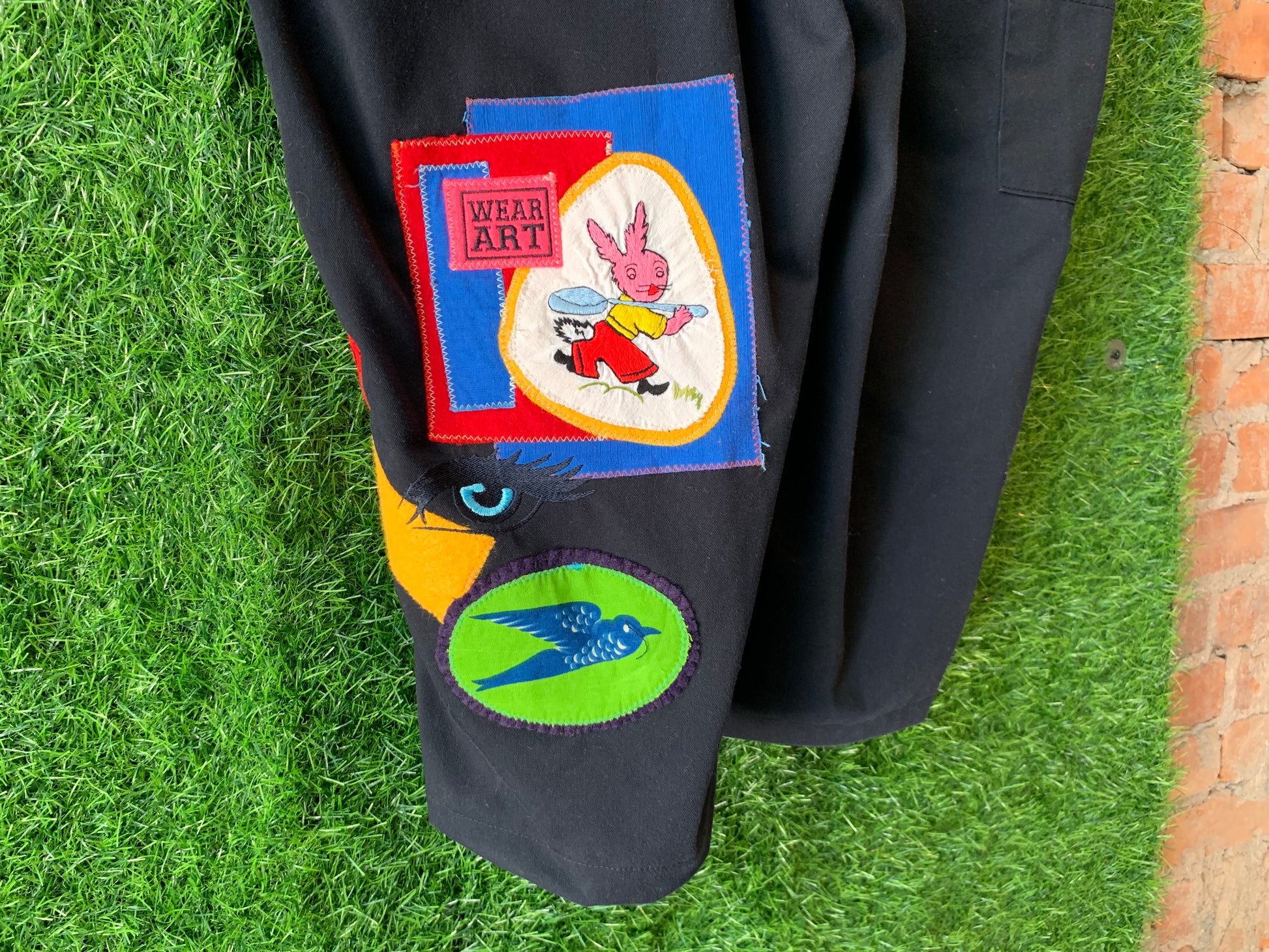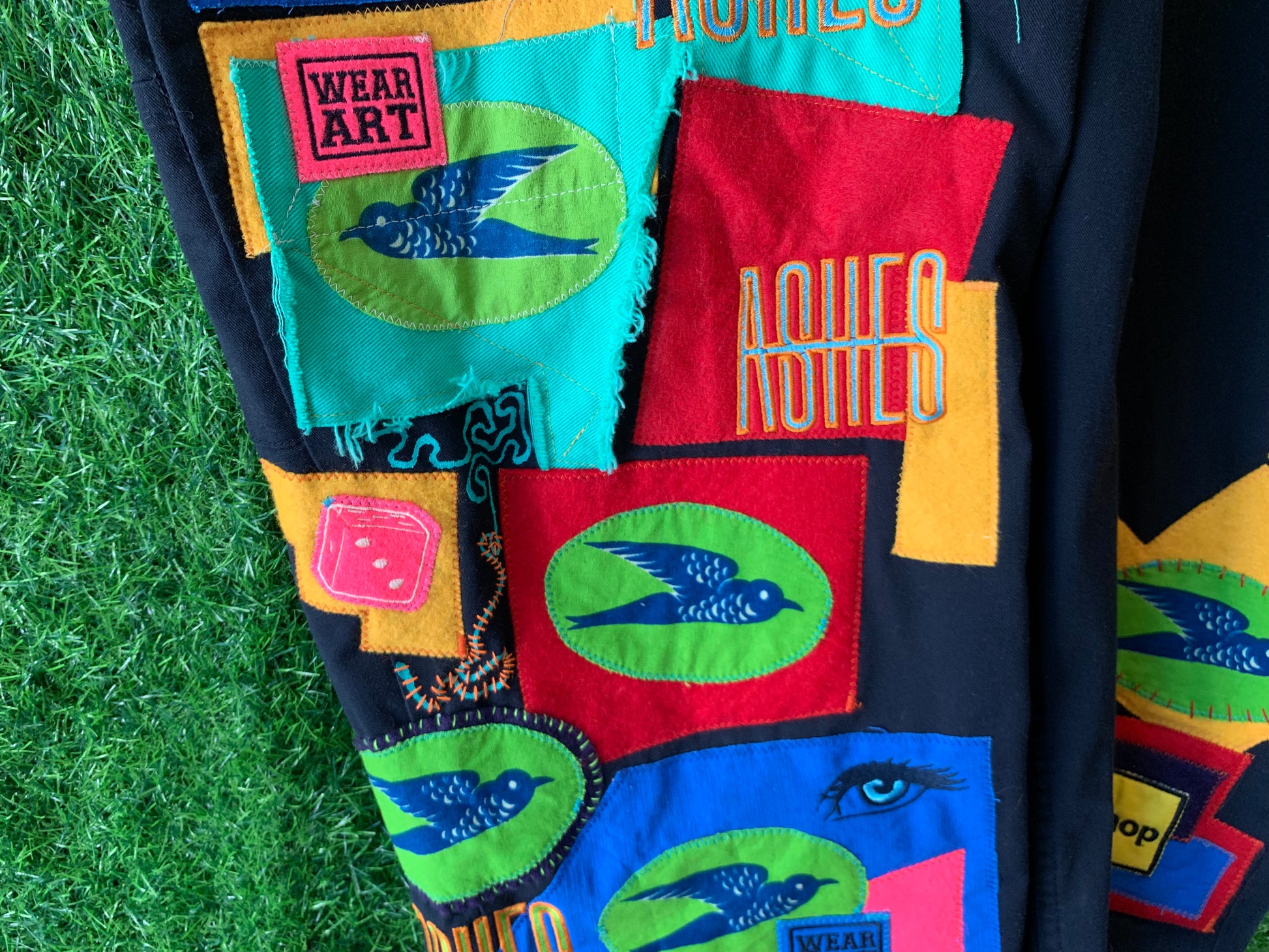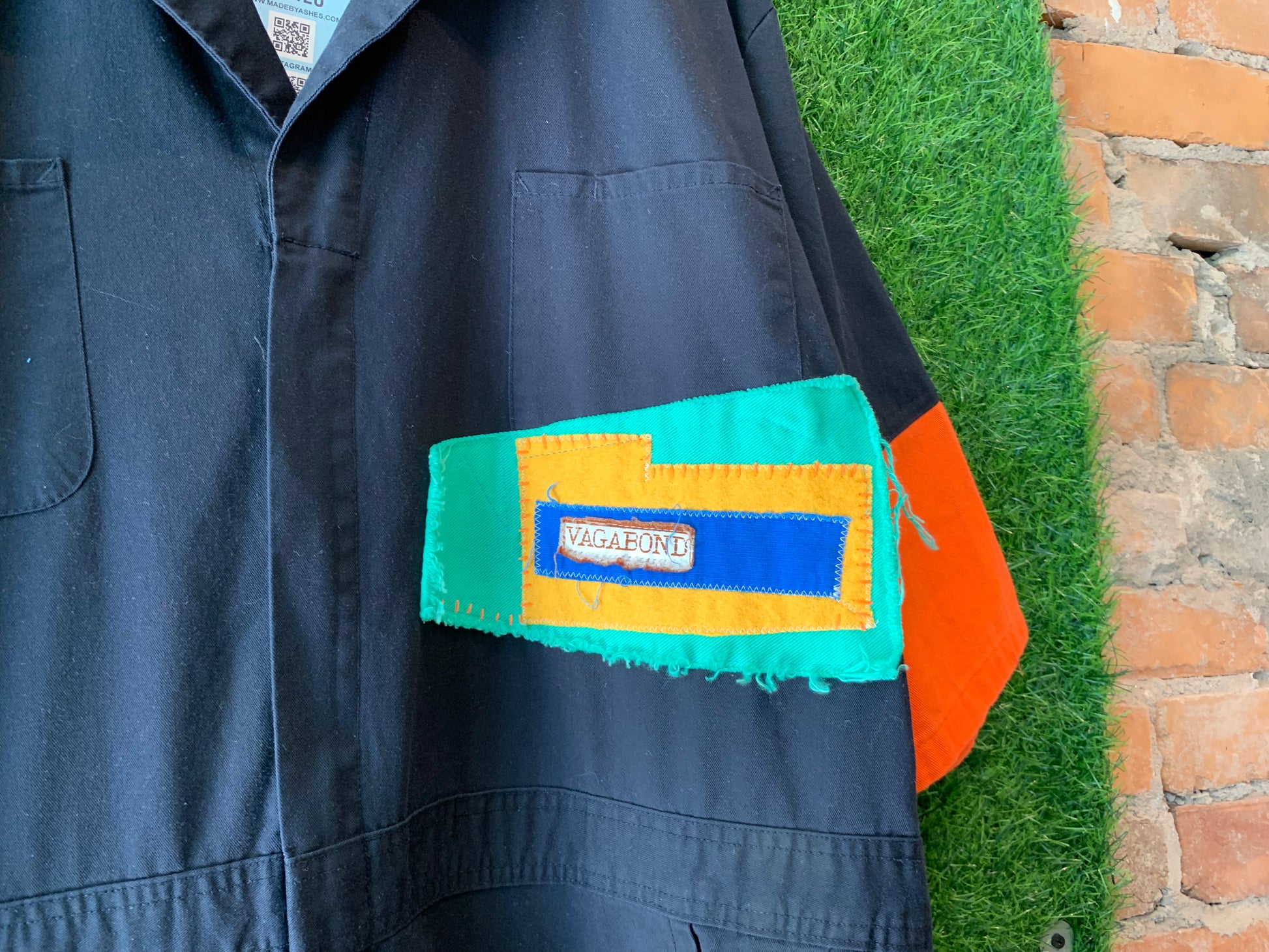 Made with CINTAS workwear jumpsuit. Modified citrus orange sleeves with shortened length and ASHES patchwork throughout.
