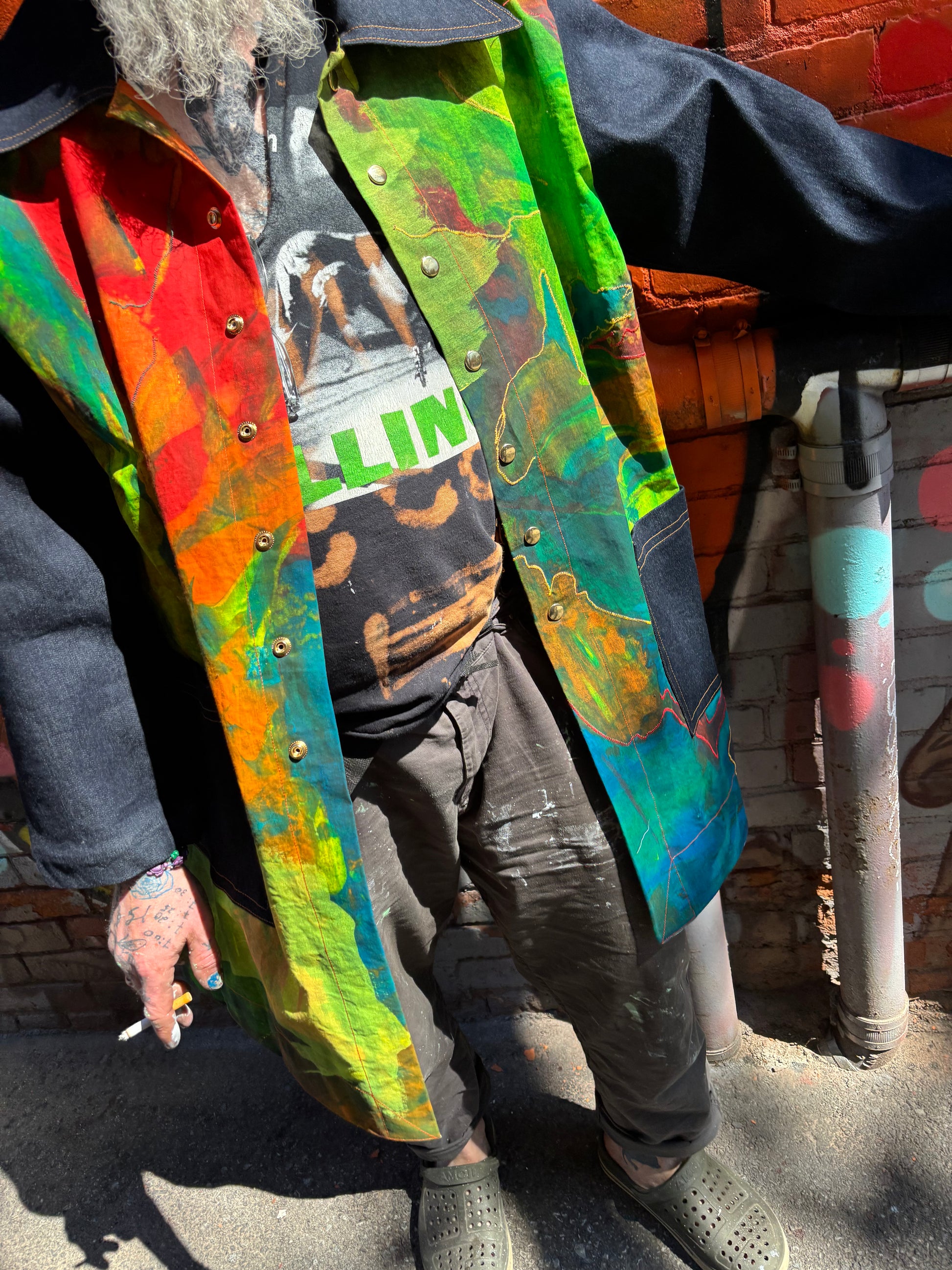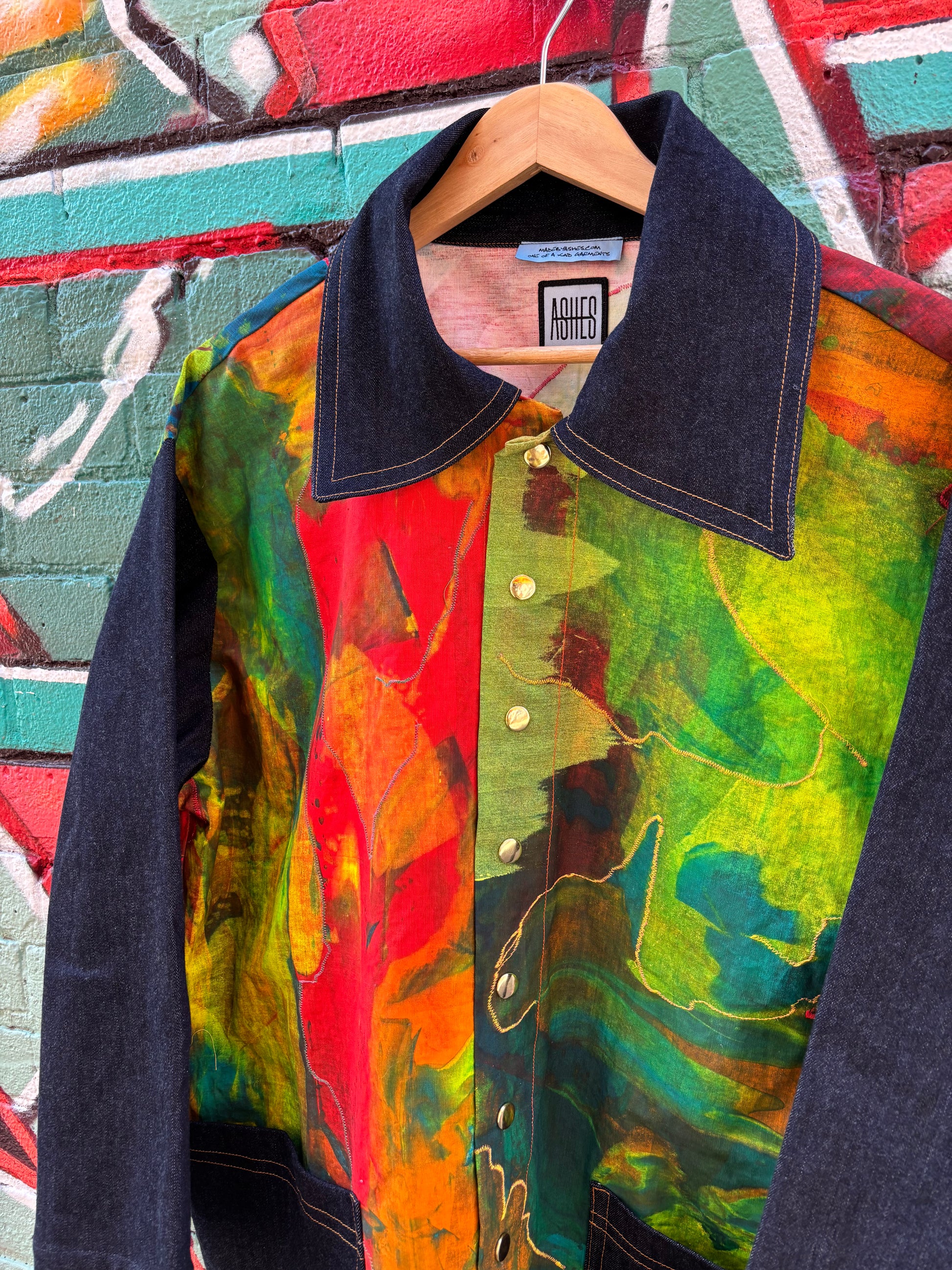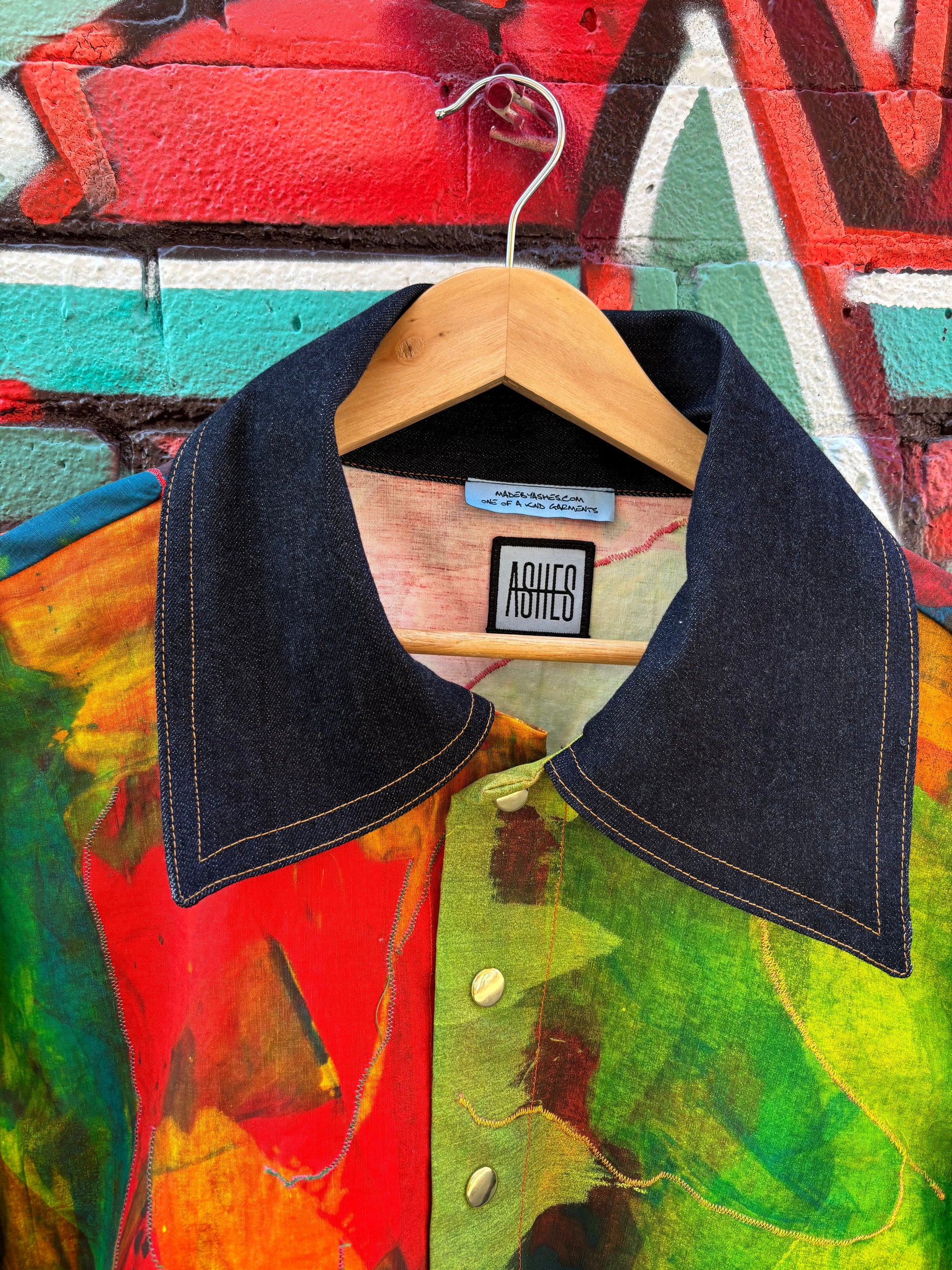 COTTON CLOTH WITH PAINTED DETAILS & stitching. ASHES embroidered on back. Snap closures down front with patch pockets.