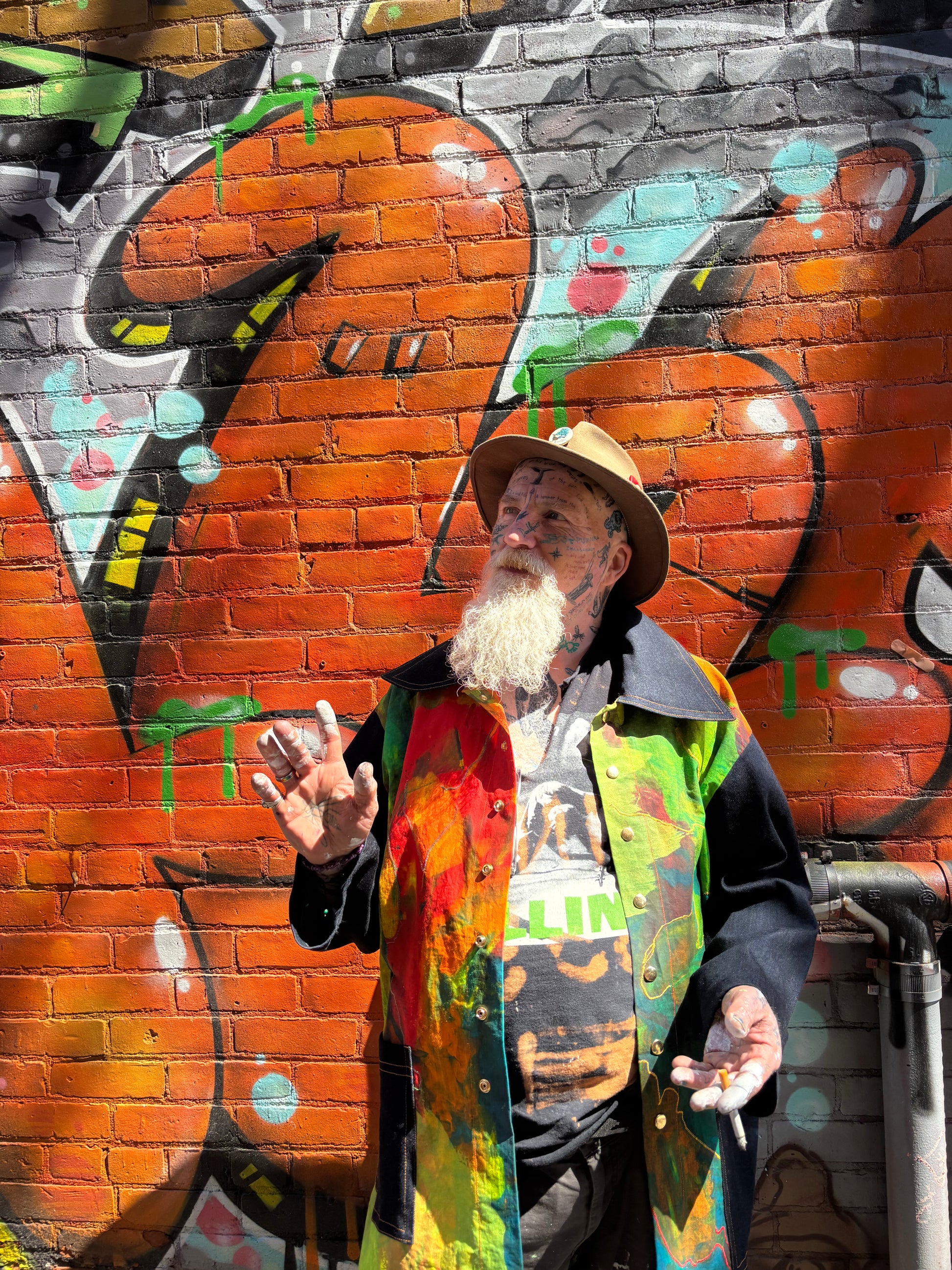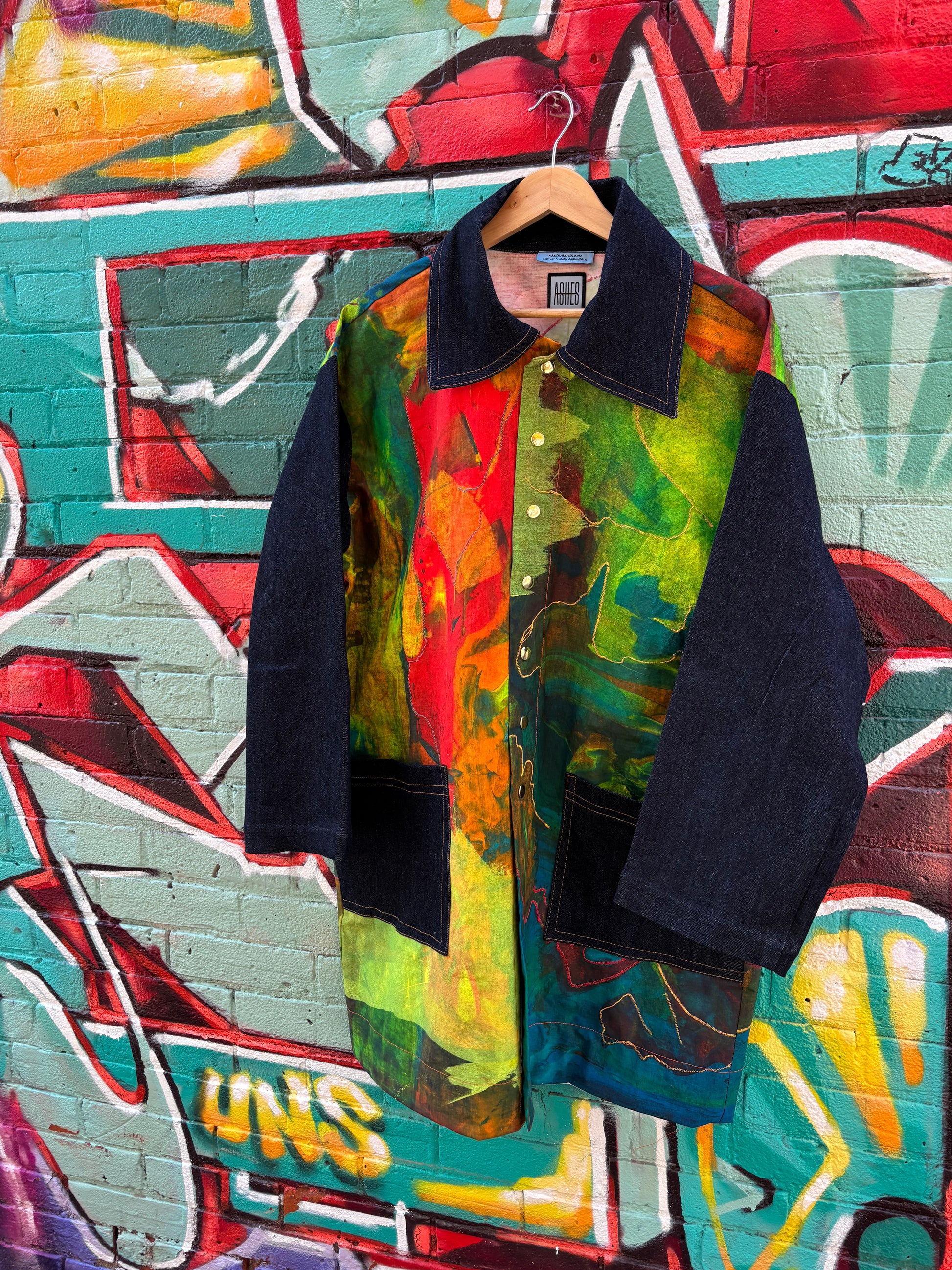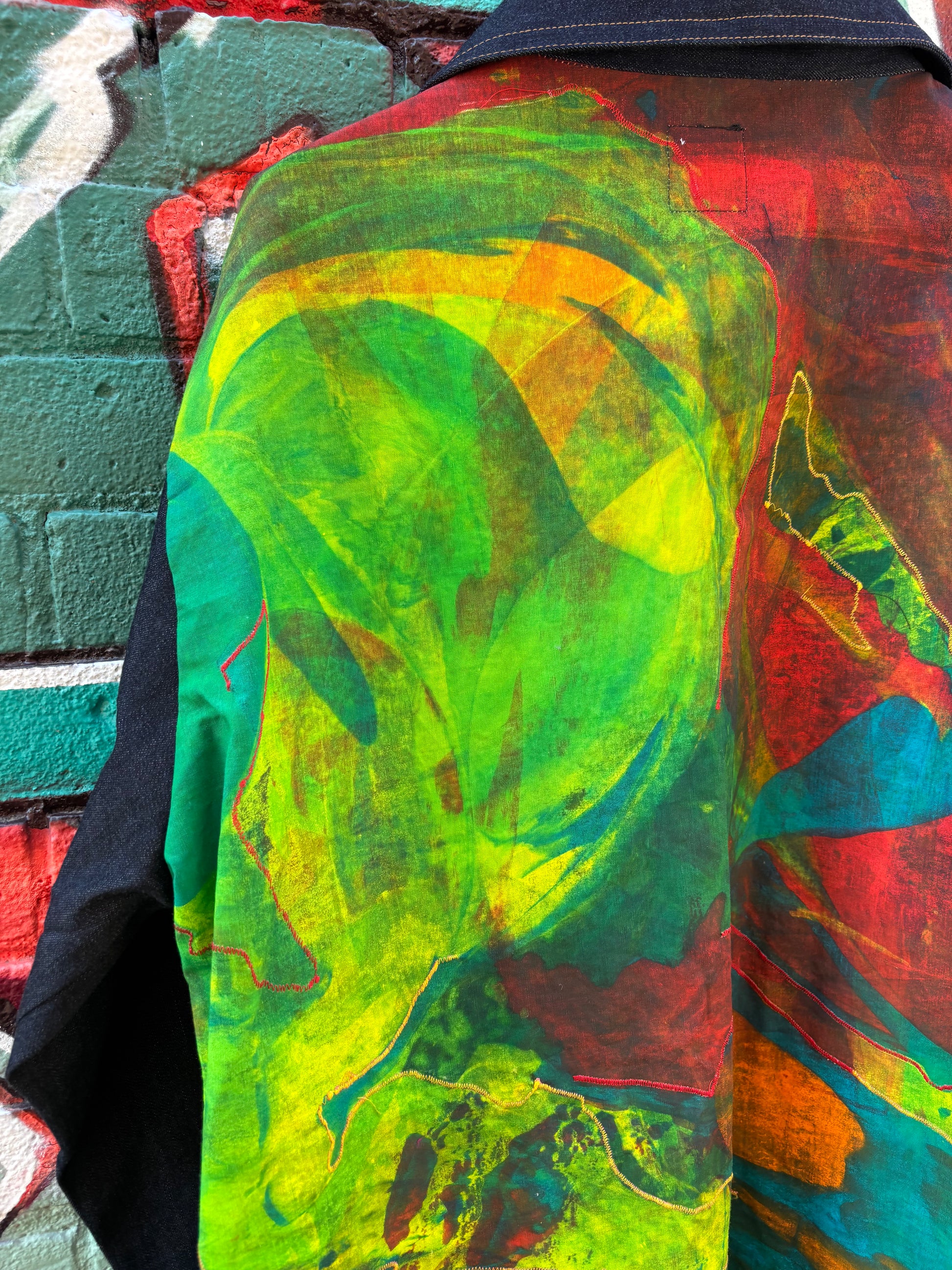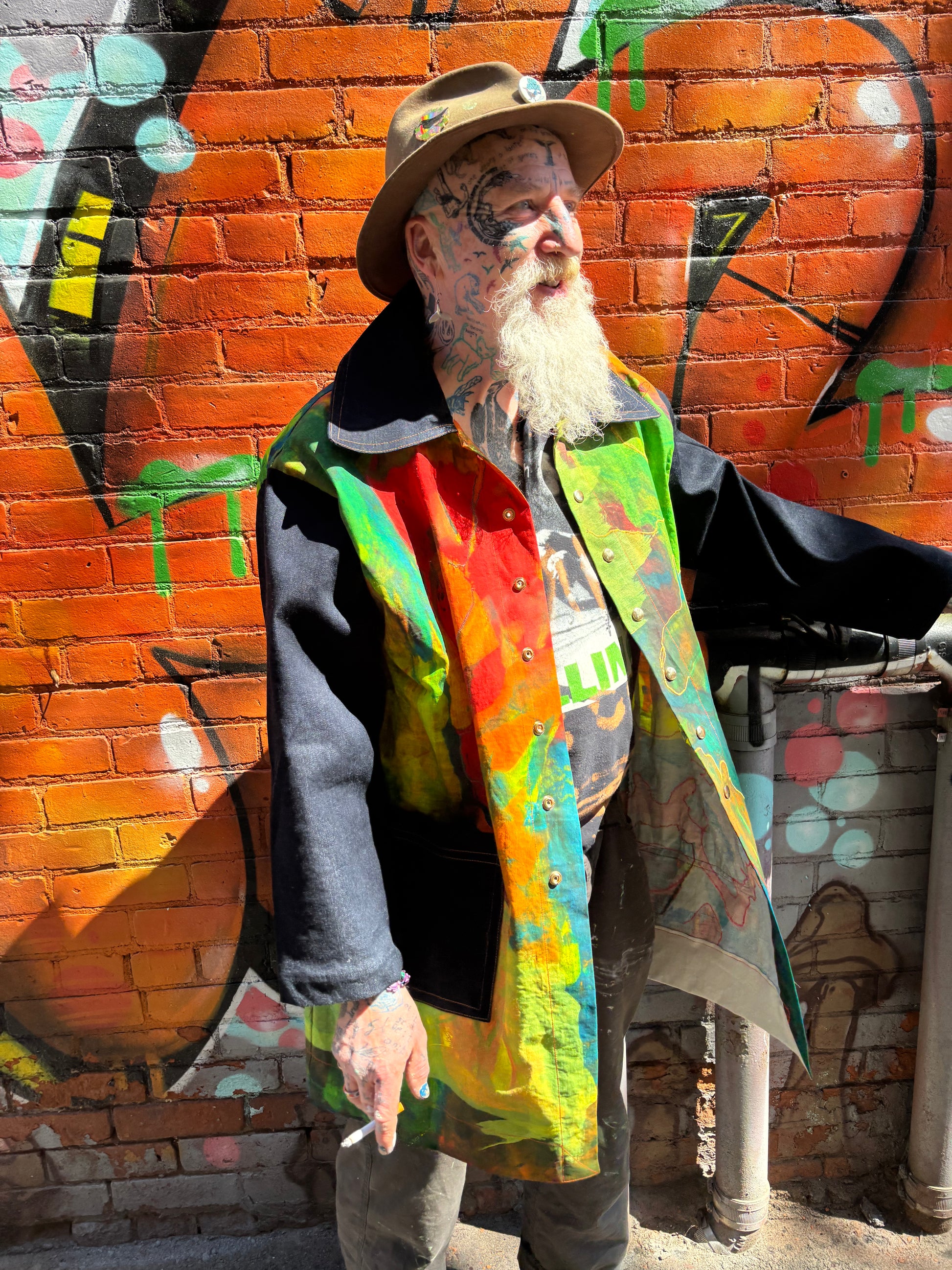 COTTON CLOTH WITH PAINTED DETAILS & stitching. ASHES embroidered on back. Snap closures down front with patch pockets.