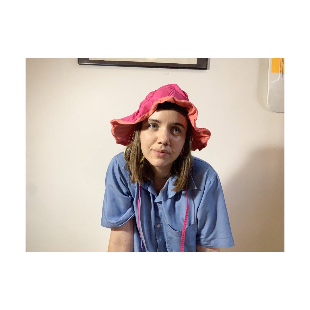 Fuchsia upper with pleating to add formed shape. Wire stitched into select seams at front to give the hat volume. Ties closer to back so they can be wrapped around hair.