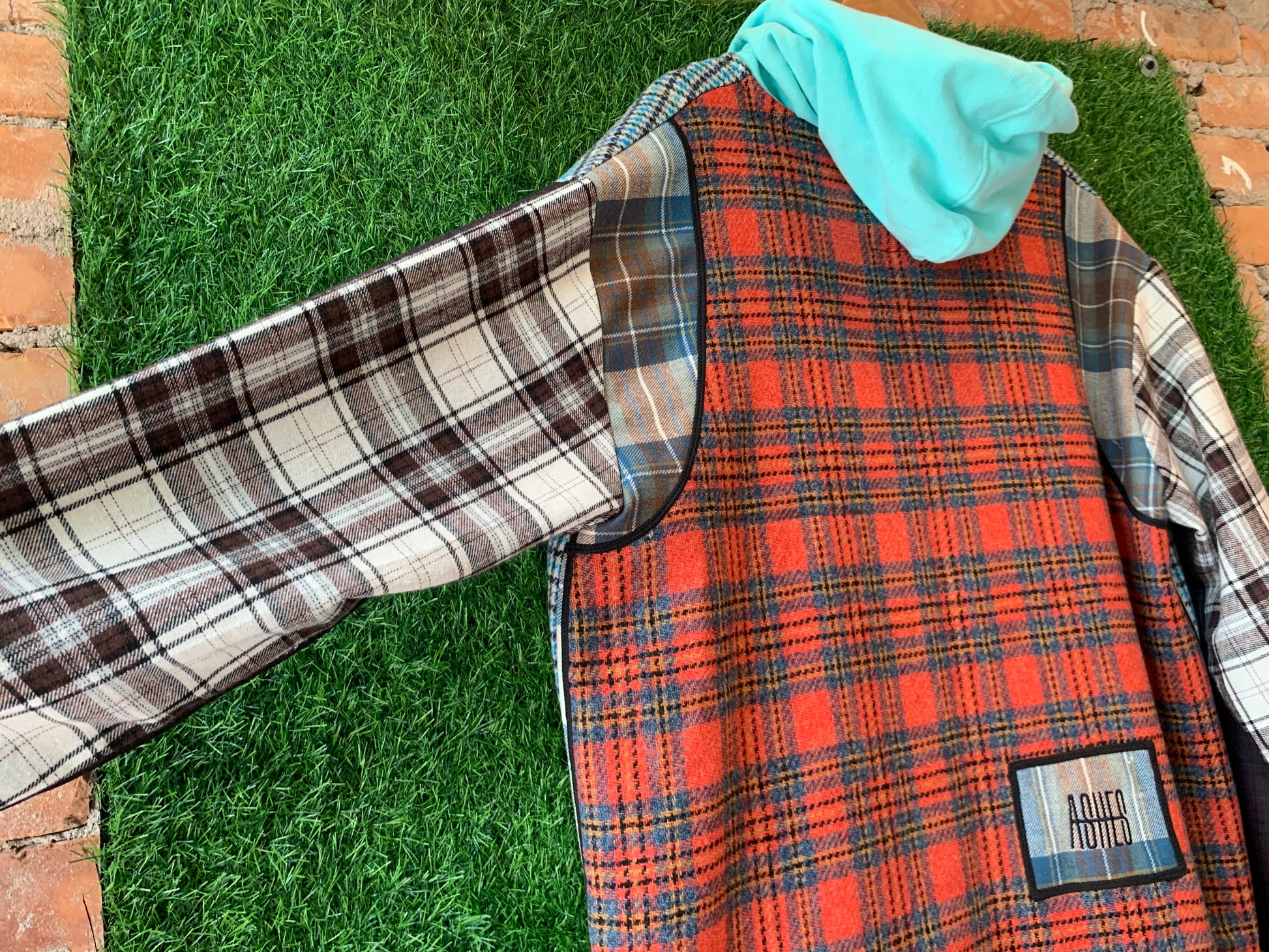 Plaid mashup. A mix of plaid wool and flannel materials. Lightweight textiles and unlined. Patch pockets on front and hoodie are up cycled from knit sweaters.