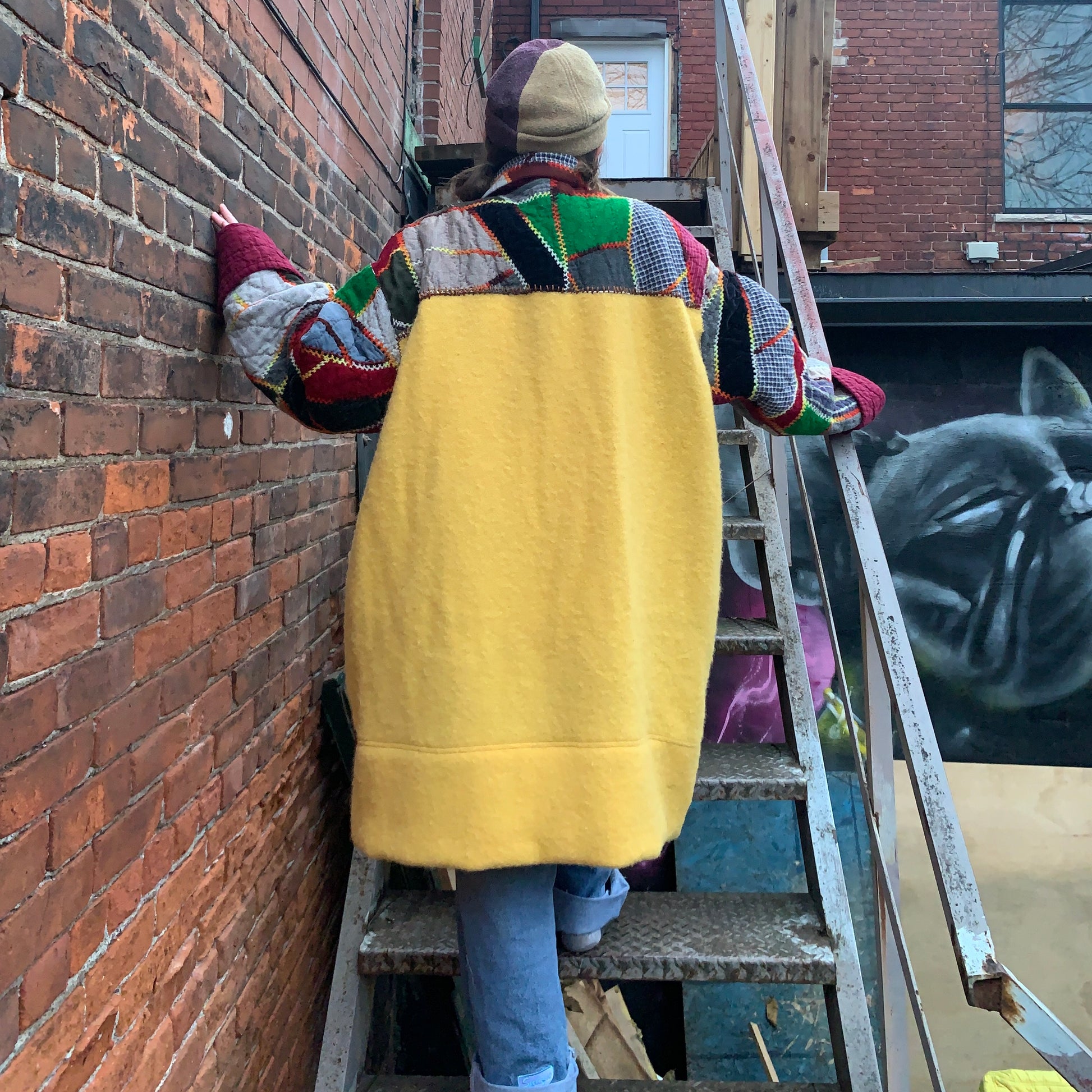 Yellow wool blanket used for back.