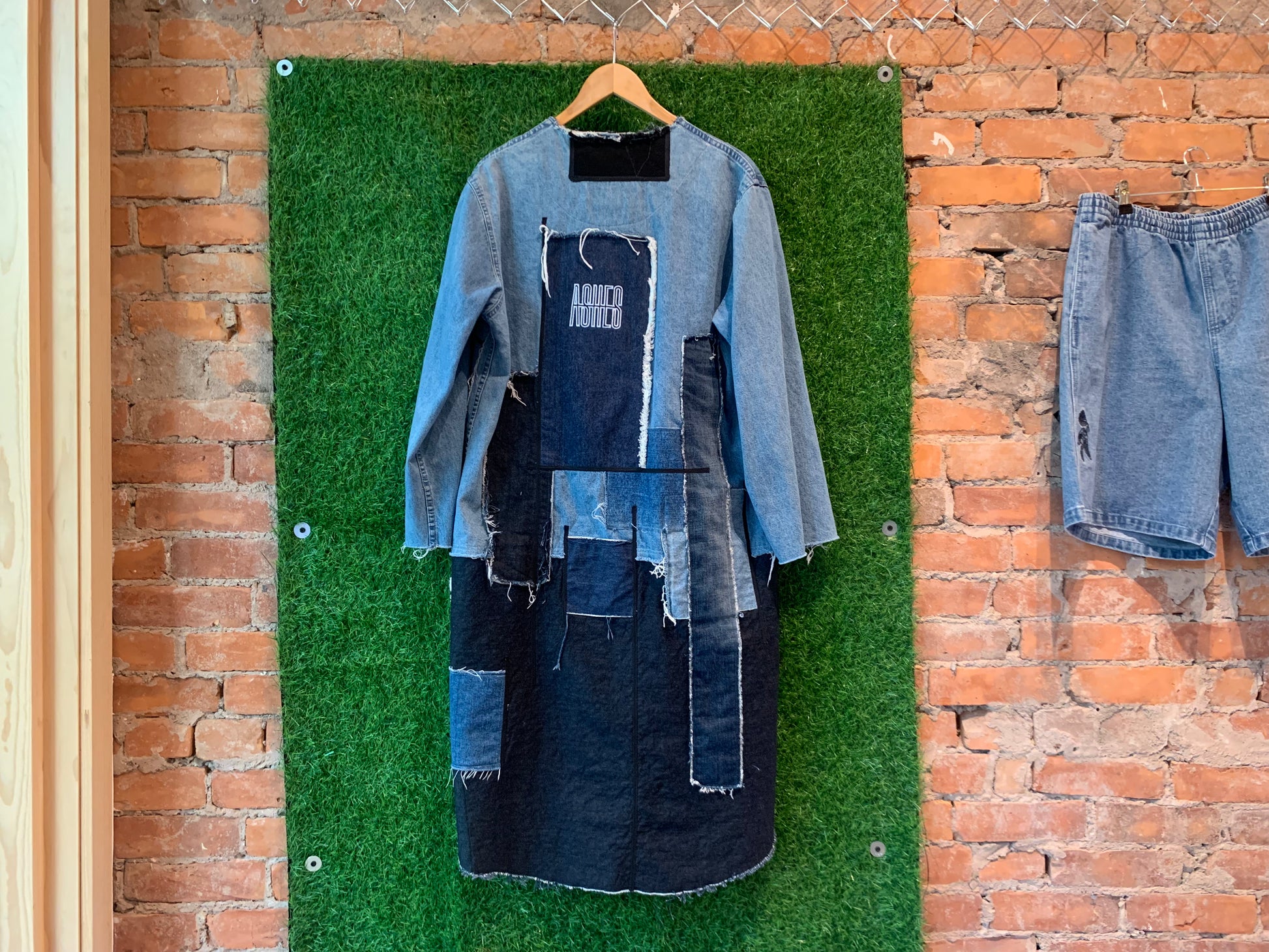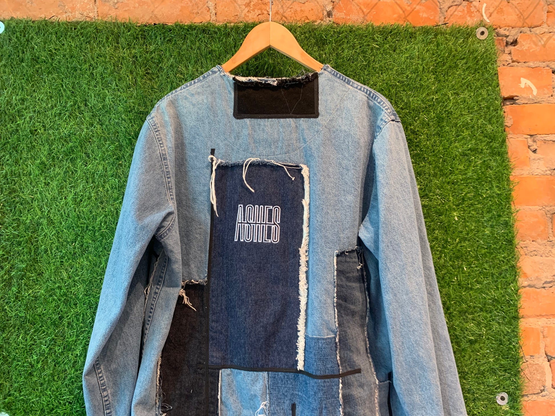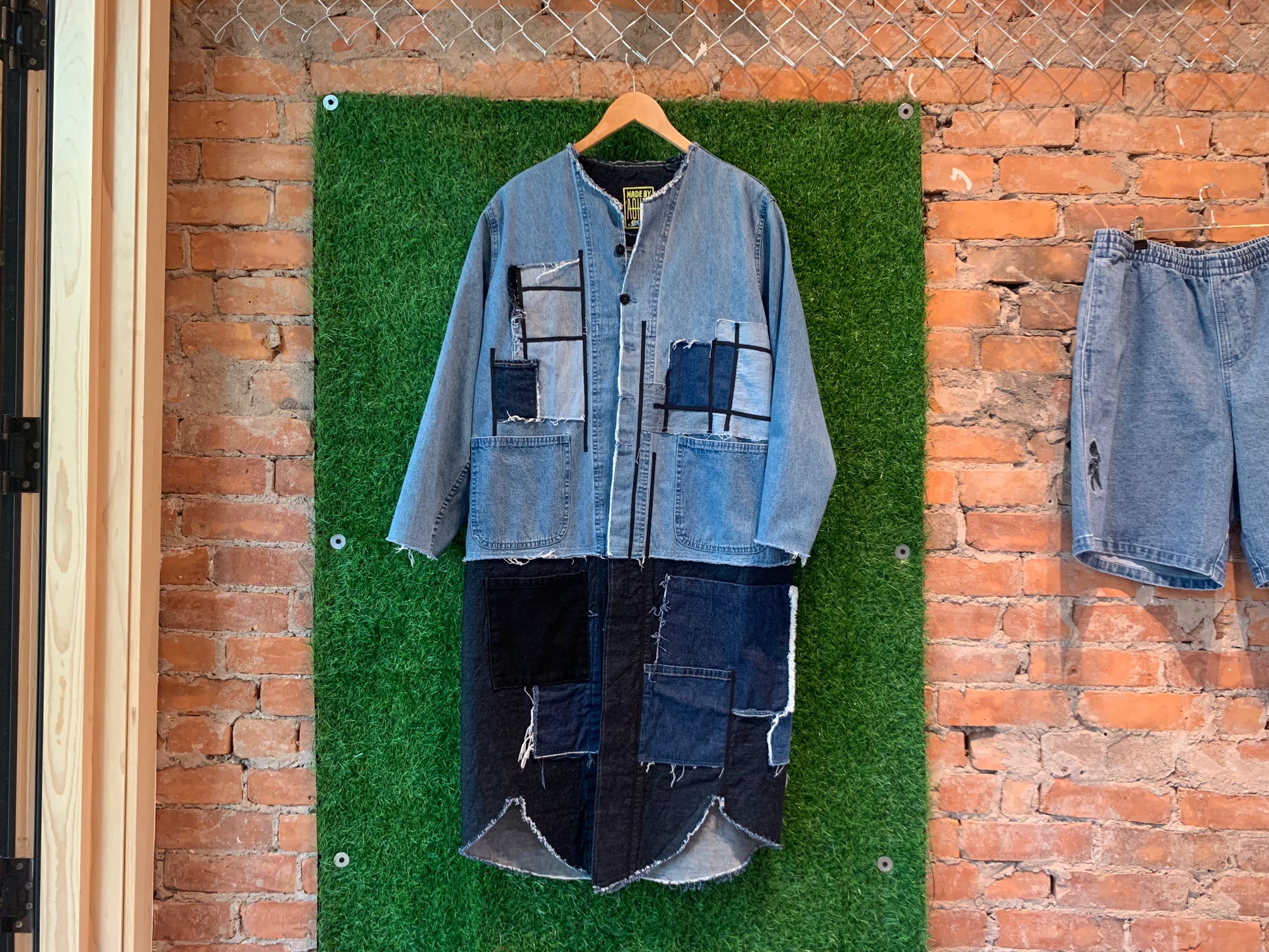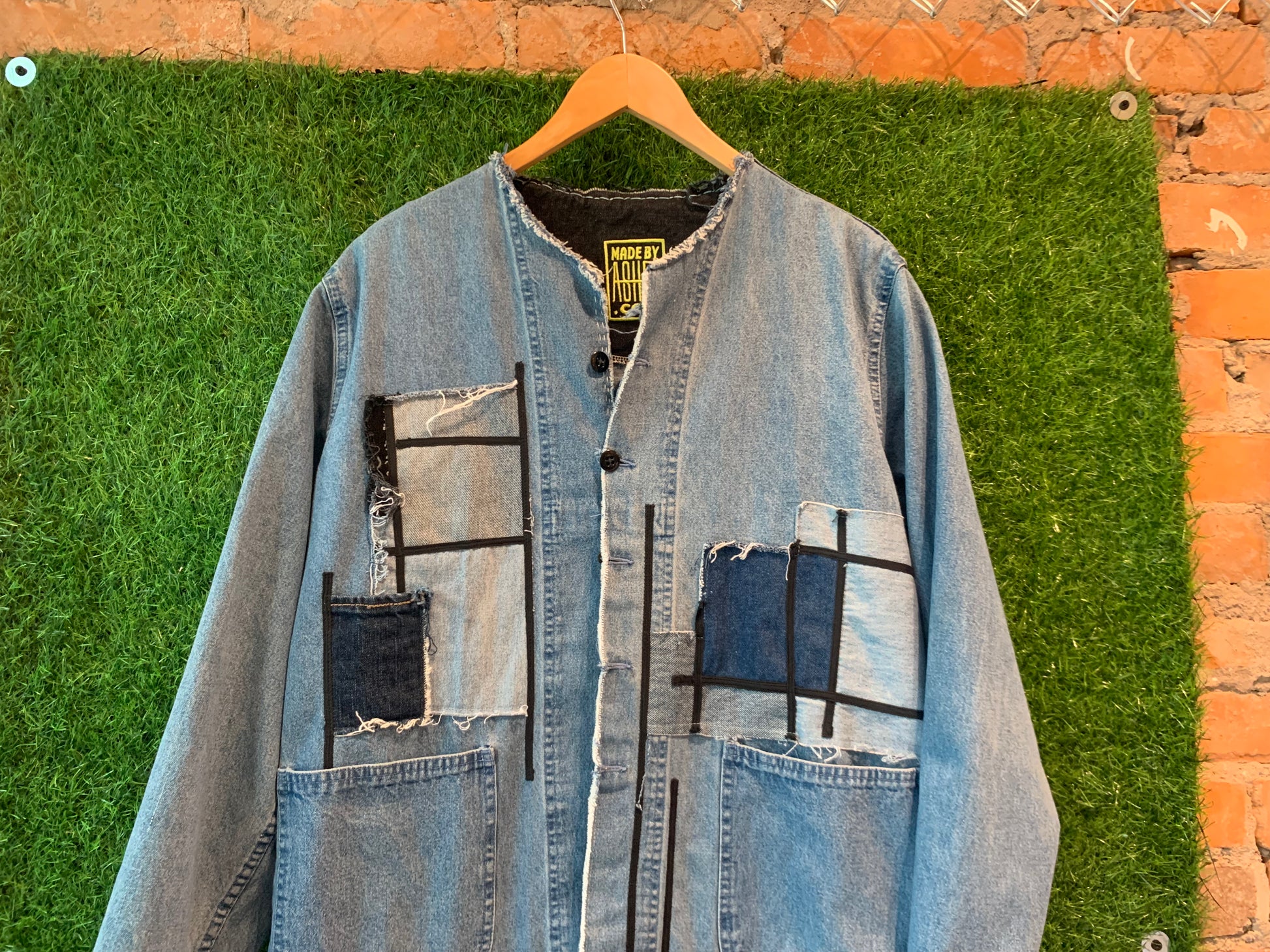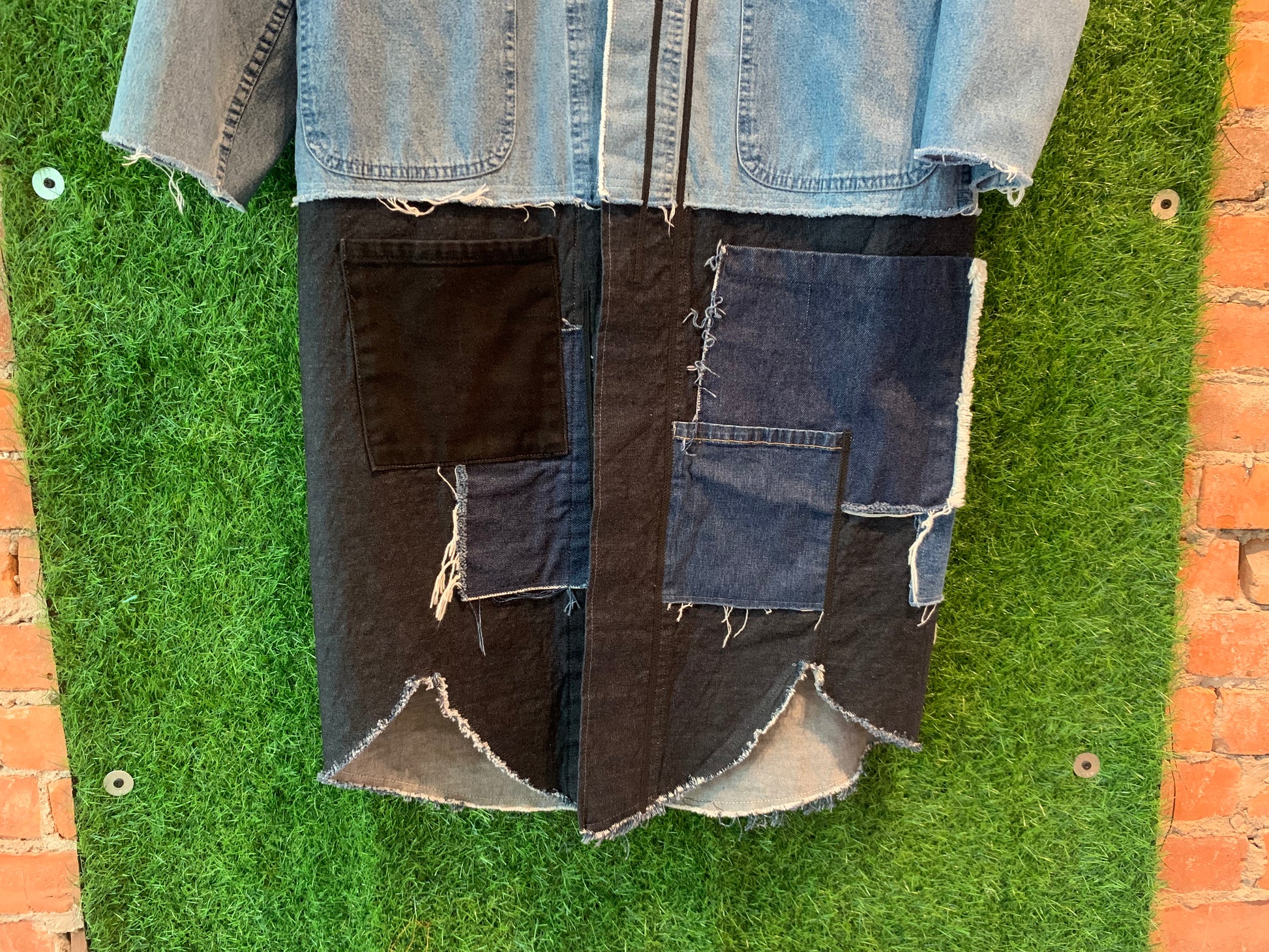 Denim upcycled jacket started this creation. Lighter denim top with deep blue denim bottom half. Raw denim stitched throughout jacket with black cotton twill detailing. Stitched along raw edges to control the unravelling of denim. Unlined. Patch pockets on front with four additional patch pockets stitched on front. ONE OF A KIND.