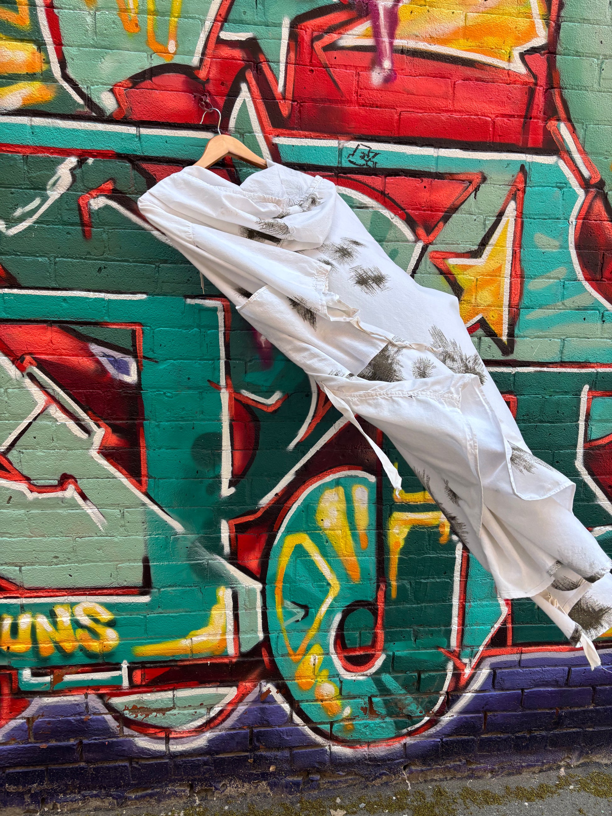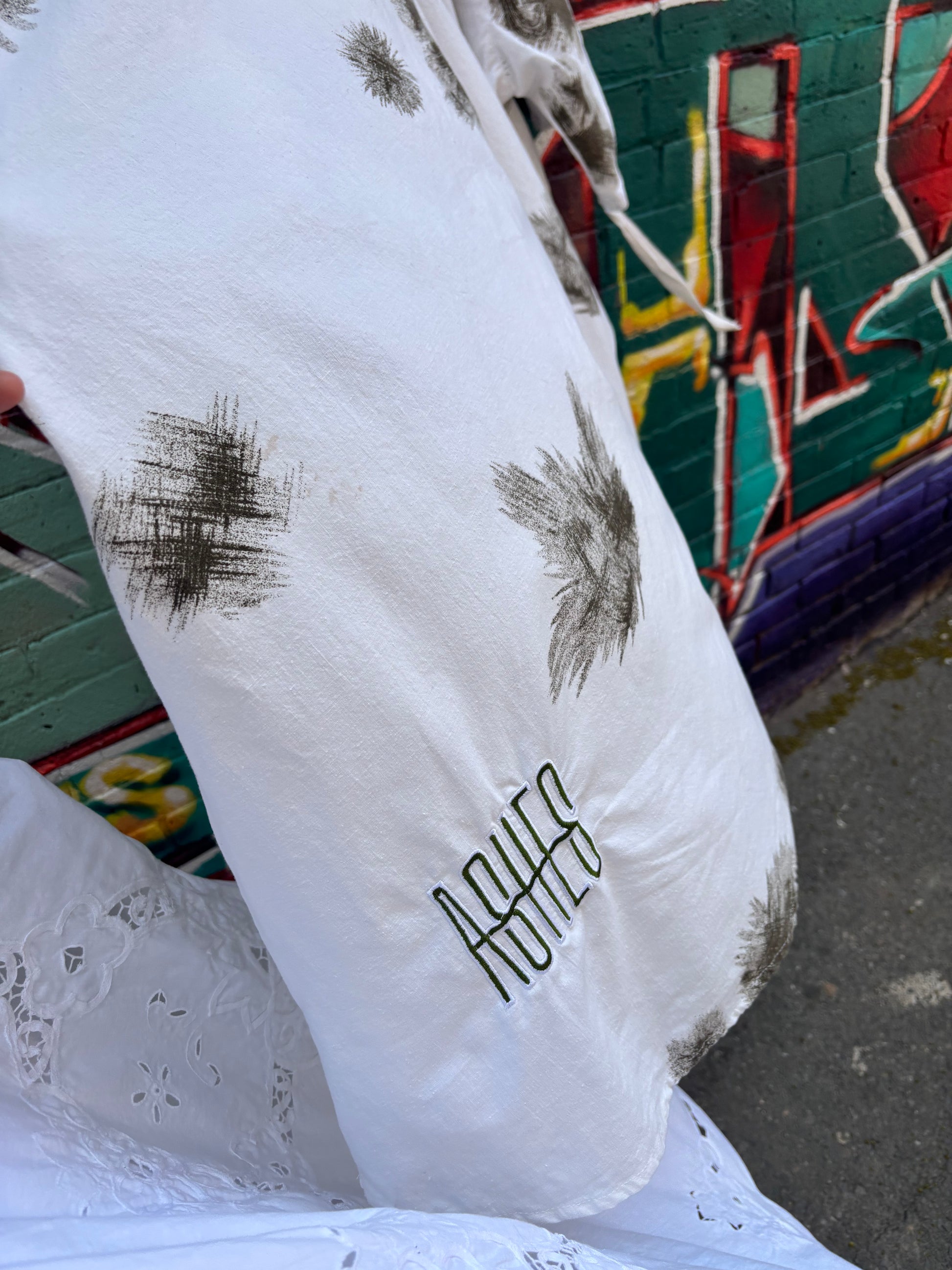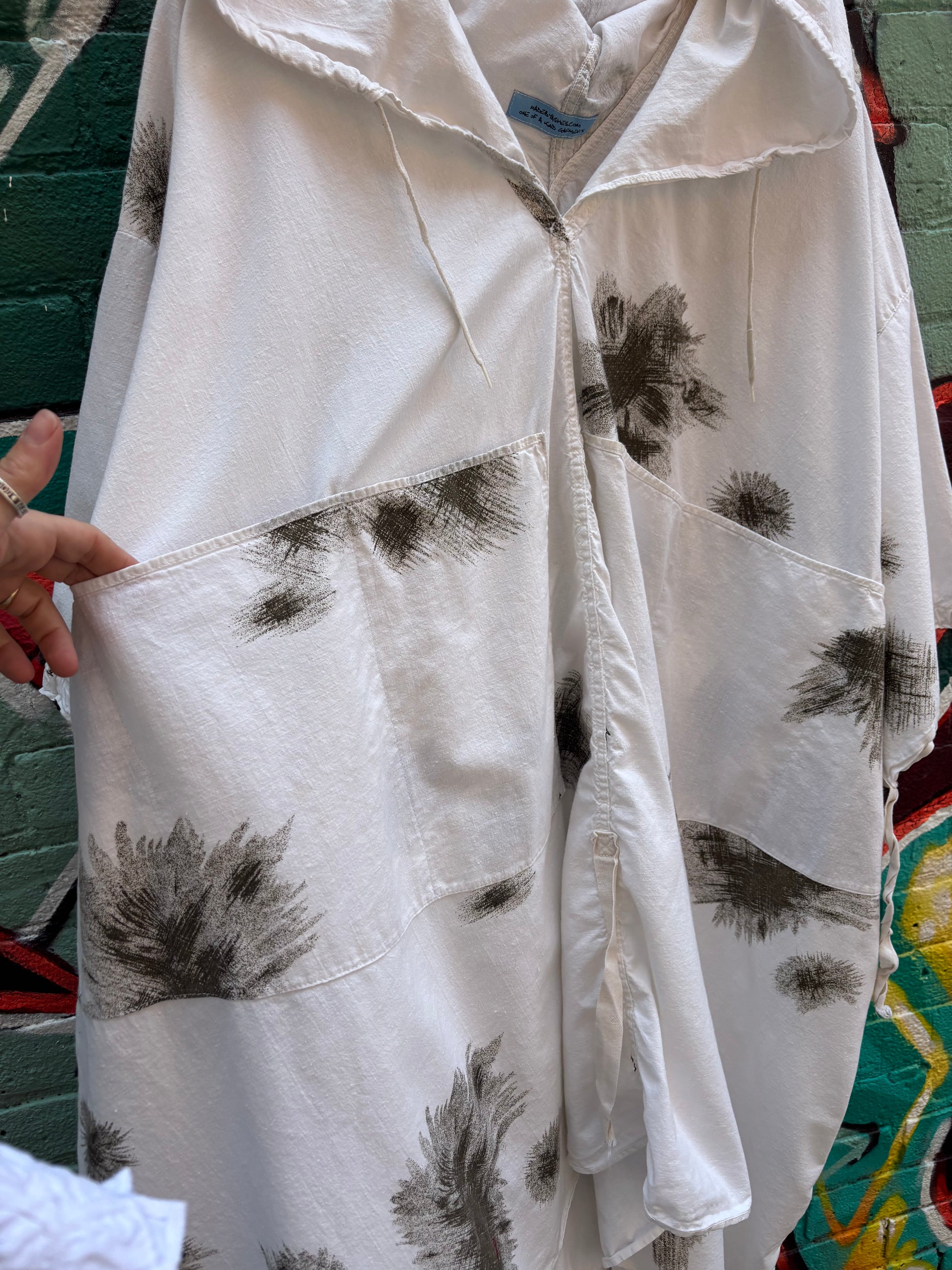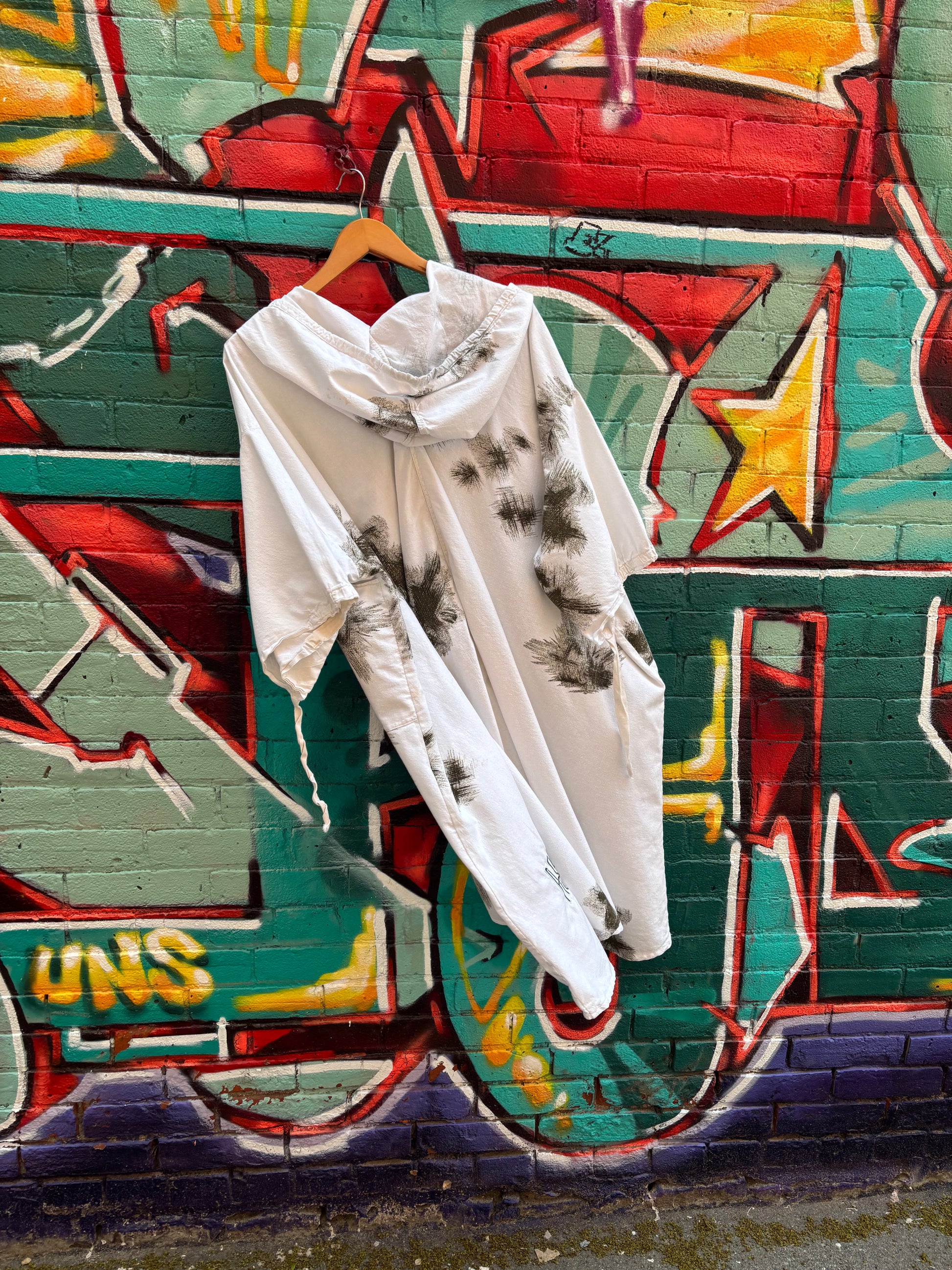 Cotton upcycled military poncho. Modified by ASHES. Into a lightweight pullover. Hoodie with flared shape and longer length at back. Kept the drawstring details from poncho and embroidered ASHES logo on back.