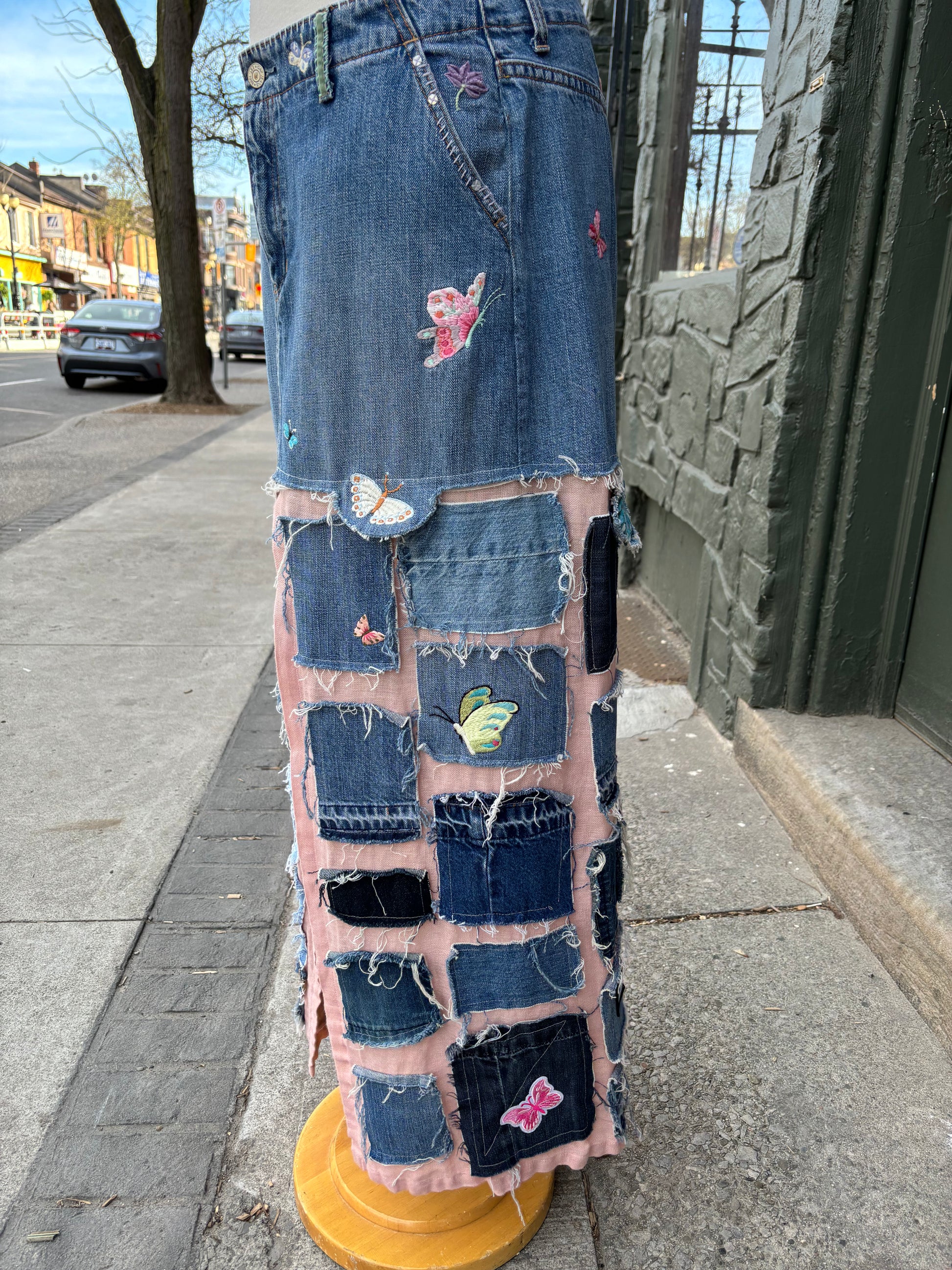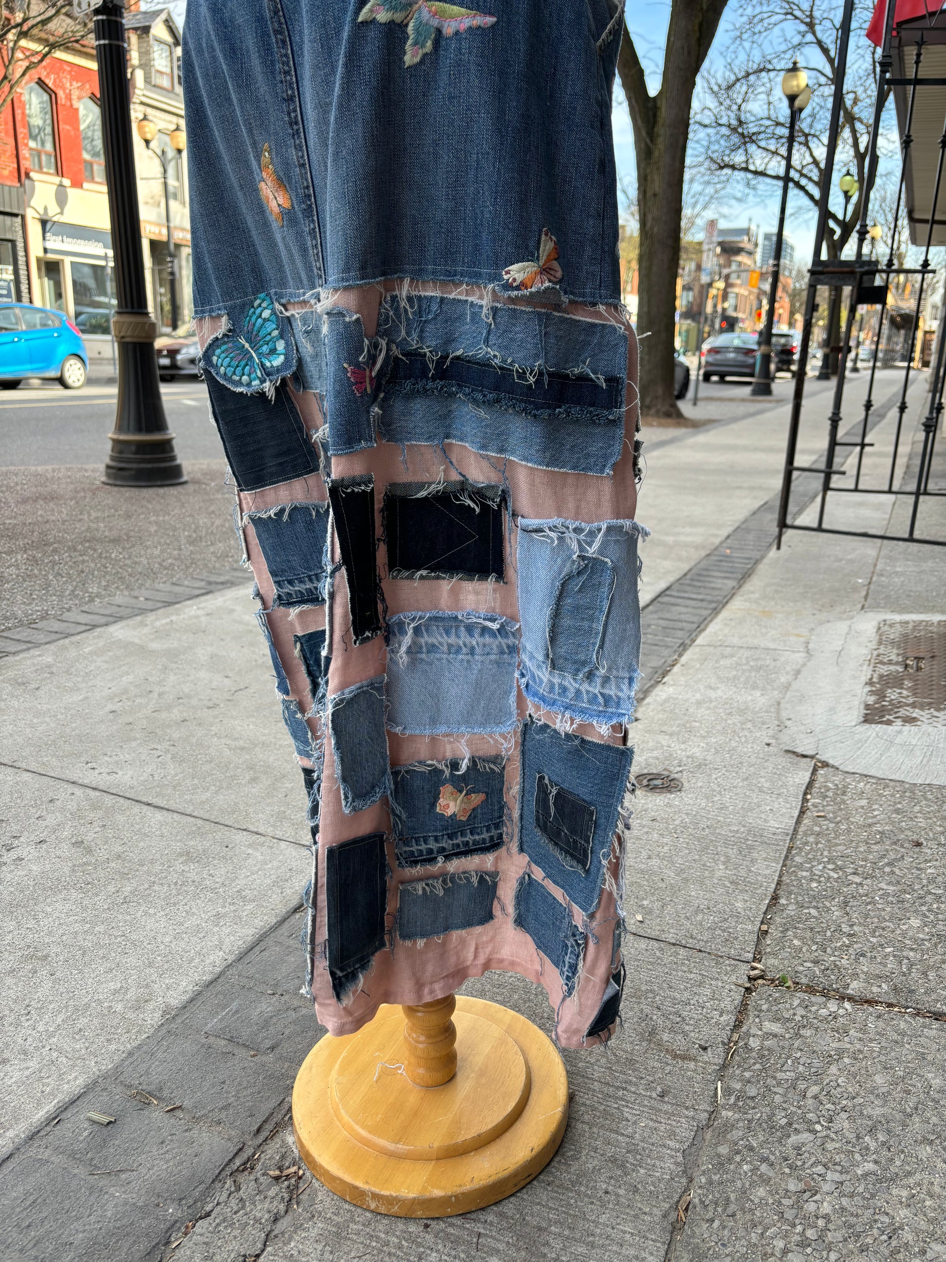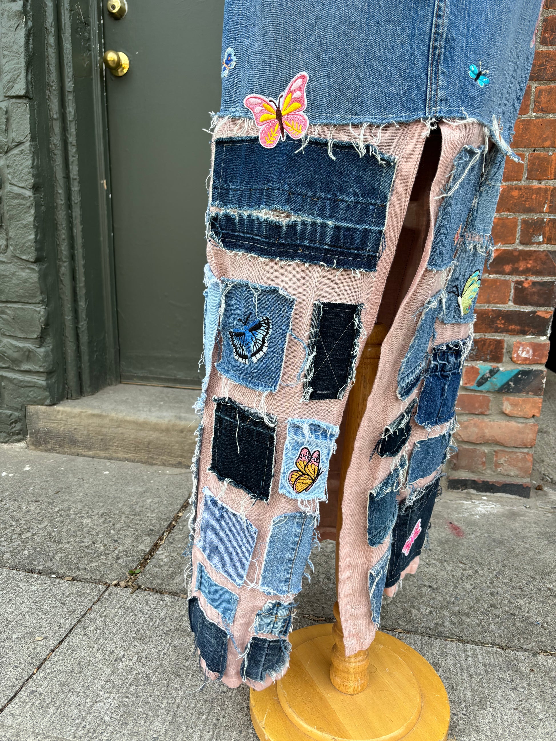 Pink upcycled woven curtain adorned with denim patchwork and embroidered butterflies. Reworked denim skirt as base. Extra high slit down front.