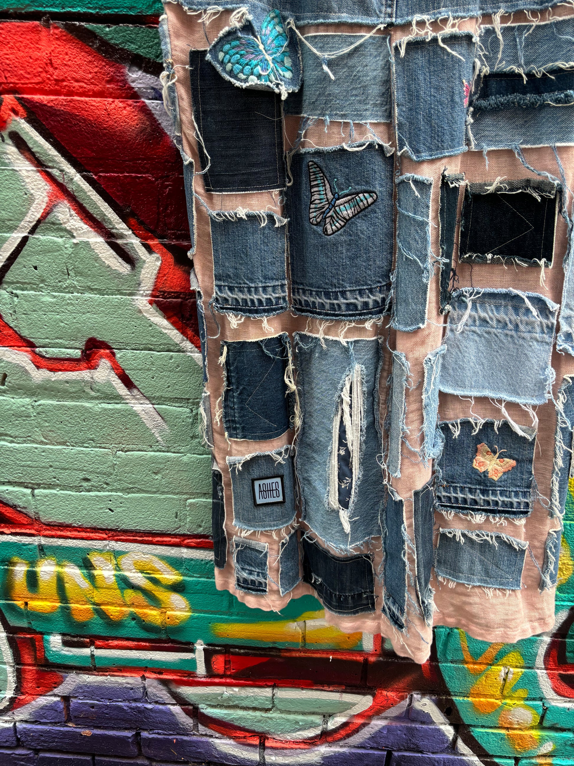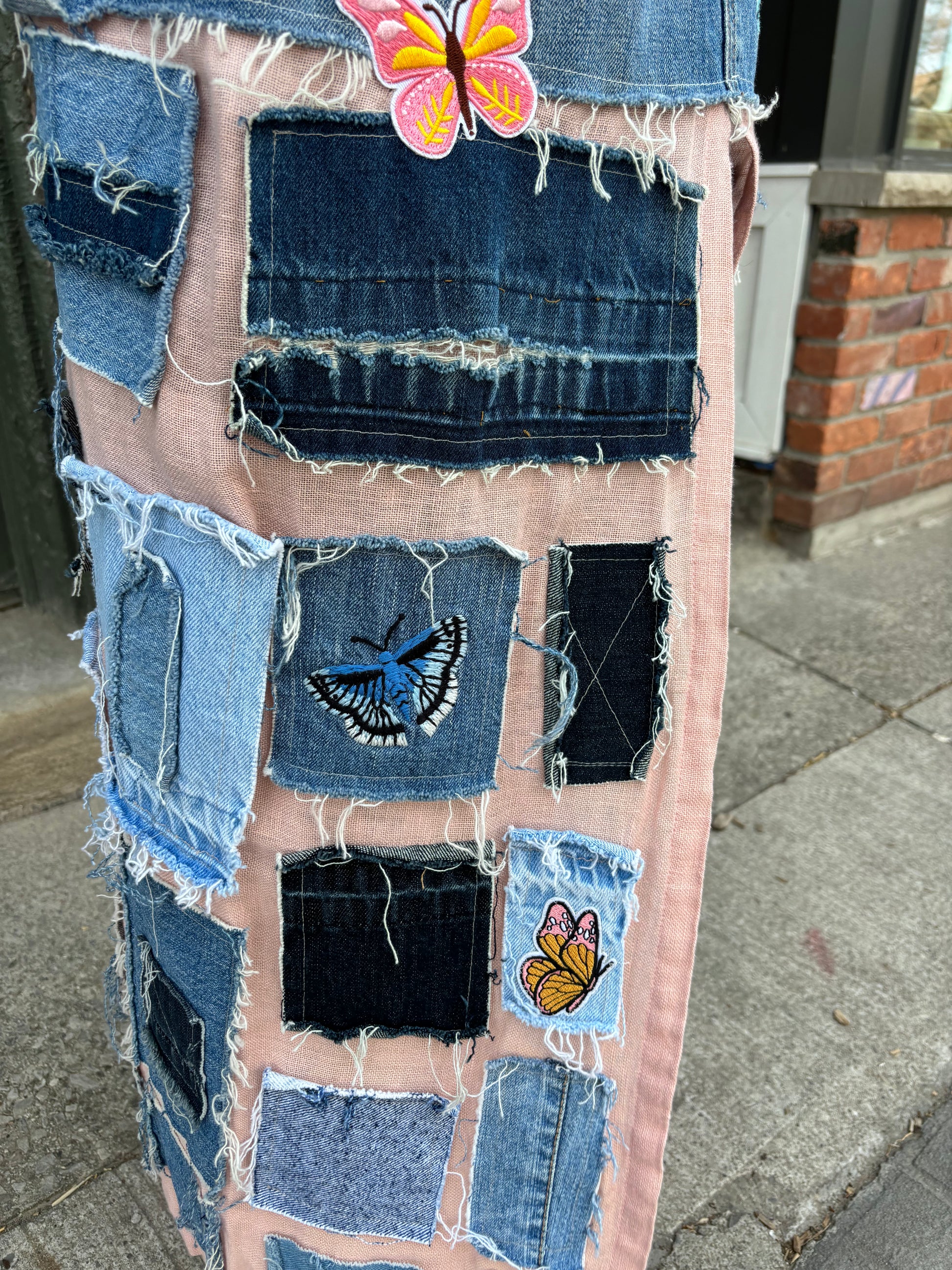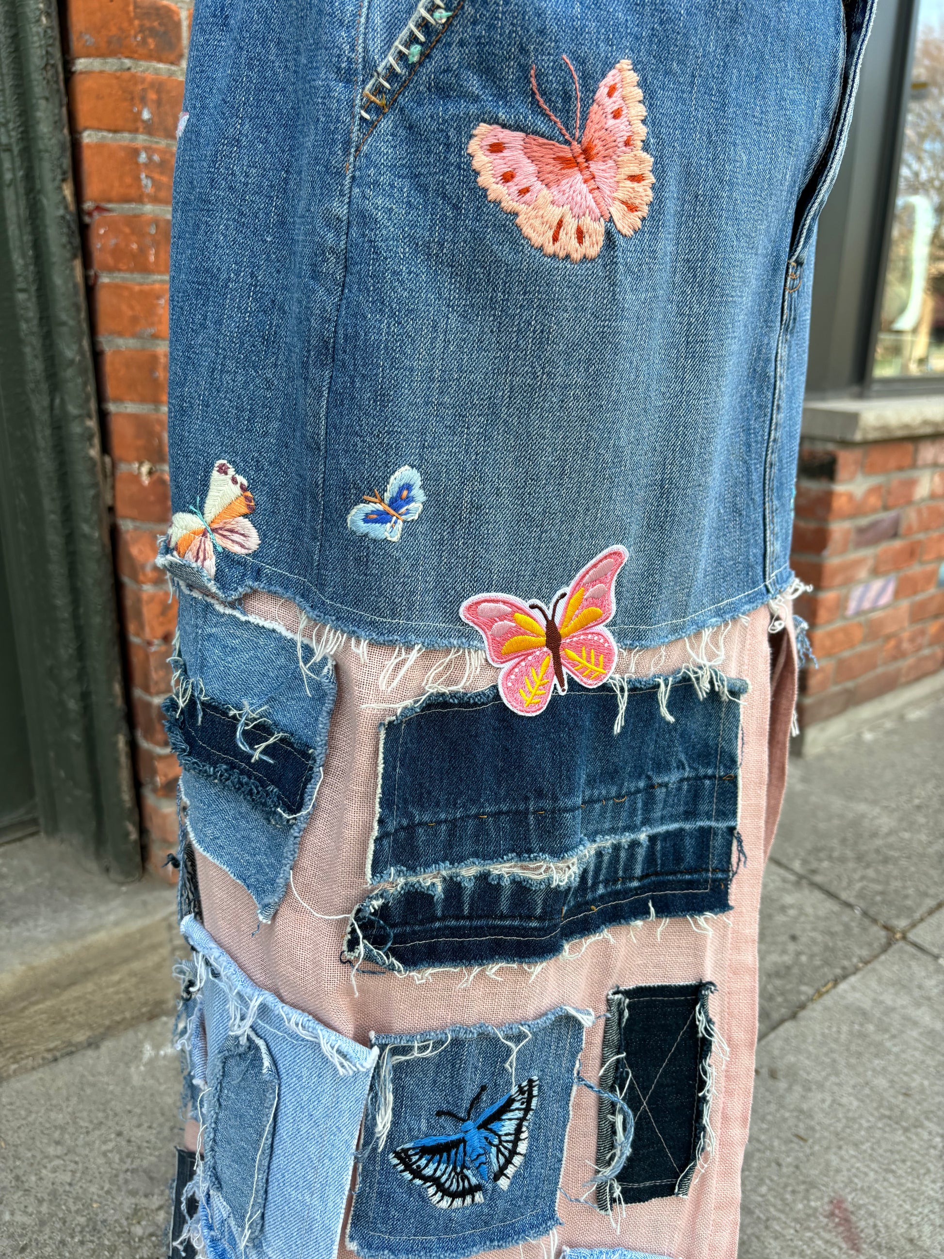 Pink upcycled woven curtain adorned with denim patchwork and embroidered butterflies. Reworked denim skirt as base. Extra high slit down front.