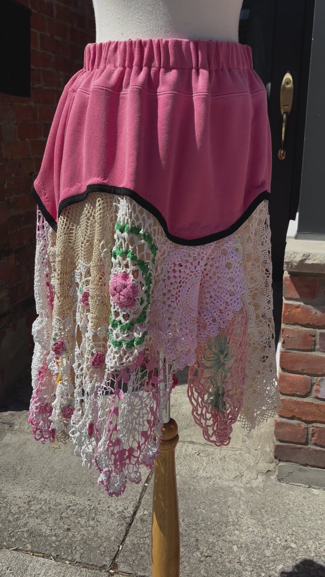 Pink cotton base with elastic waistband. Black binding finish of knit fabric. A variety of vintage doilies machine and hand stitched together to create skirt.