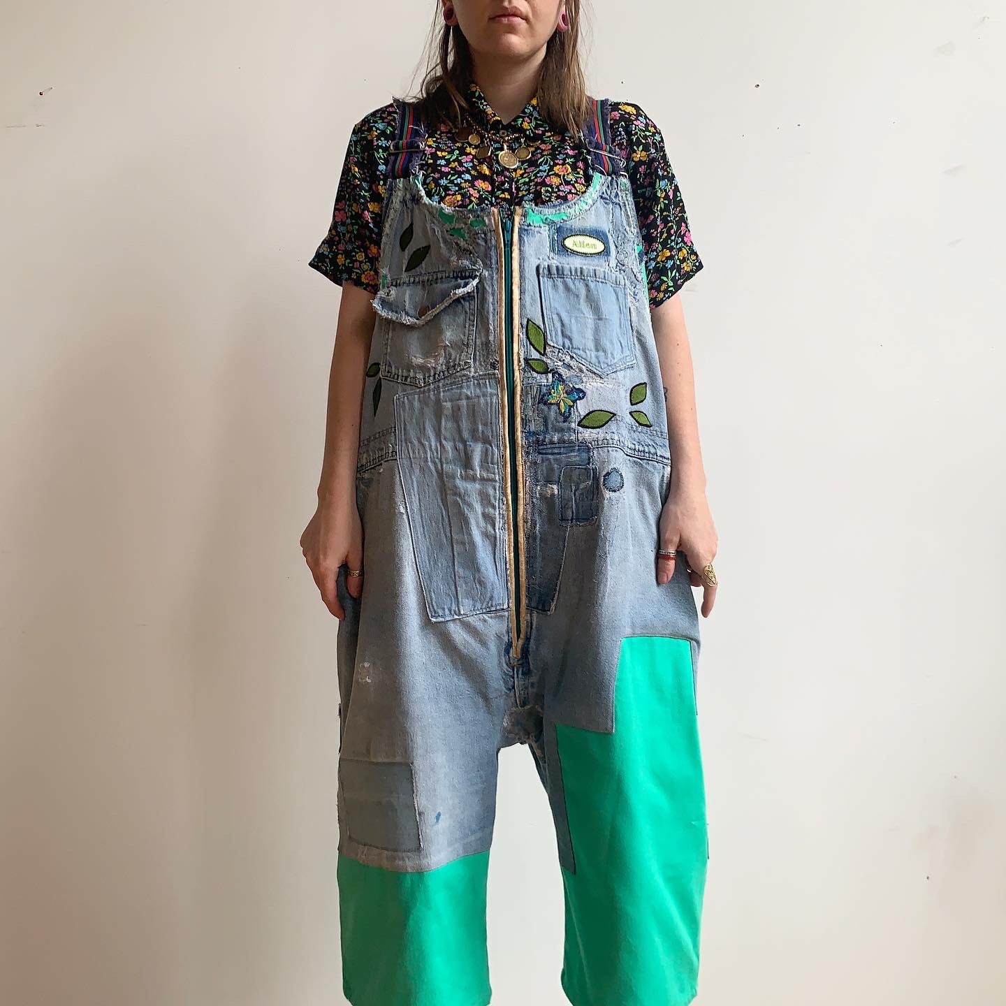Made from heavily loved overalls. Taken apart and restricted back together to keep the raw elements of the hard work that had passed through them. Cotton inside and stitched over all holes with mint detailing. Embroidered leaves on front.