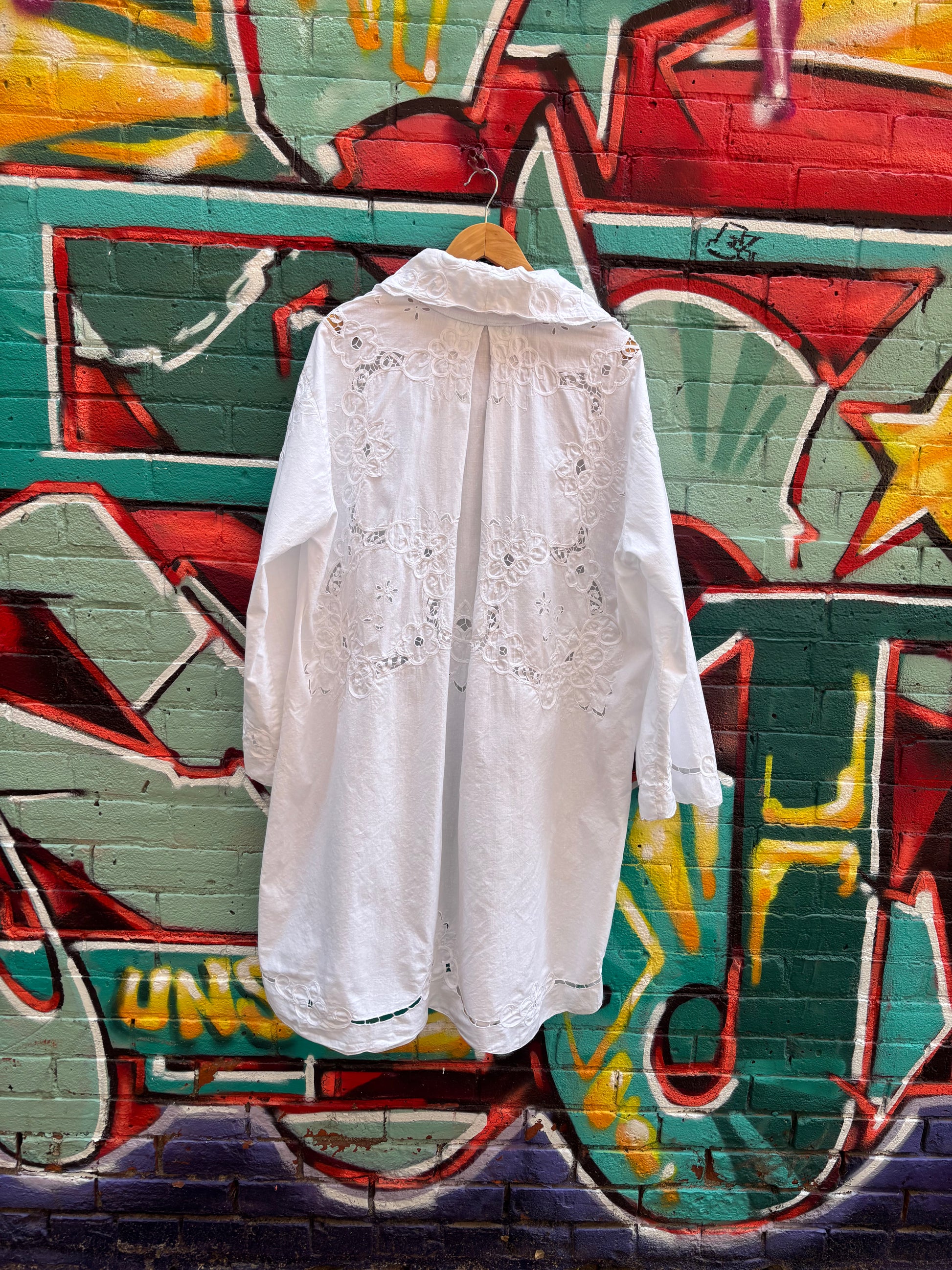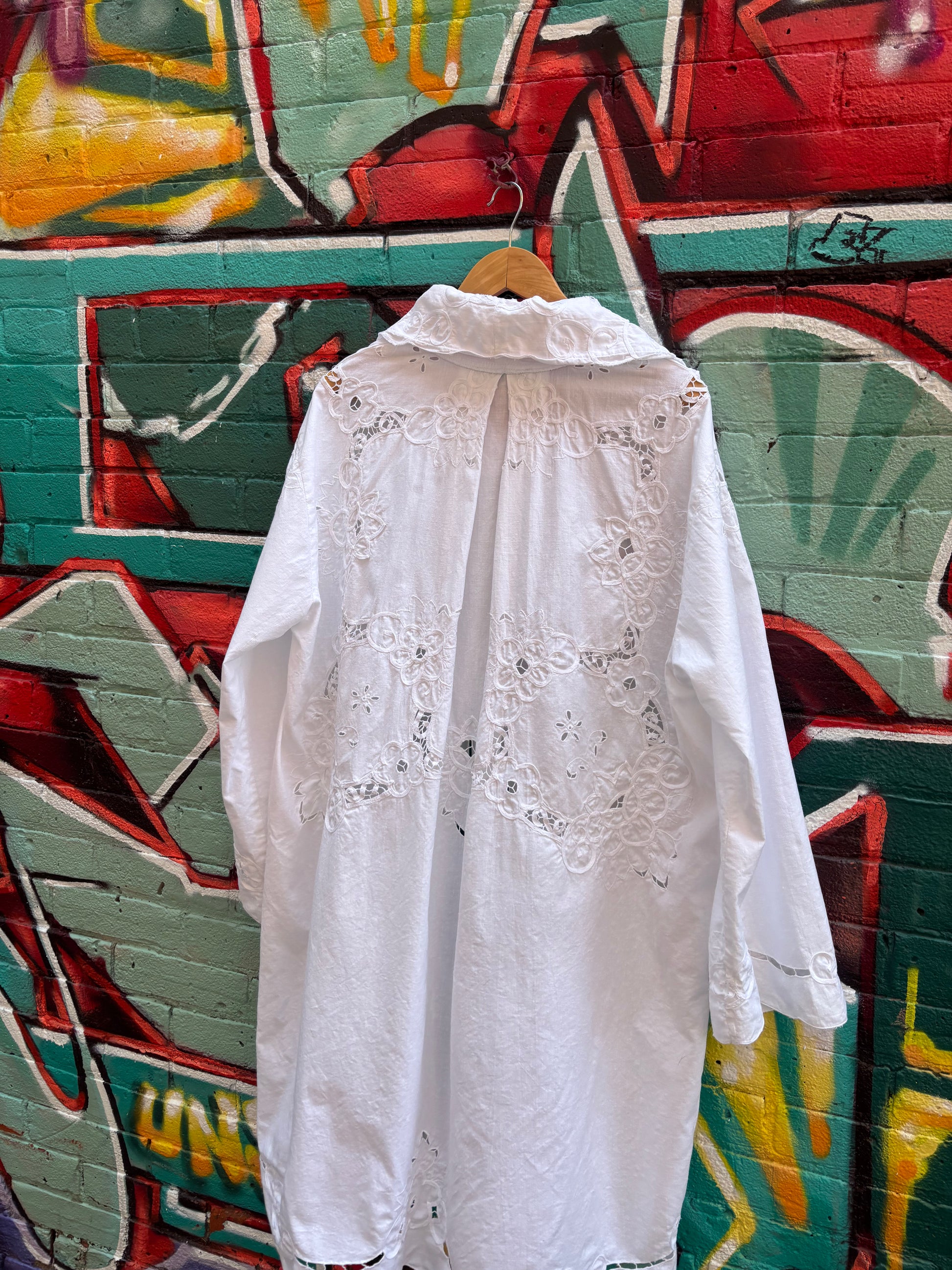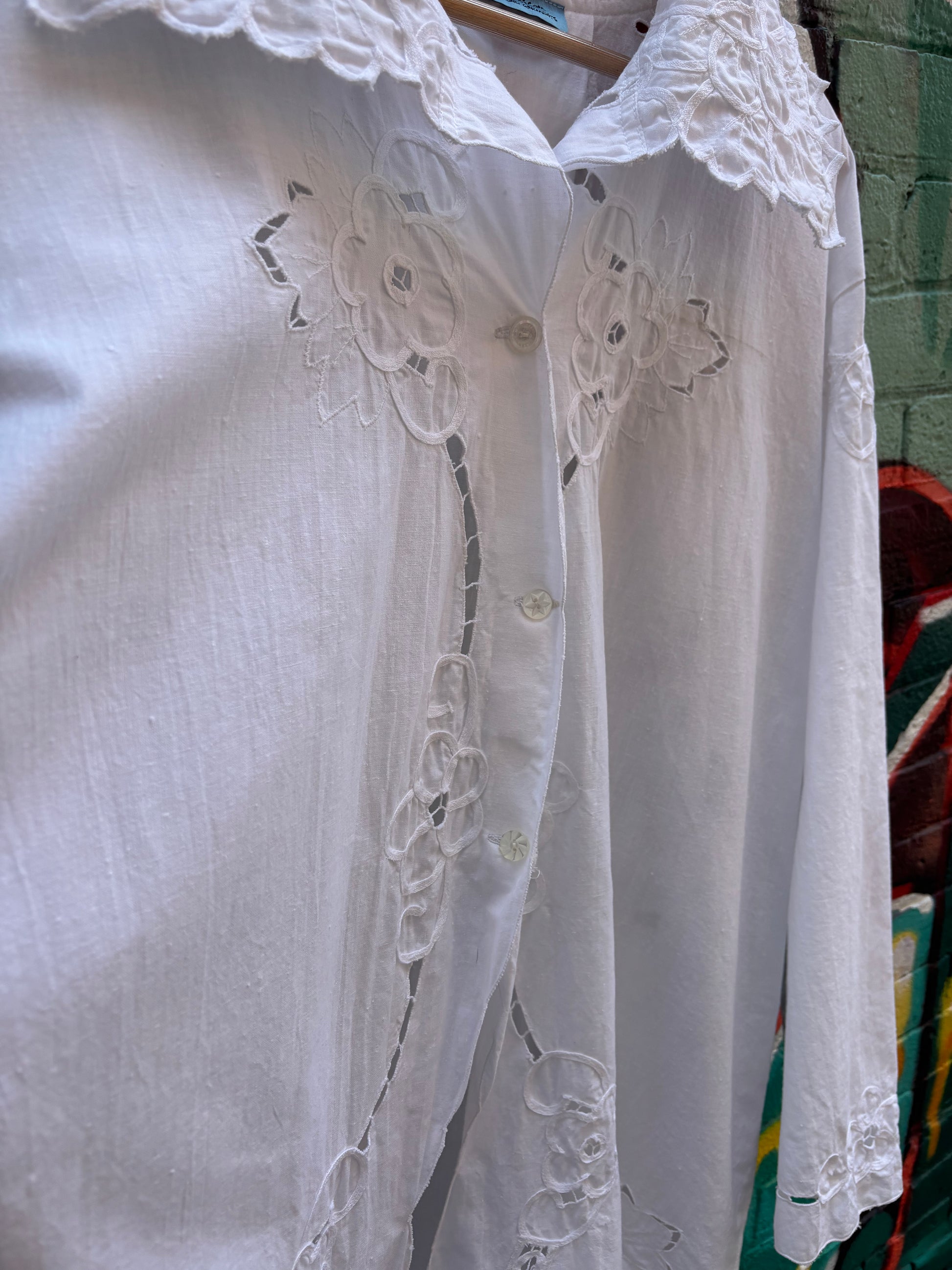 Crisp cotton upcycled table cloth into a perfect piece for breezy summer nights. Also a light layer for running through a field in the sun.