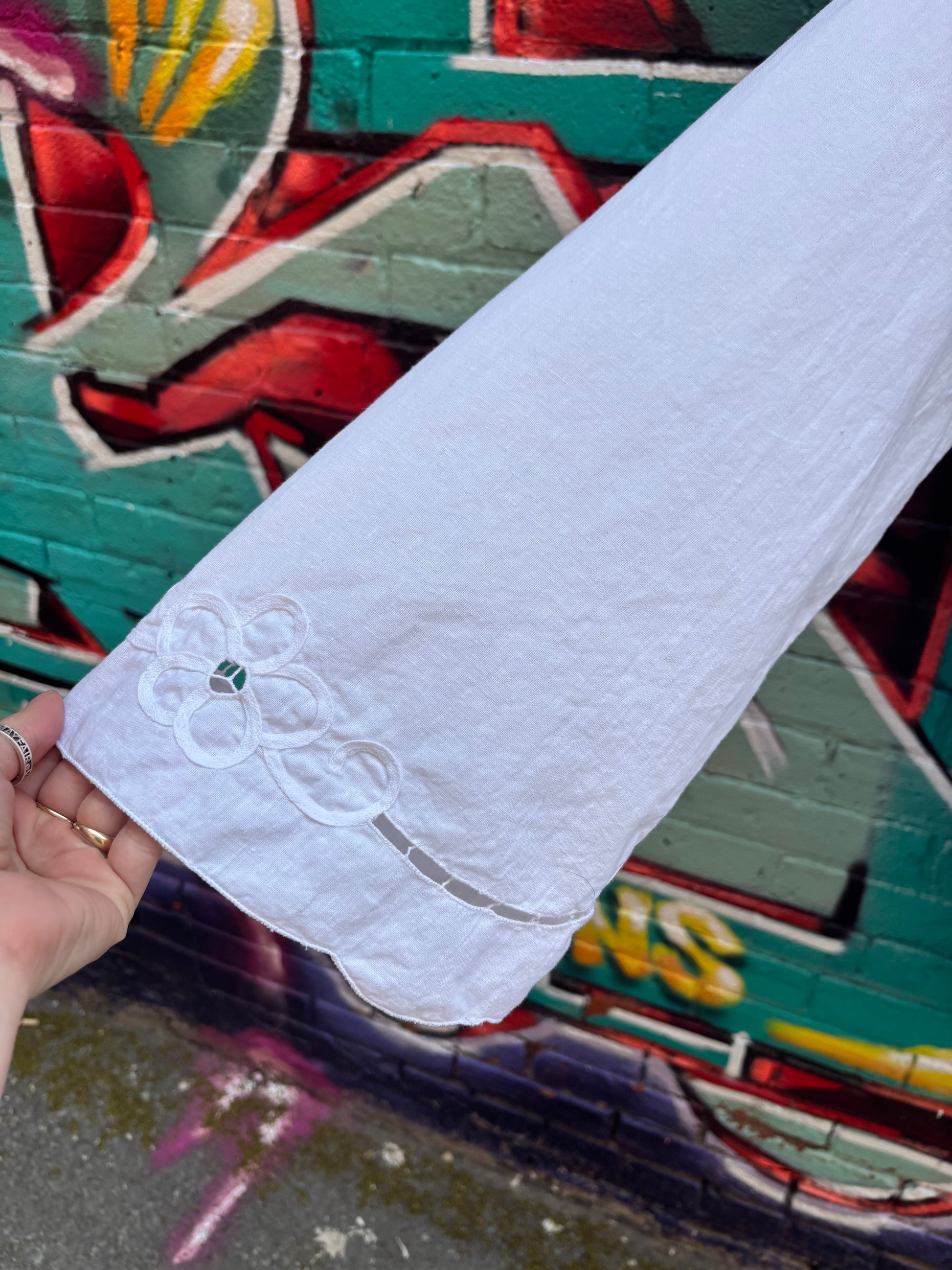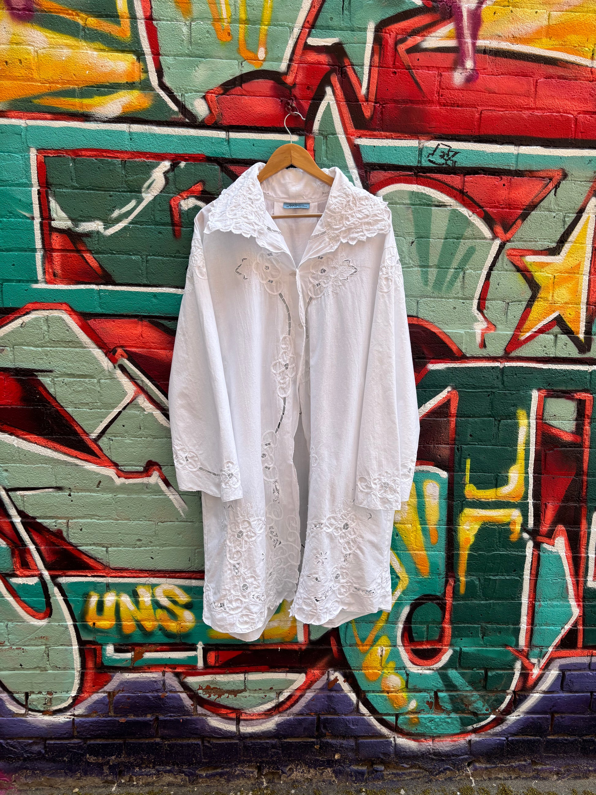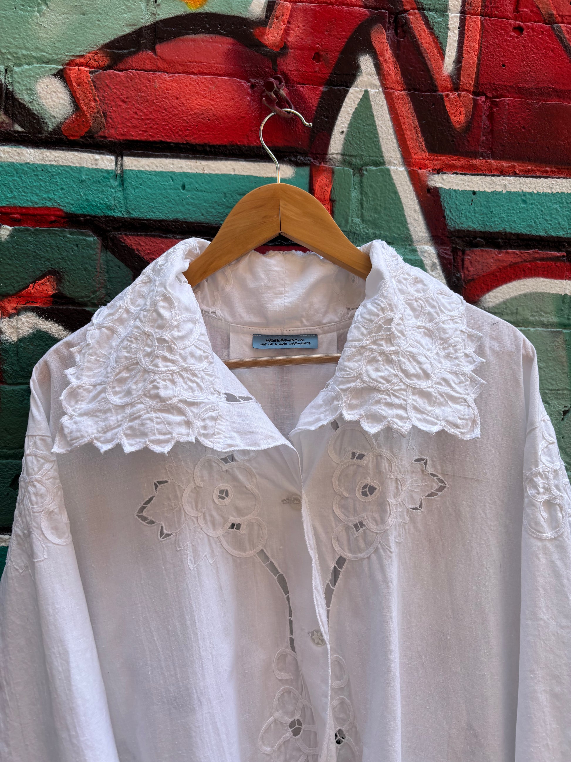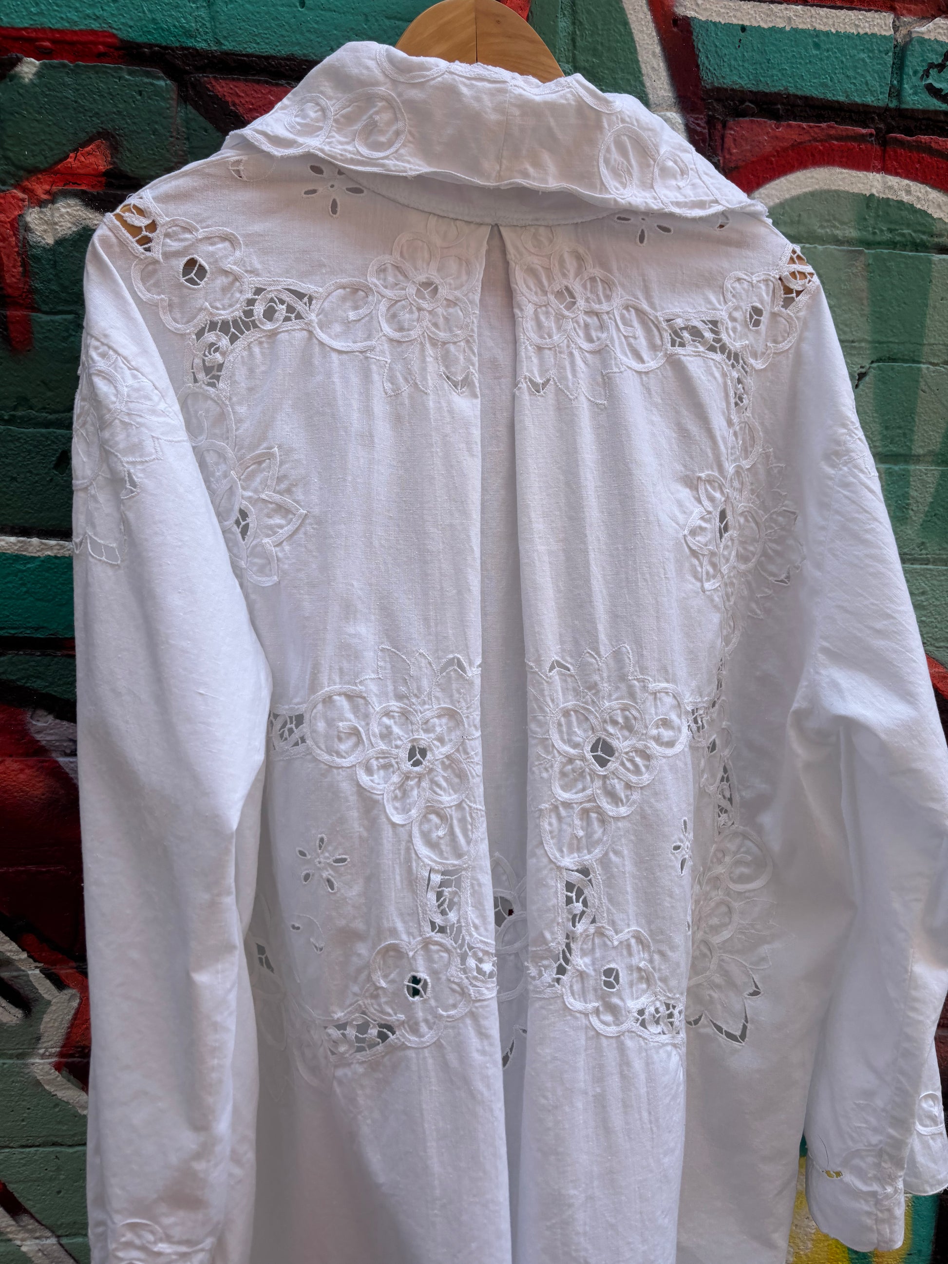 Crisp cotton upcycled table cloth into a perfect piece for breezy summer nights. Also a light layer for running through a field in the sun.