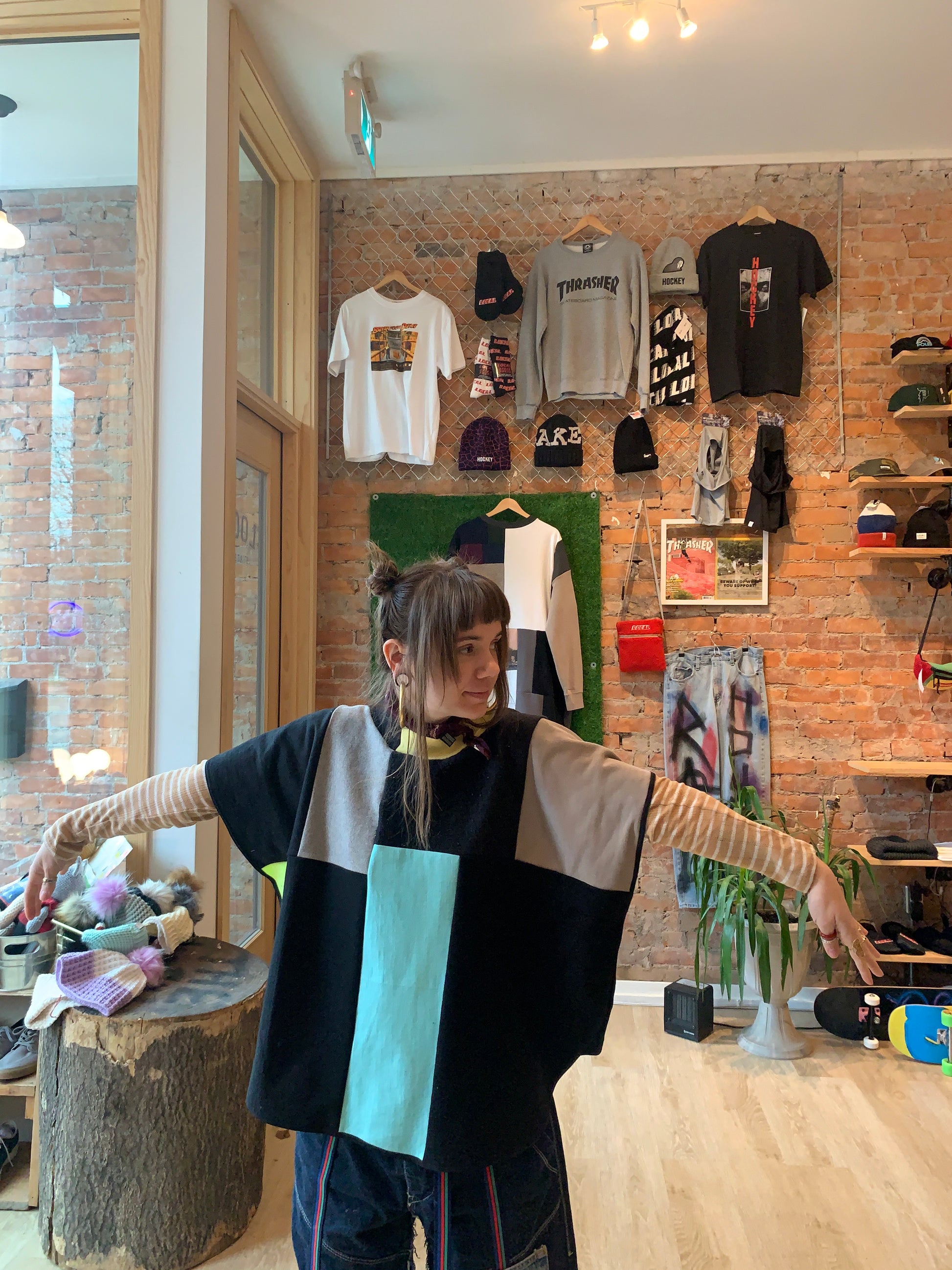 Up cycling knit materials in flow state. Stitched together by ASHES.