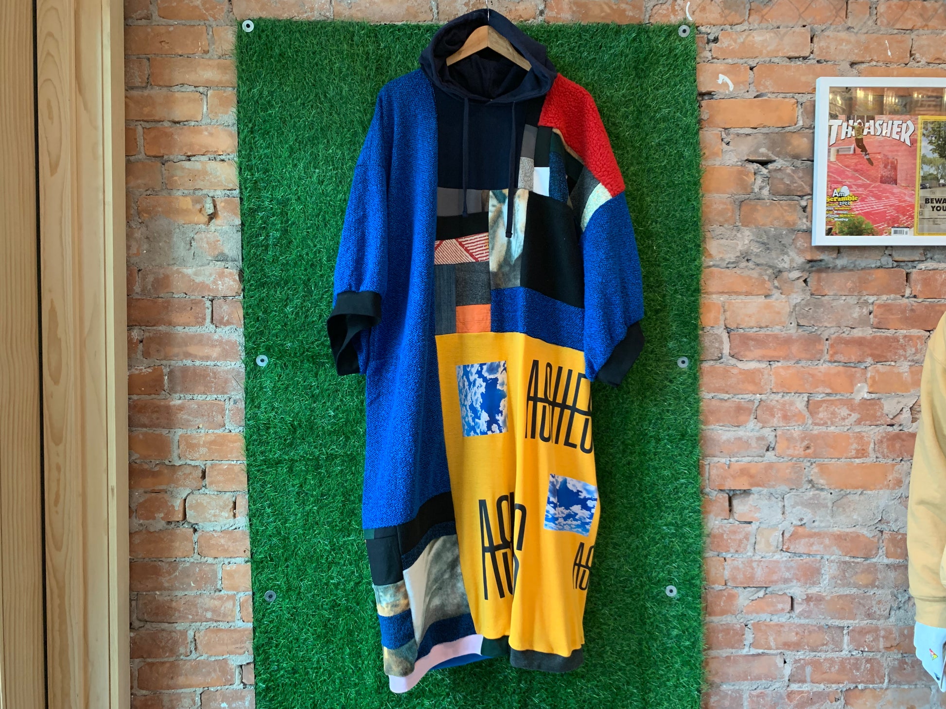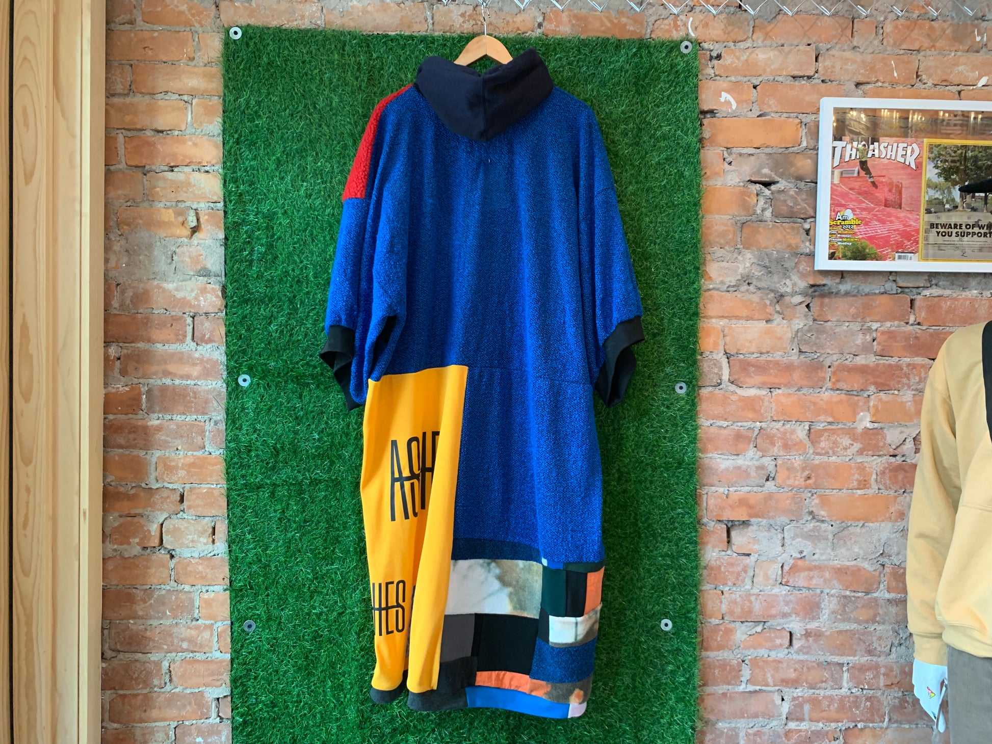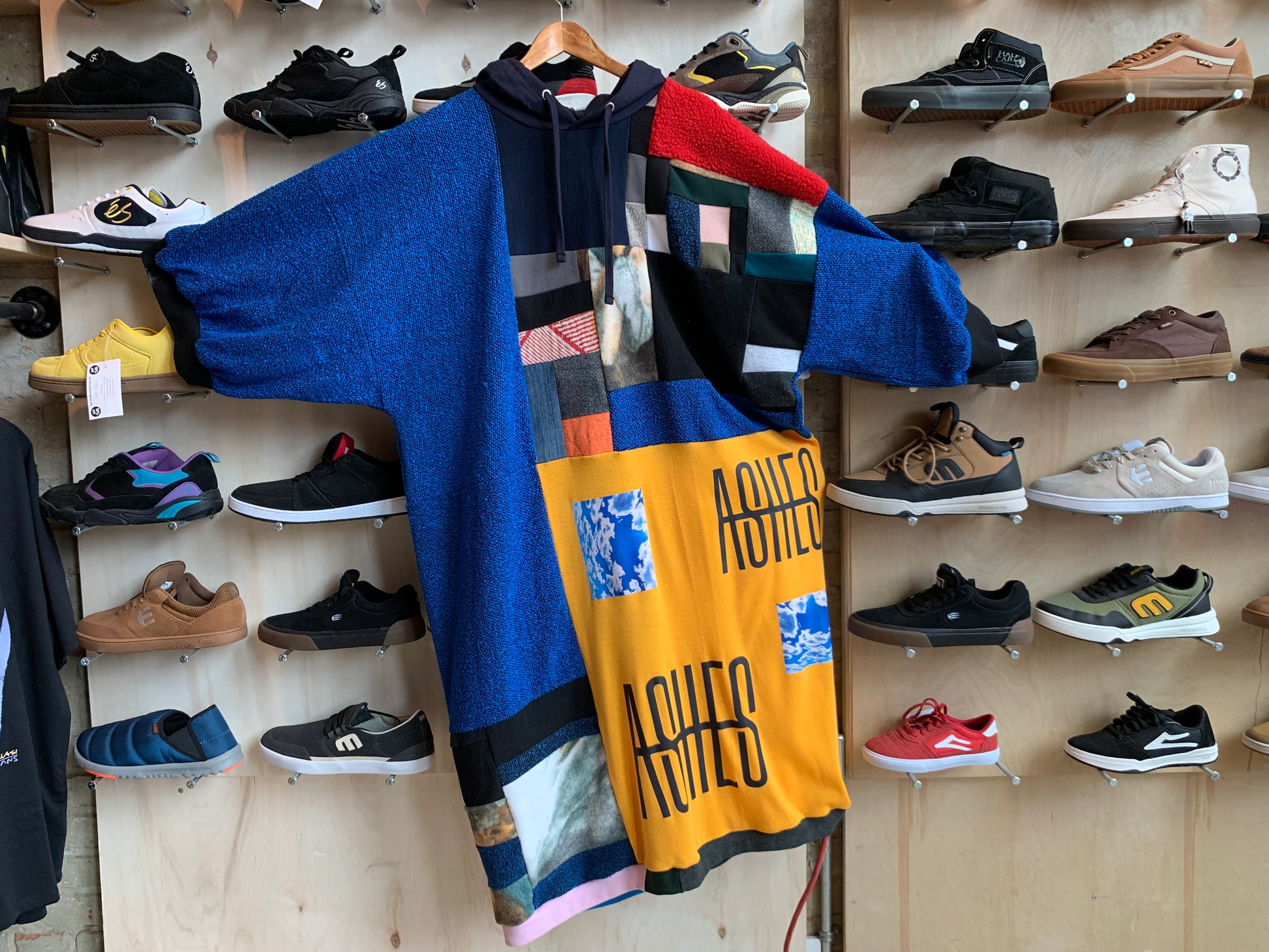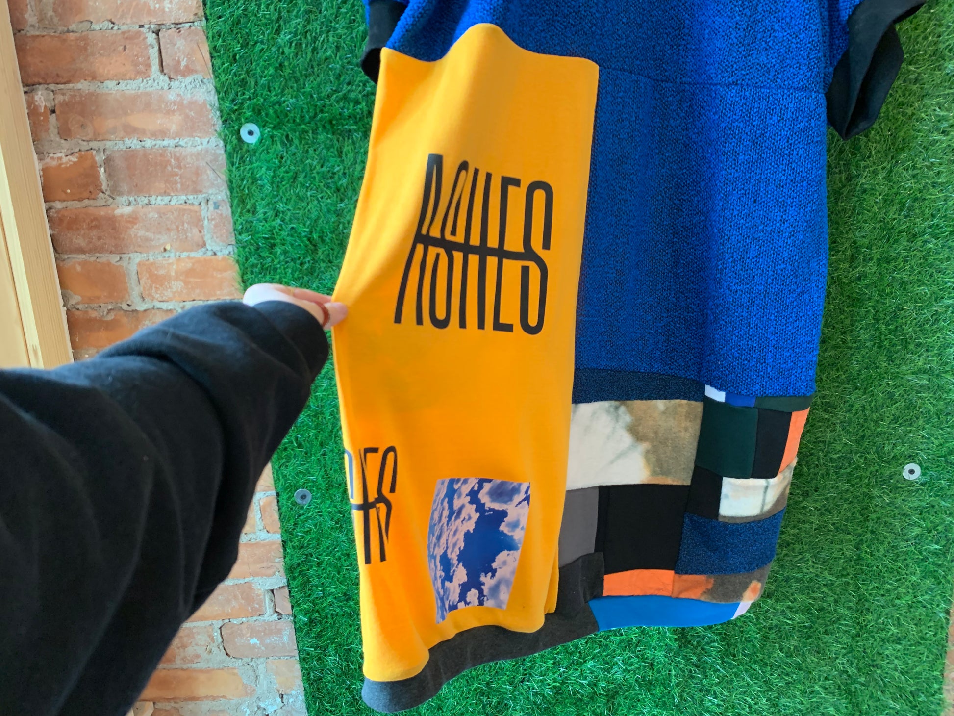 Rescued and upcycled knit textiles stitched together by ASHES. A mix of sweater and lighter weight knits. (Polyester and cotton mix)