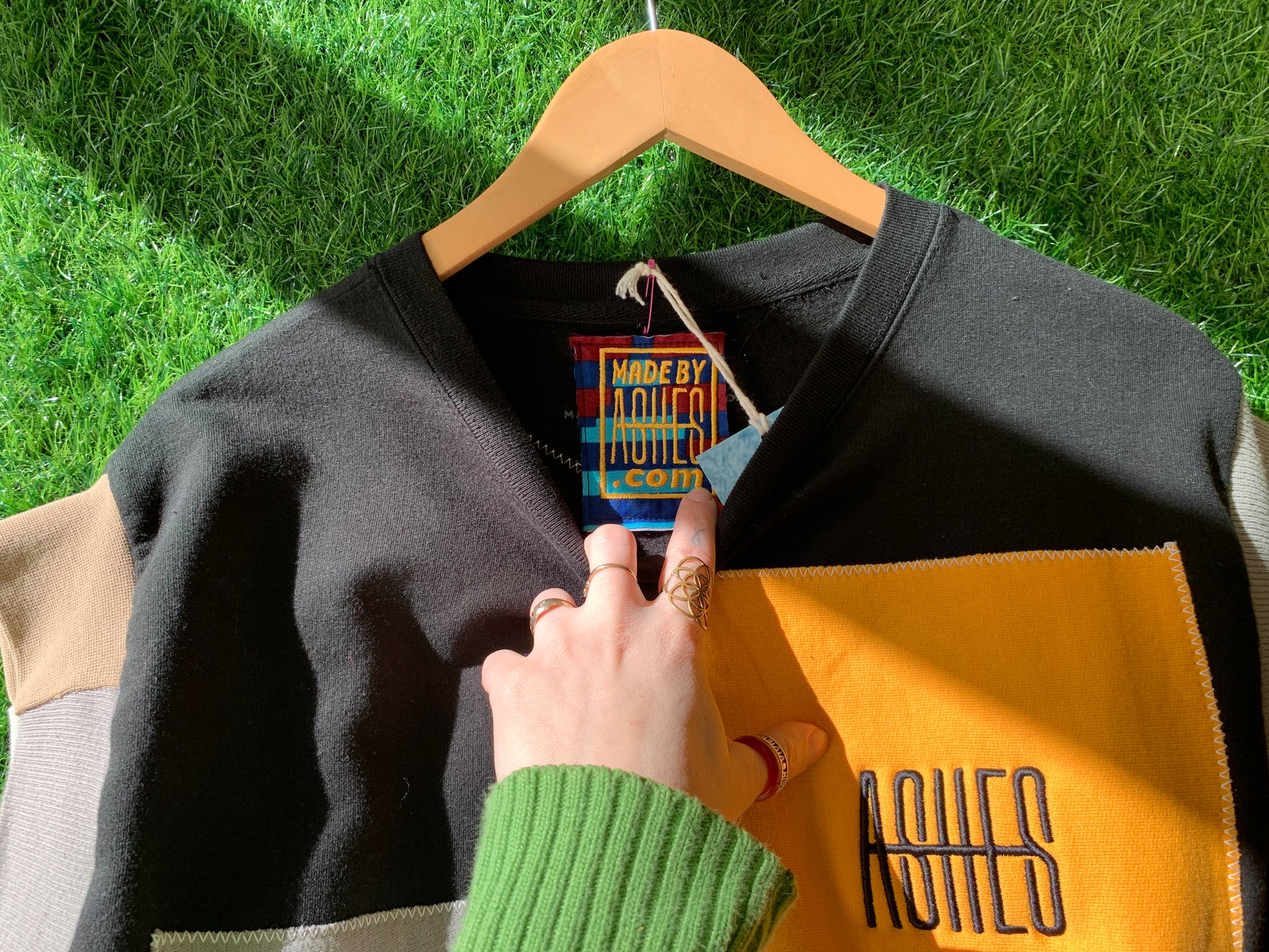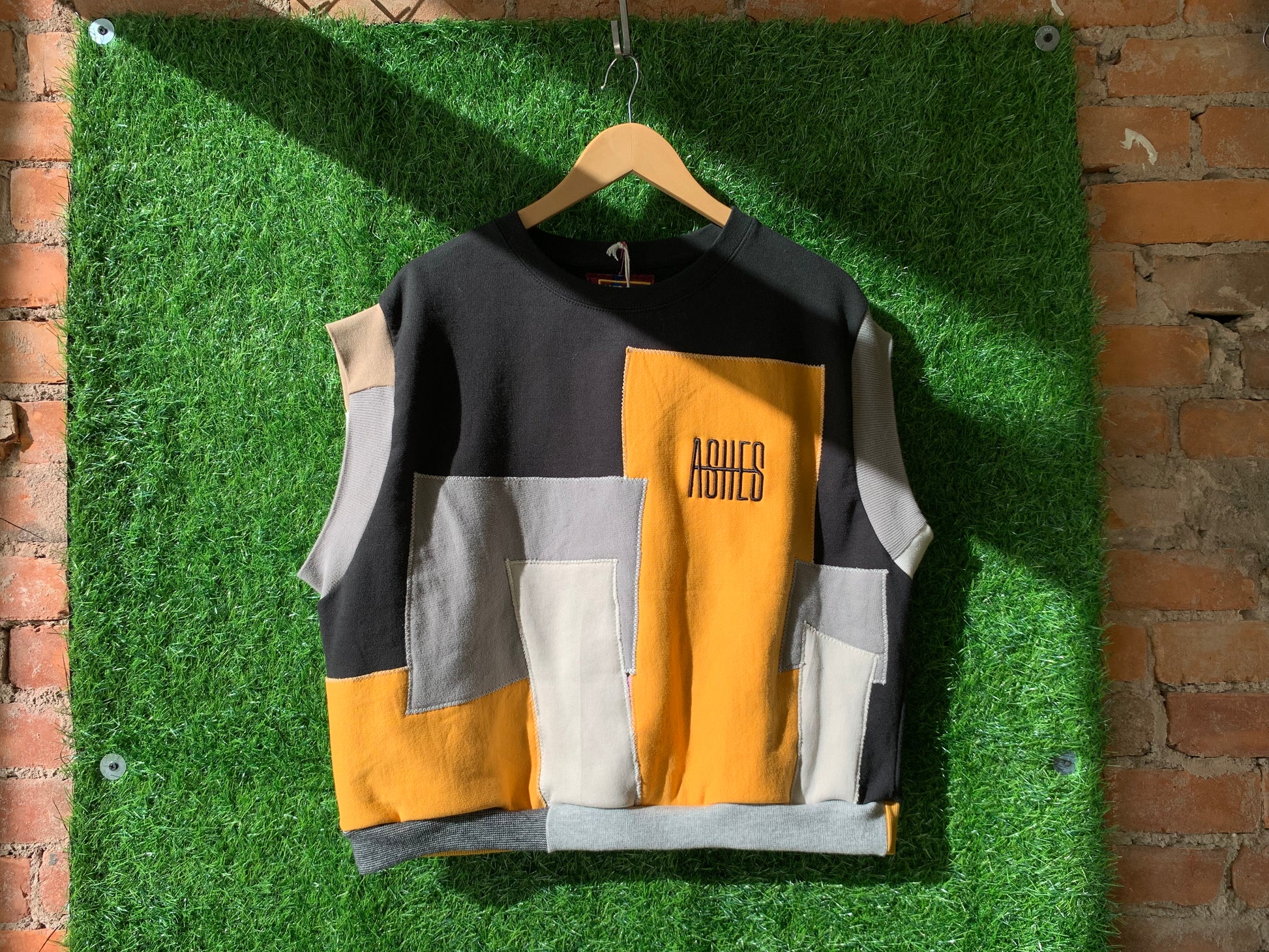 Rescued and upcycled knit textiles stitched together by ASHES