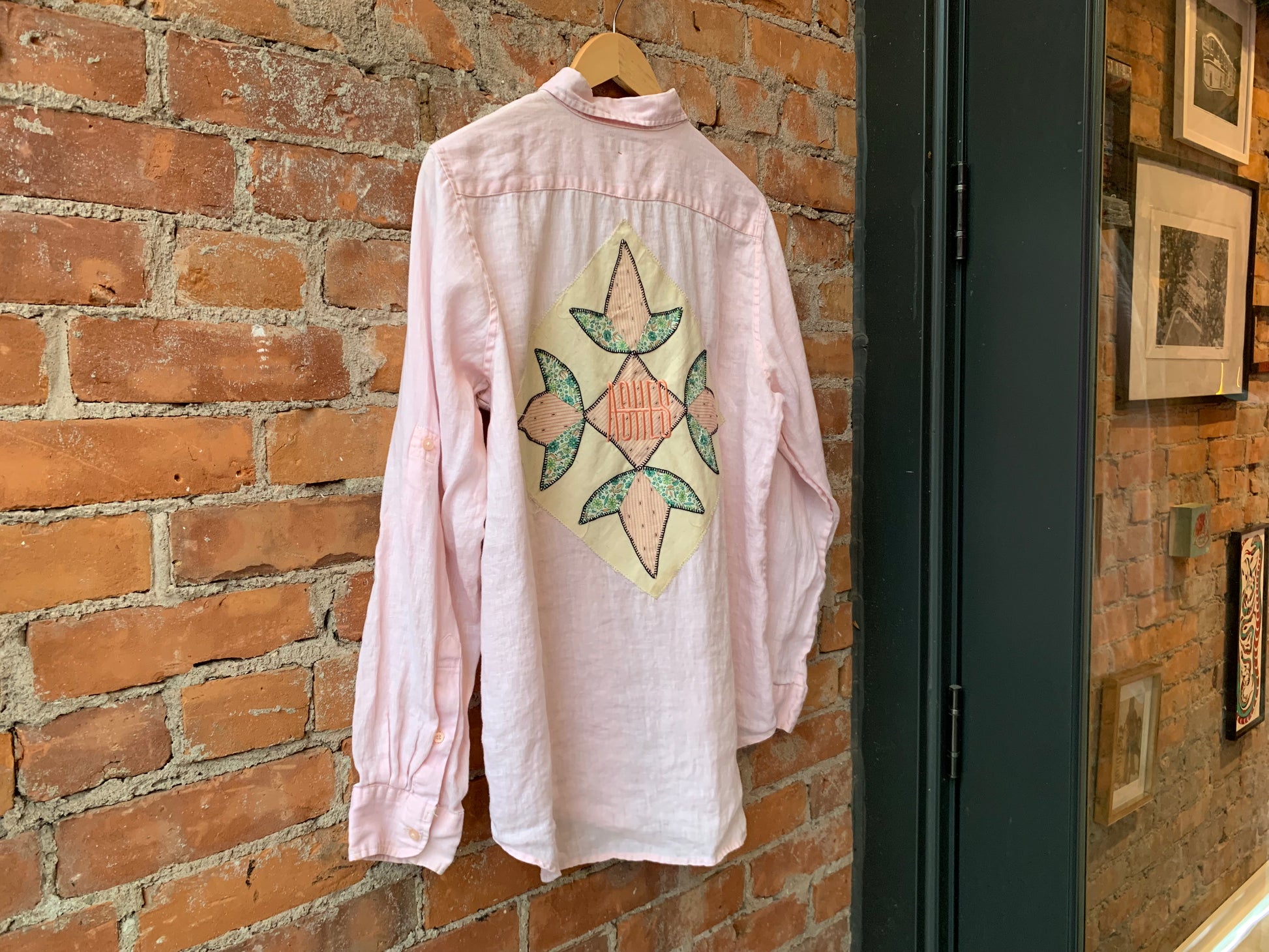 UPCYCLED Ralph Lauren cotton shirt. Dyed by Ash in a lovely pastel pink shade. Vintage hand stitched quilt square on back with ASHES embroidery.