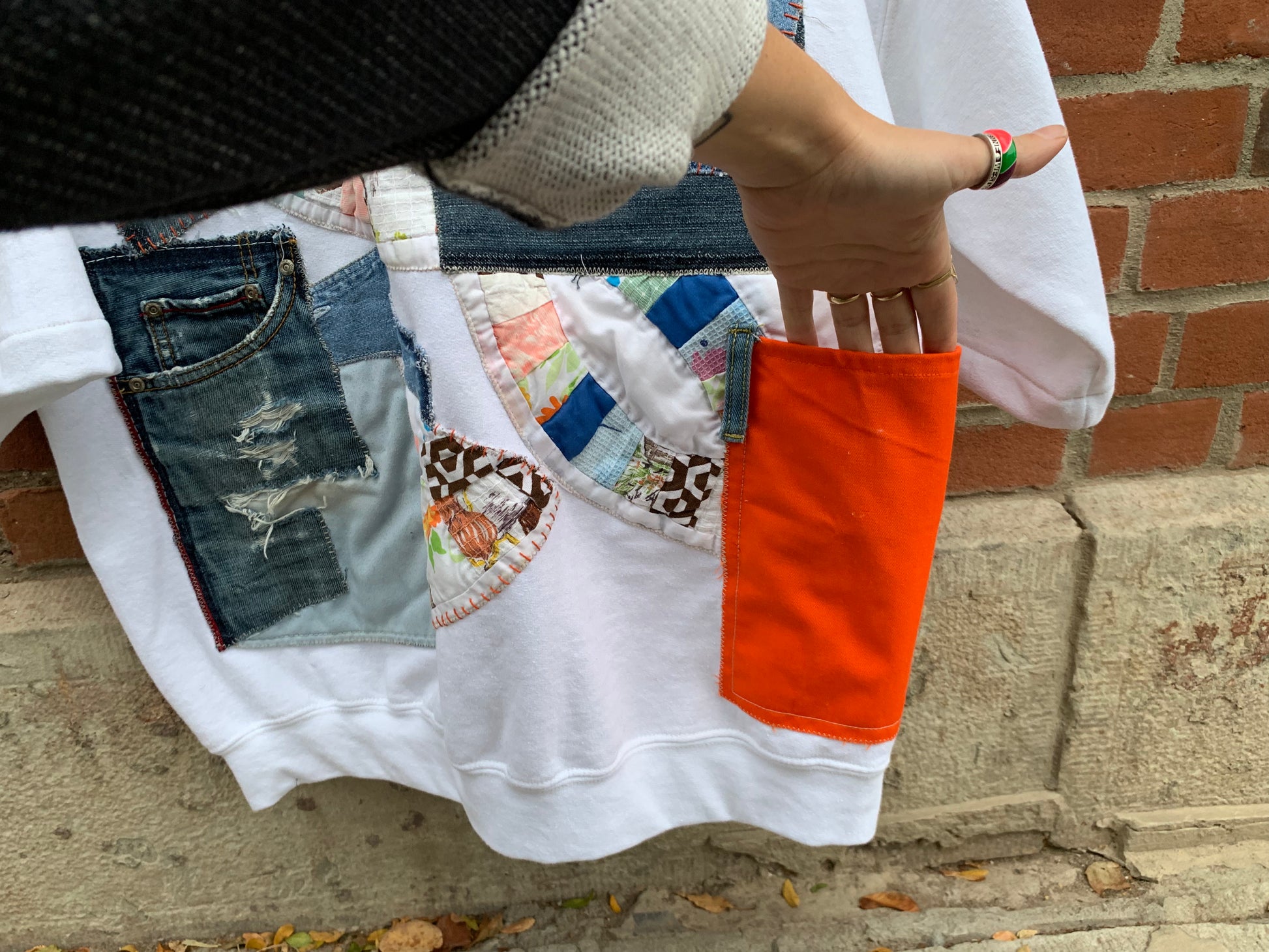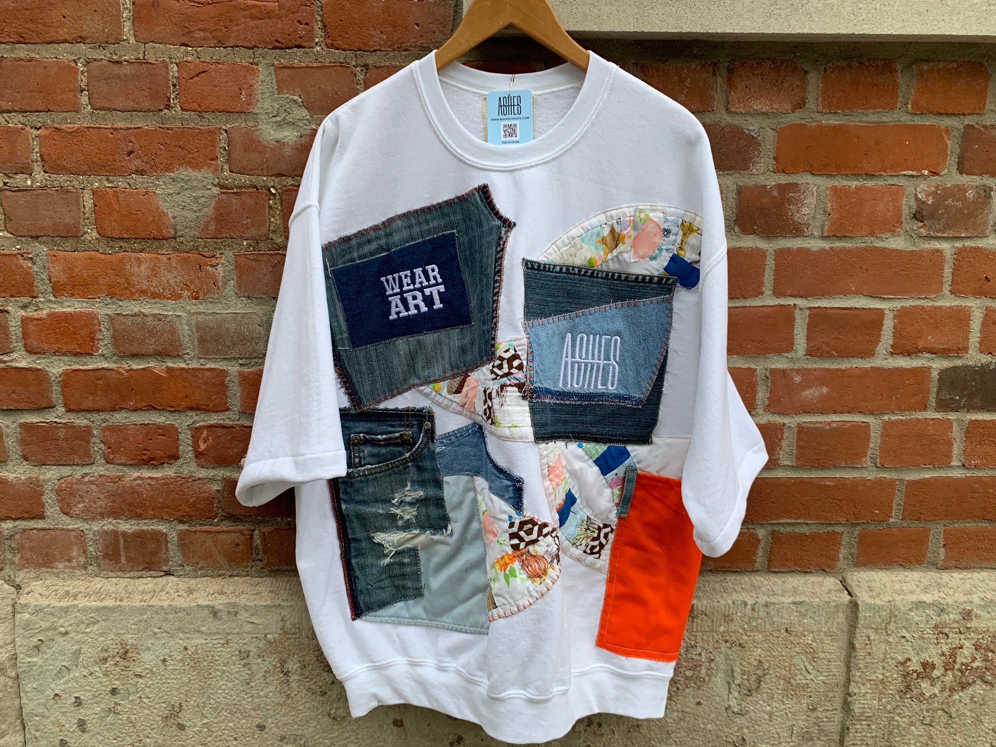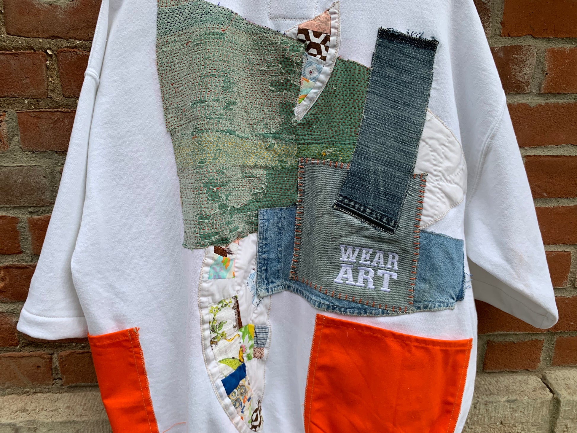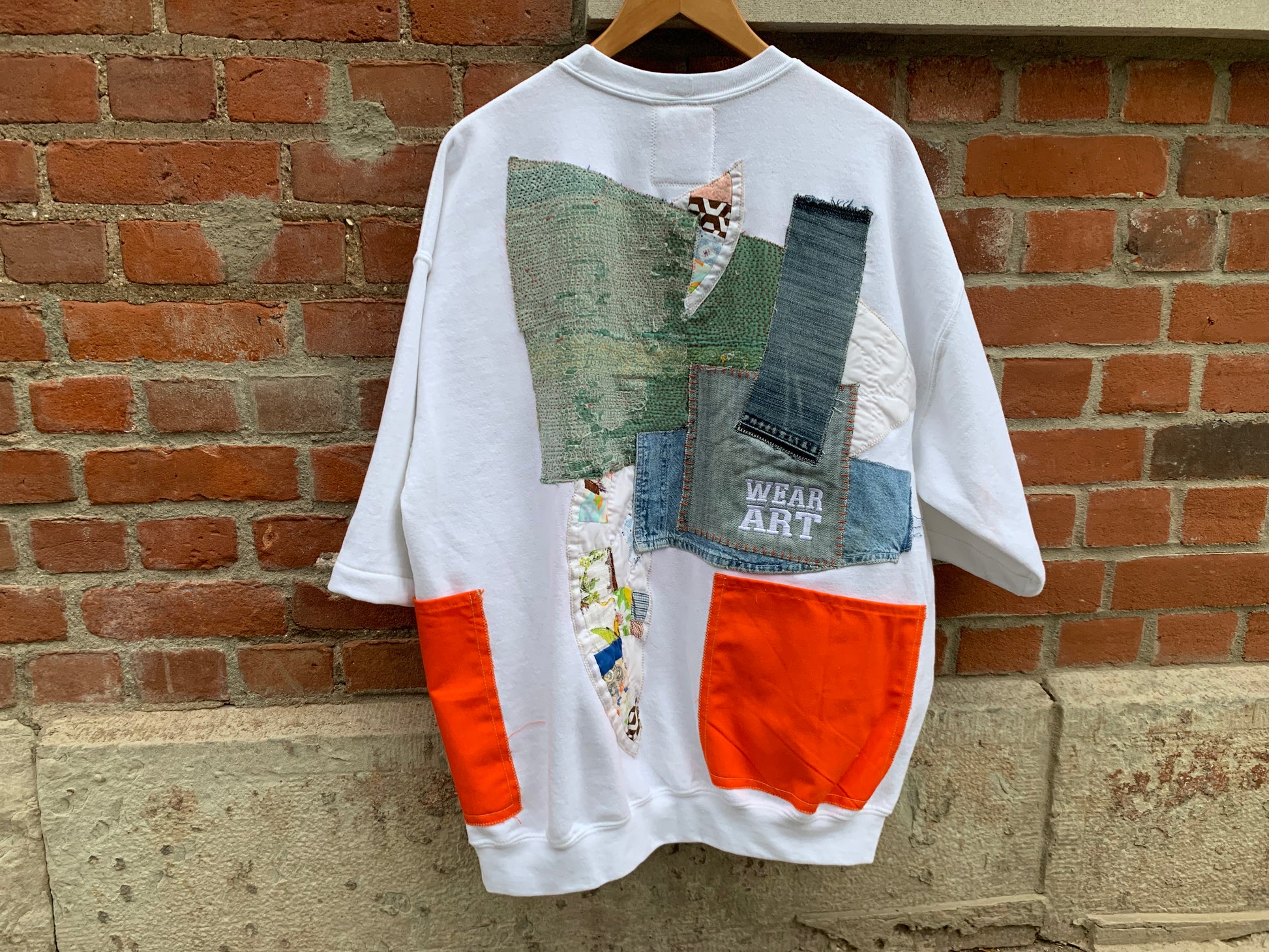 A COMBINATION OF DENIM , QUILTS AND UTILITY ORANGE WORKWEAR. Patchworked onto a short sleeve crew neck. Cozy final layer for a unique outfit.